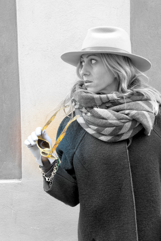 Discreta quanto basta con i toni della foresta verde. Dal cappotto dalla linea anni’50 in lana cotta doppiato con neoprene grigio a contrasto, ad una Kefia madras in pura lana. Aggiungete dettagli candidi come un cappello da uomo e un bracciale très chic. Dulcis in fundo spruzzatevi i tocchi pitonati di un paio di occhiali da sole anaconda gold di Incredible Glasses. Occhiali leggeri, confortevoli (made in Italy 100%) e flessibili, si piegano senza deformarsi, elastici e solidi grazie all’utilizzo di materiali plastici innovativi. Occhiali variopinti non sono mai stati così trendy, ravvivano tutti i look e fanno più bella la città! Anzi vi sembrerà di passeggiare per Chicago!