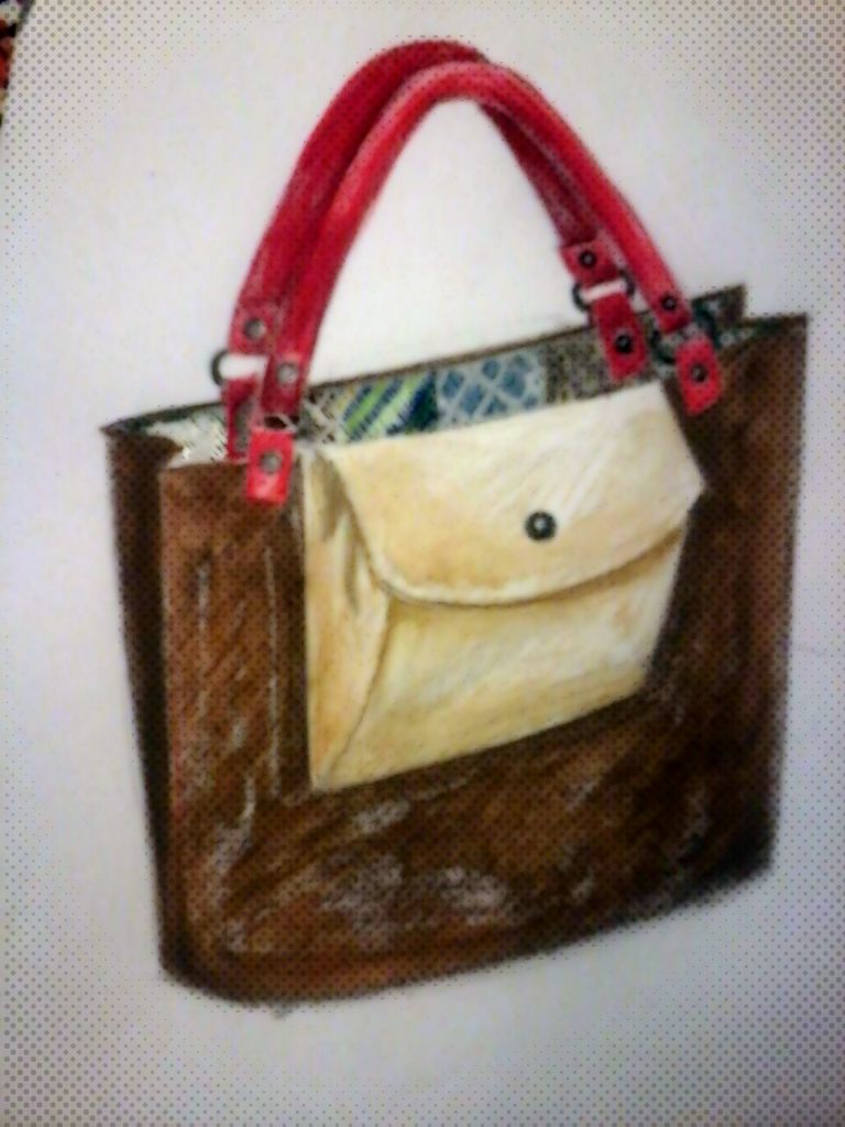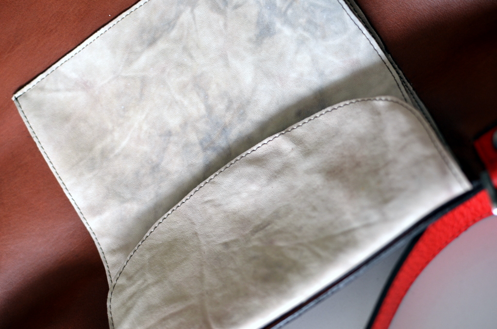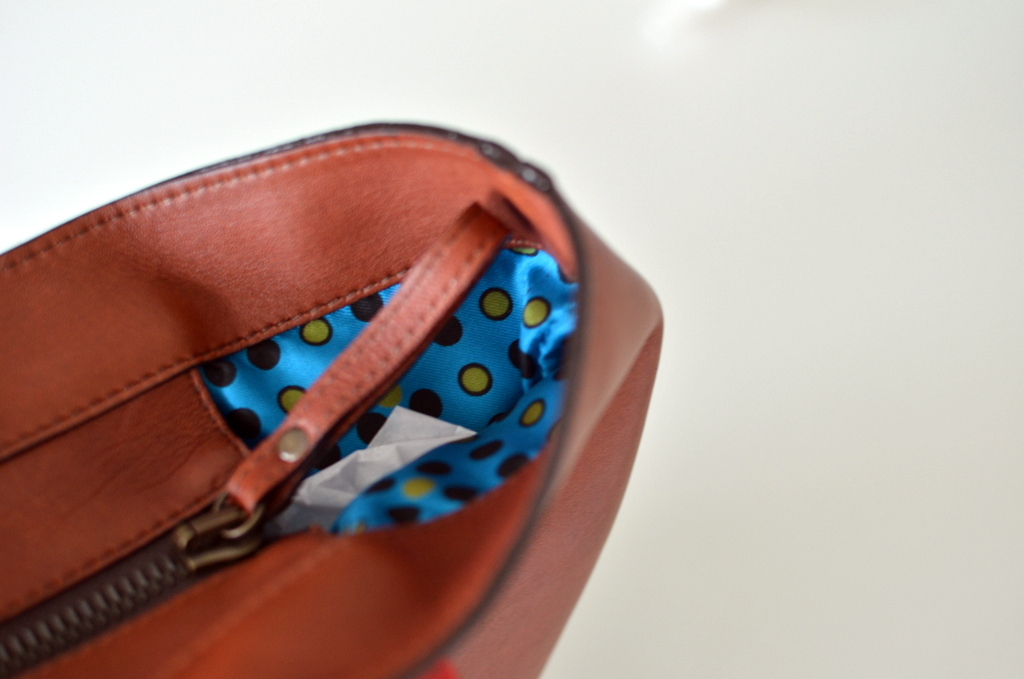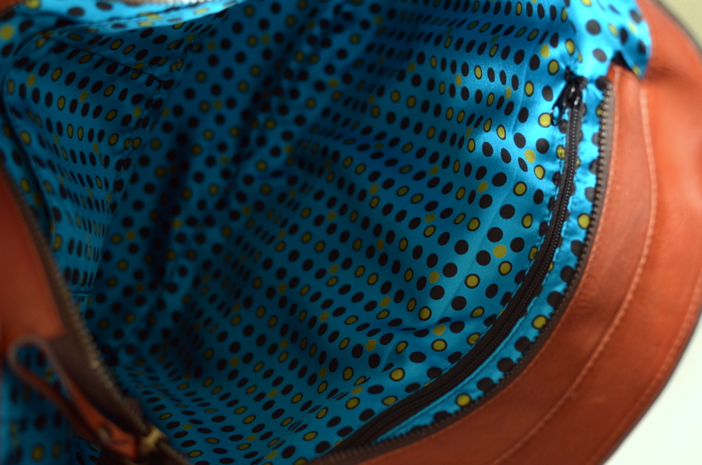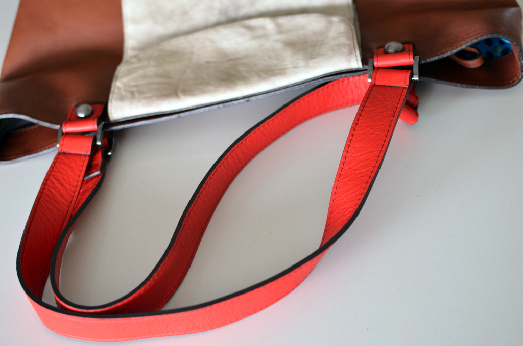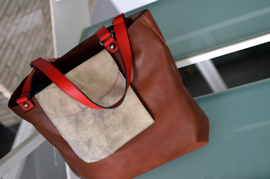 Che borse usava la Dama dell’Impero? Da una serie di foto dell’epoca ho scoperto una mini shopper bag da cui ho ricavato una borsa abbastanza capiente per contenere tracce di mistero, in pelle lavata con effetto sporcato per la tasca esterna, in morbida pelle marrone, interno di seta vintage e manici rossi.