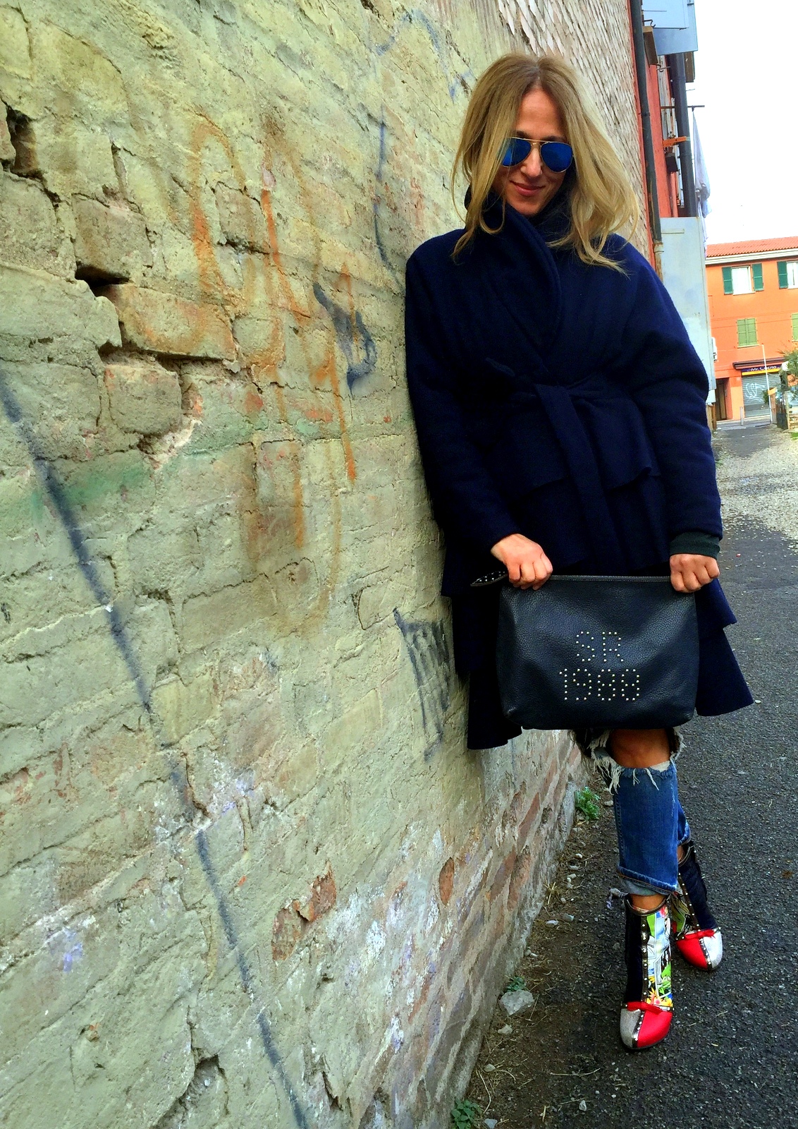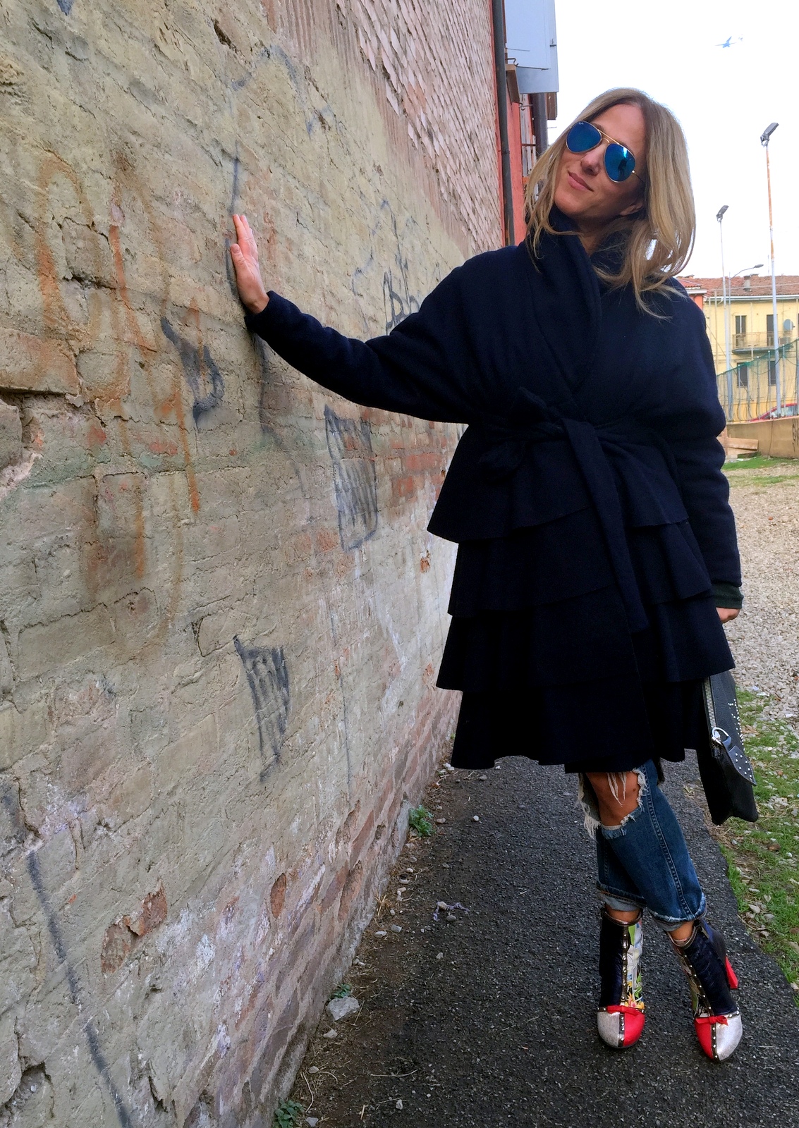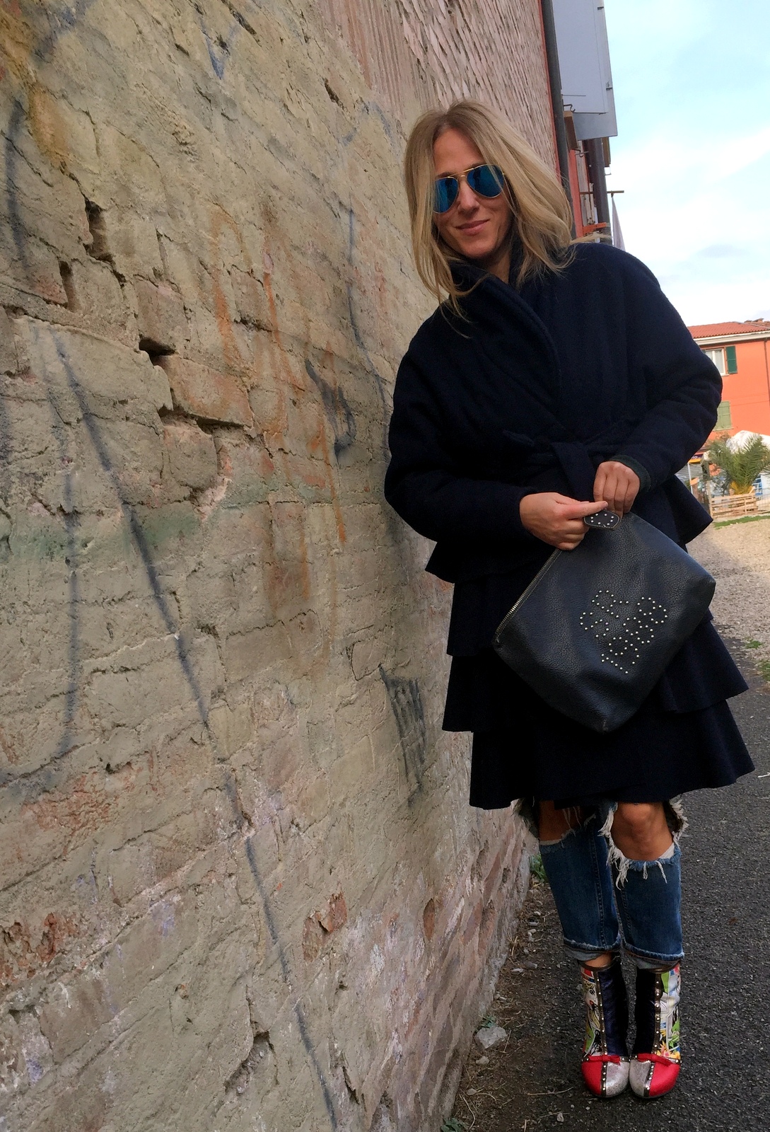 La quotidianità è un coltello che taglia a fette il tempo e quando te ne rendi conto ti accorgi che non ne hai mai abbastanza per tutti, soprattutto per le persone che ti sono più vicine. E così almeno una volta al mese, io e mio marito ci obblighiamo a stare un po’ da soli, affidando i bimbi al nonno. Una bella domenica di relax a passeggio per Bologna. Scelgo un look eccentrico e veloce. Jeans rotti, una canotta in paiellettes (che non si vede) e un cappotto stilisticamente molto intelligente, si, perché sembra un abito!!!!