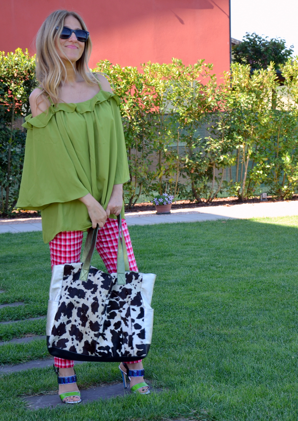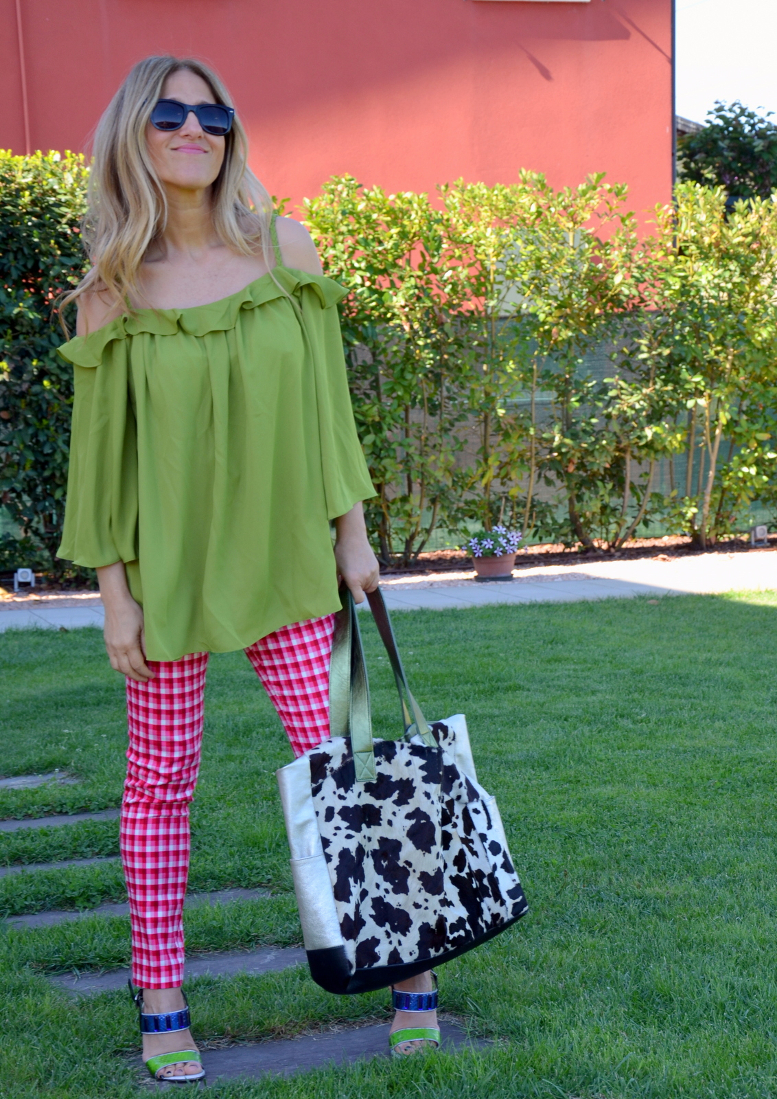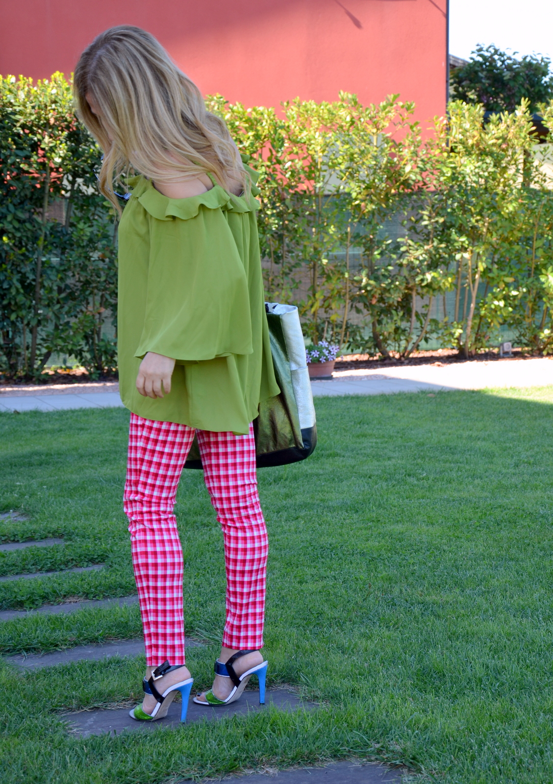 Ho scelto un look che fosse ironico, dinamico e intraprendente. Un movimento “con i piedi nella terra” e le balze verdi sul seno che ondeggiano leggere con il vento che soffia delicato. Un pantalone skinny dal colore goloso dedicato al vichy, per un contrasto spiritoso e giocoso. Anche oggi gioco a fare la diva completandomi con una shopper dall’aspetto maculato, vezzoso e ammiccante. Sono una sognatrice. Mercury of Love.