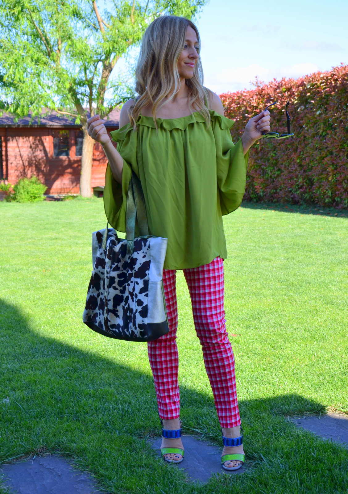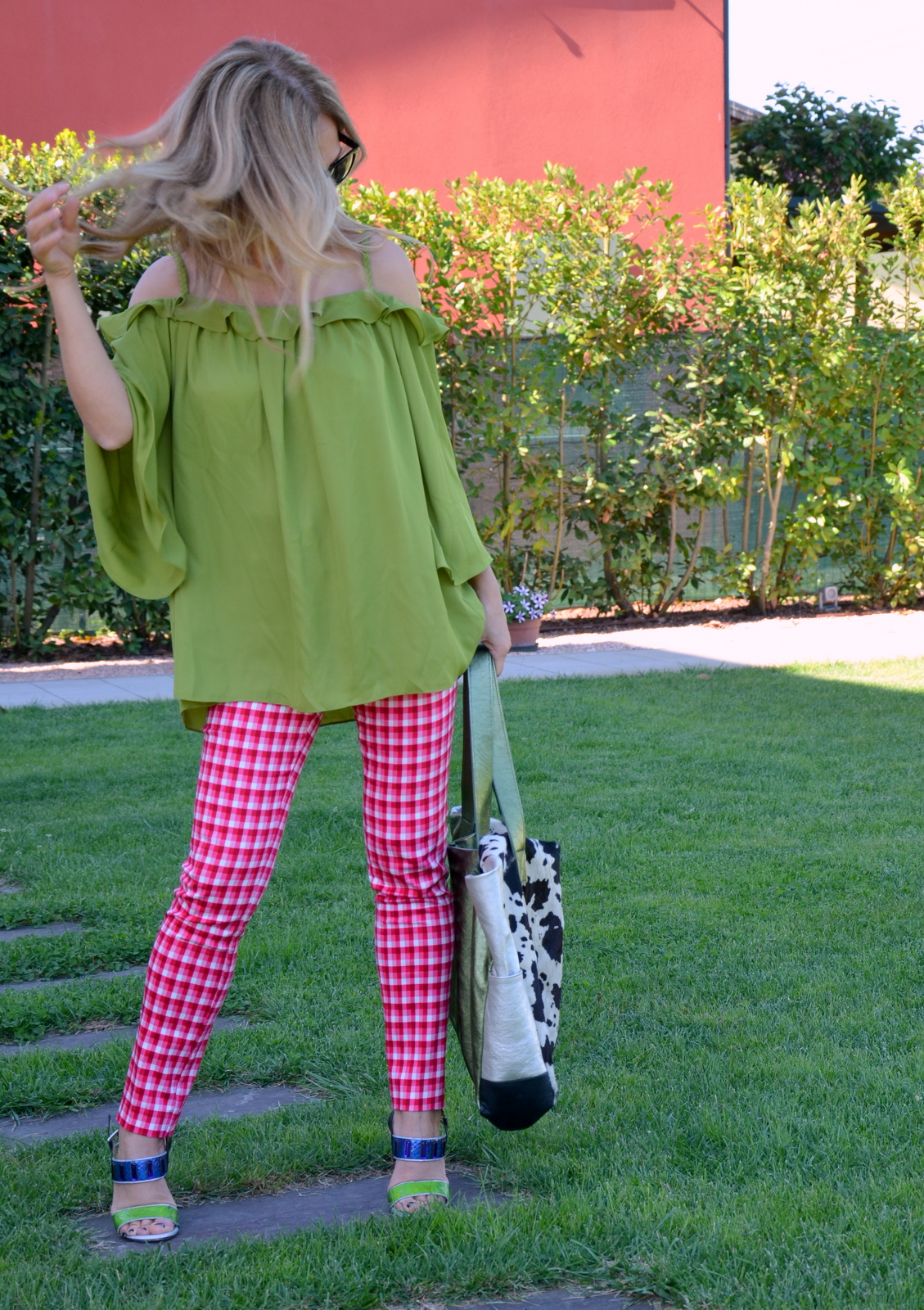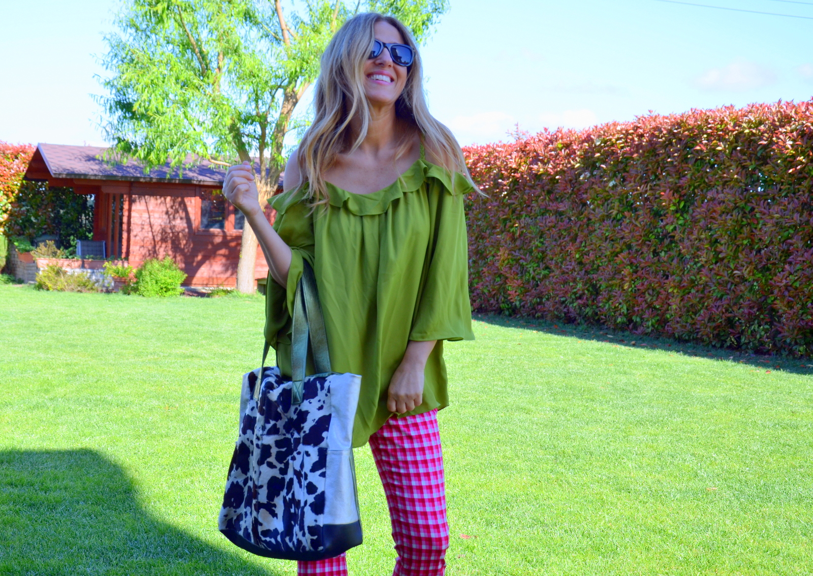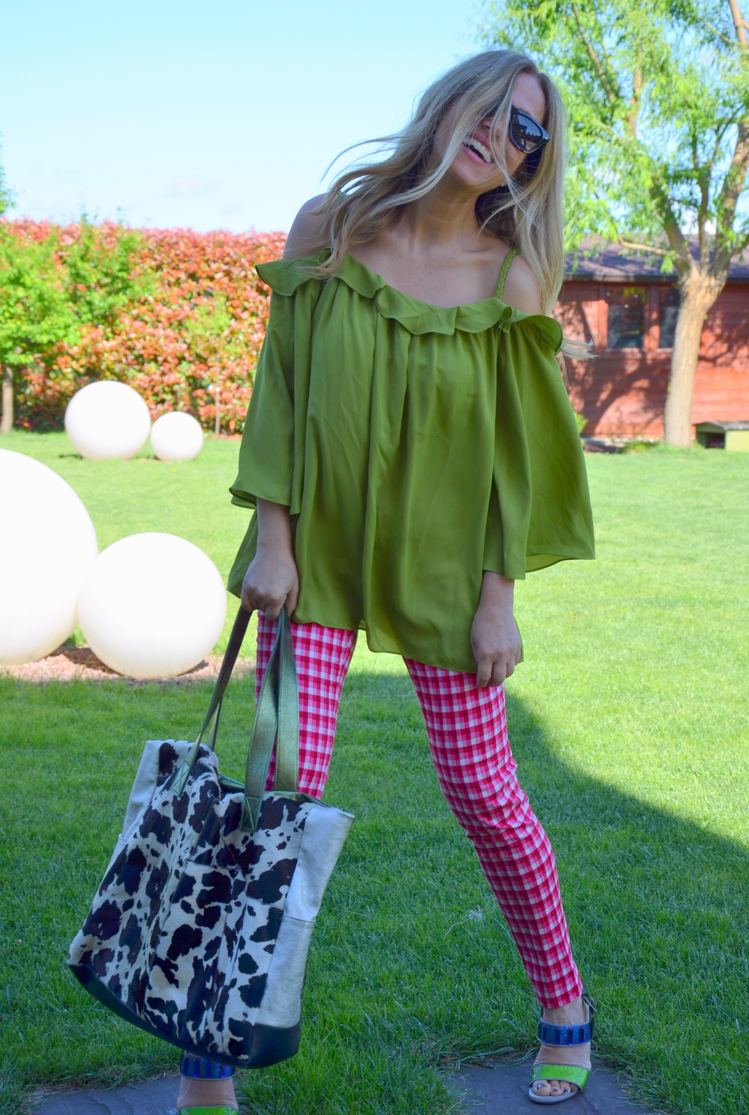 Ho scelto un look che fosse ironico, dinamico e intraprendente. Un movimento “con i piedi nella terra” e le balze verdi sul seno che ondeggiano leggere con il vento che soffia delicato. Un pantalone skinny dal colore goloso dedicato al vichy, per un contrasto spiritoso e giocoso. Anche oggi gioco a fare la diva completandomi con una shopper dall’aspetto maculato, vezzoso e ammiccante. Sono una sognatrice. Mercury of Love.