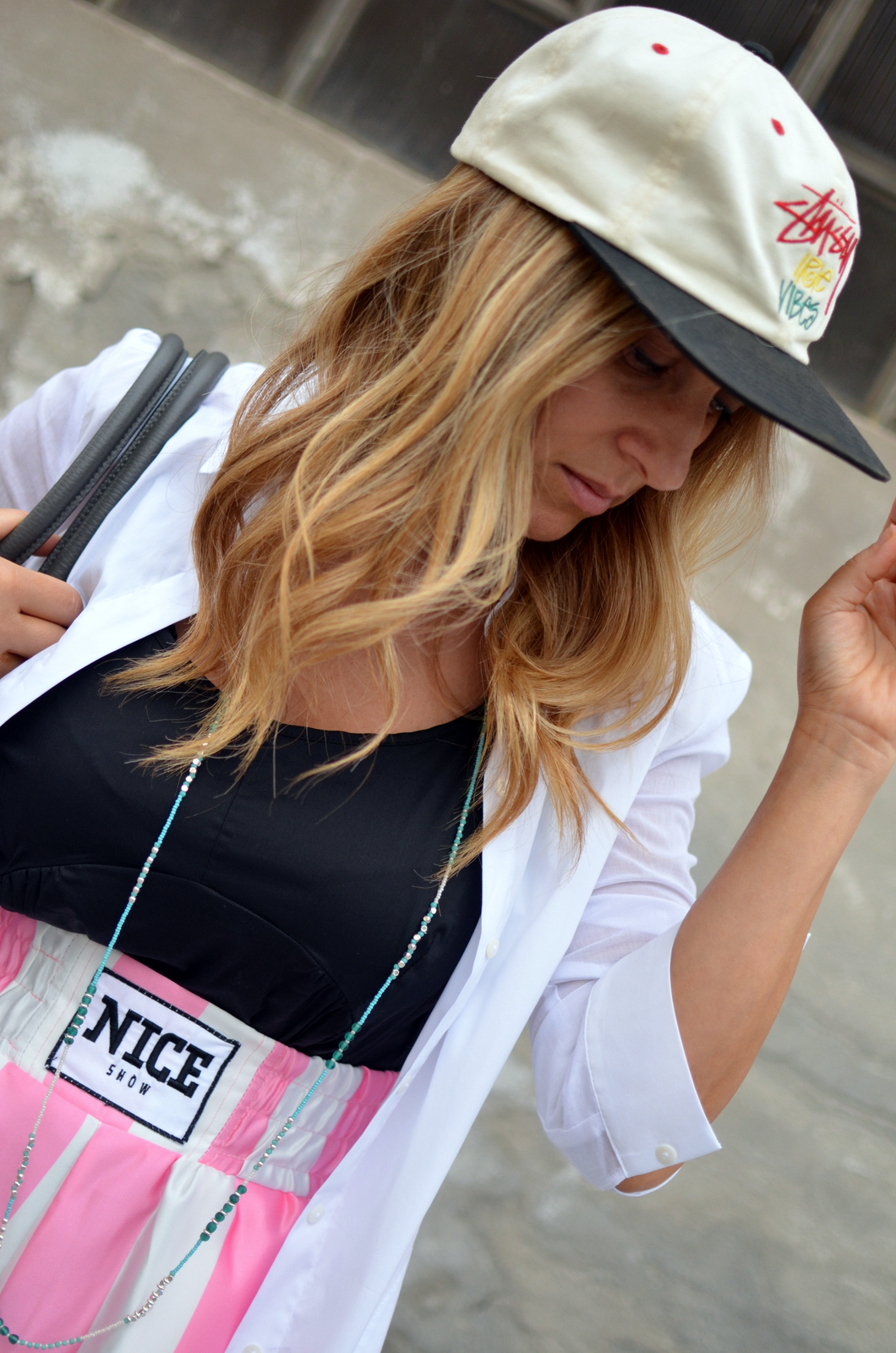 Il mio look di oggi è sporty con bermude box a righe rosa, capo unico, trendy e particolare, in contrasto con un top nero e una camicia bianca over, per un look moderno e fuori dal comune. A impreziosire il tutto le mie decoltè #staymercury white pump e infine a spiccare i gioielli di Melissa. Buona giornata!