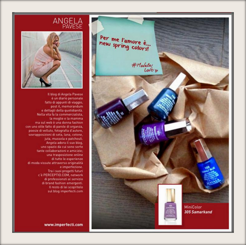 E oggi vi presento un angolo beauty con i nuovi smalti Spring colors di Mavala Italia. Ottima casa cosmetica che punta sulla qualità e con un prezzo competitivo. Mavala ha lanciato una intraprendente campagna di bellezza per San Valentino in occasione della quale ha realizzato un ebook con 11 blogger ognuna delle quali ha interpretato il mood di #mavalalove ecco qui potete scaricare il book e io sono a pagina 8. Vi piace?
