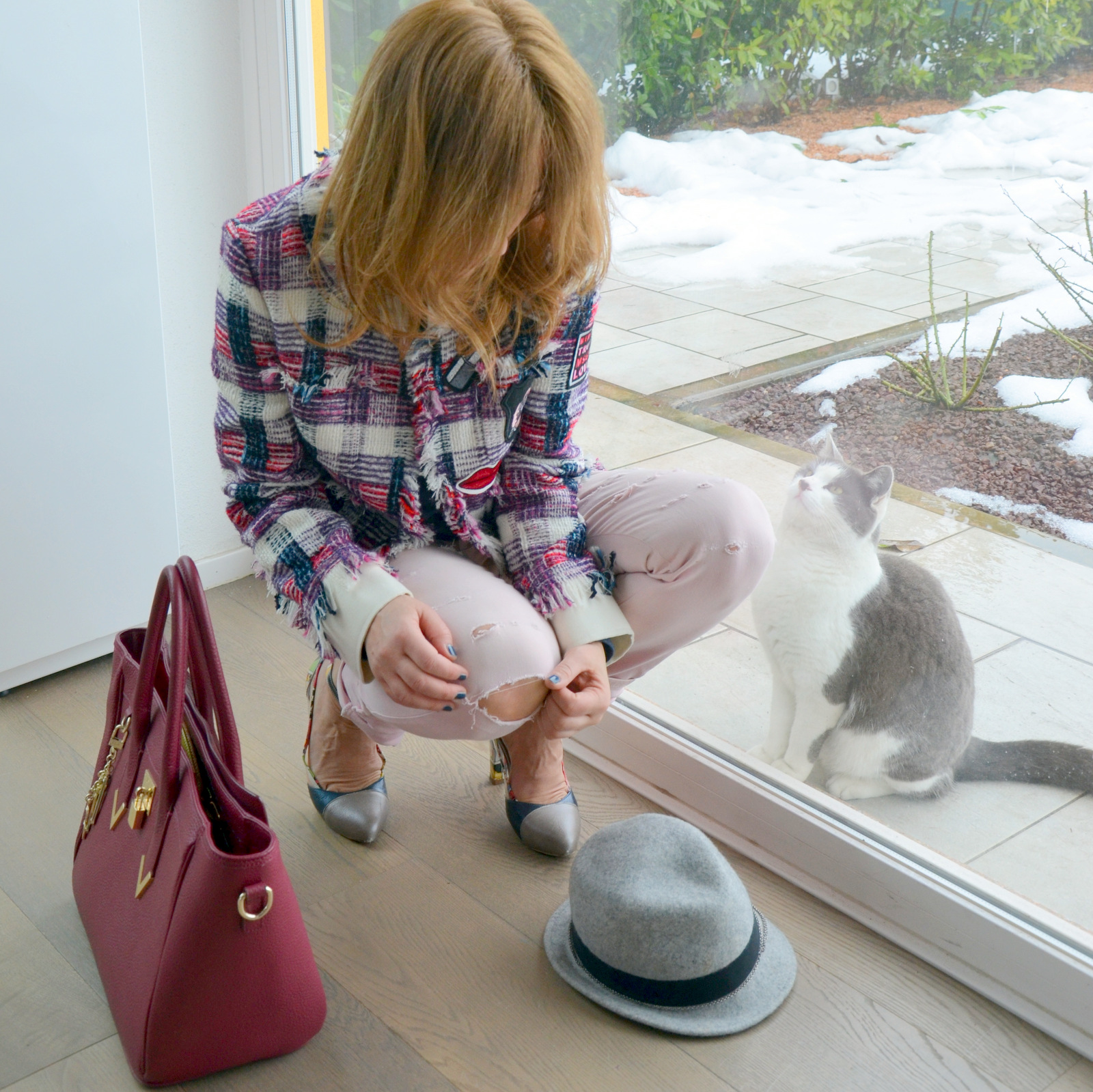That jacket is so gorgeous and original! You look amazing in those pretty pants too, dear! Epsecially enjoyed that back shot 🙂 Very cute kitty too! Kisses