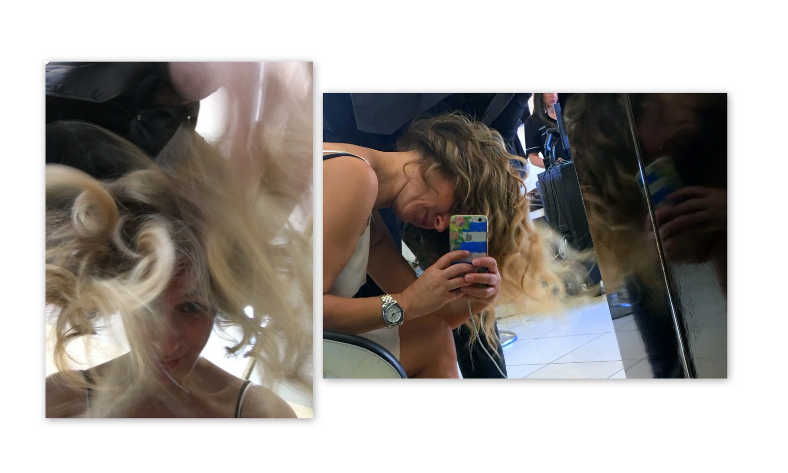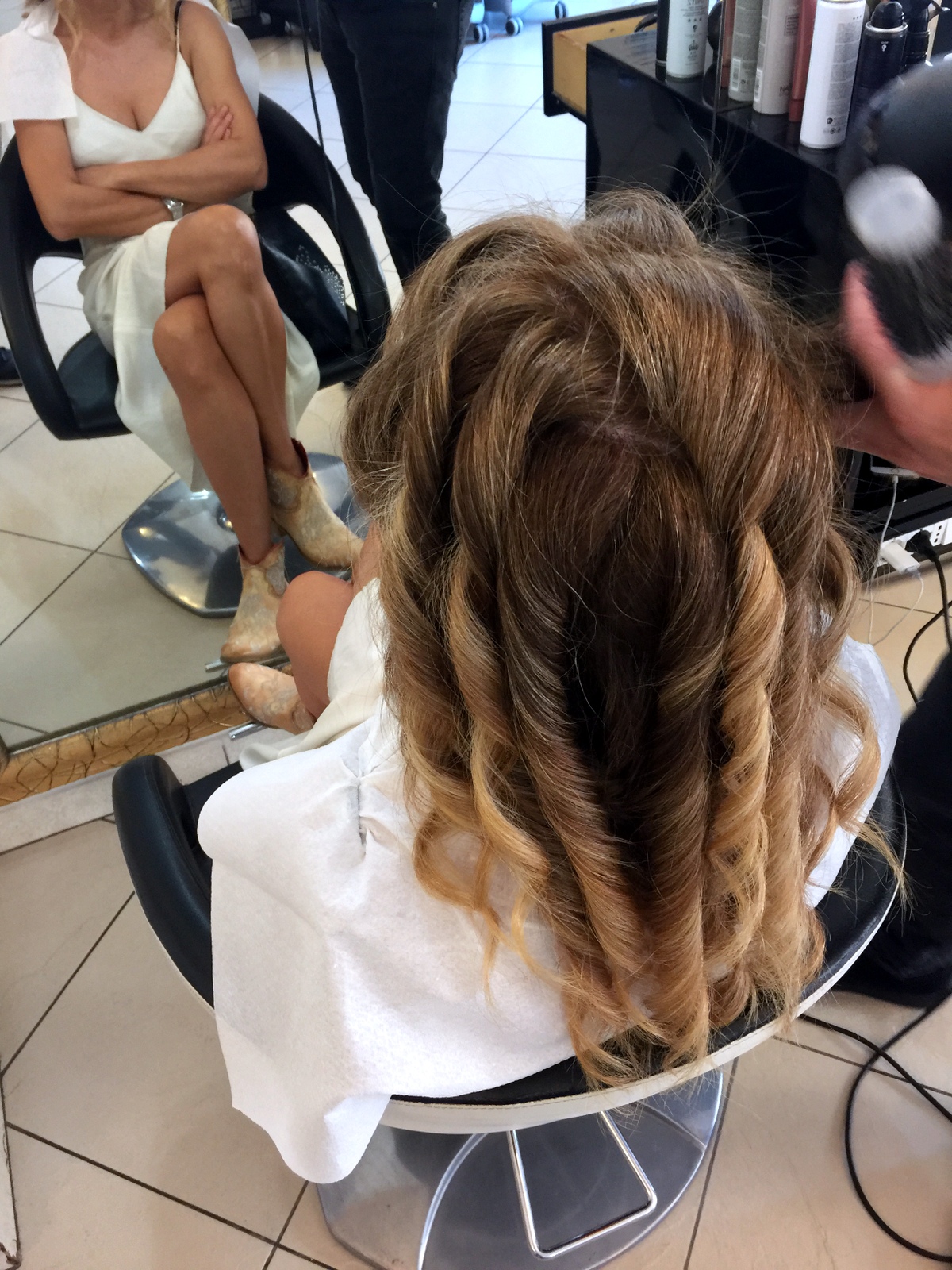 Dopo che il capello è stato opportunamente messo in piega e si sono formate esattamente le onde a spirale che vedete, le stesse vengono poi aperte a testa in giù. Successivamente su ogni ciocca viene applicato l’anticrespo. Per esempio a Palermo hanno usato l’olio di NashiArgan con una spruzzatina di anticrespo per un effetto luminoso e morbido, con le punte piene.