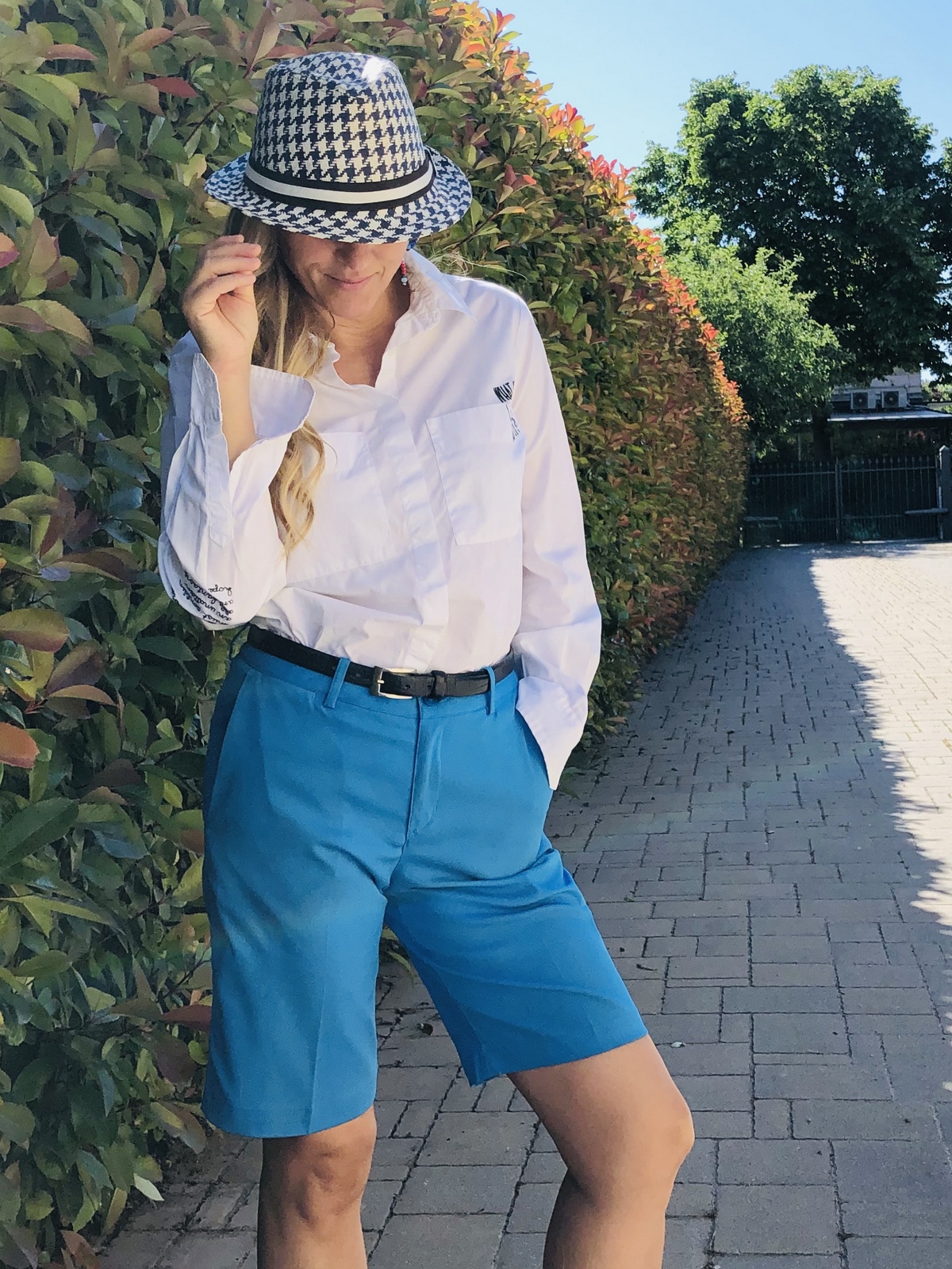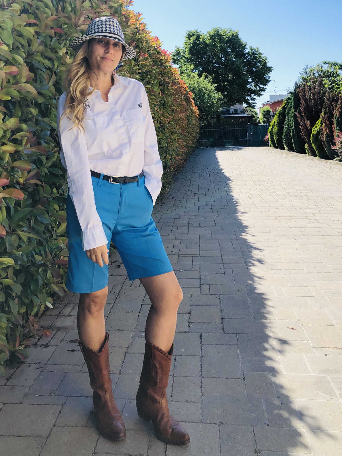 Oggi ho chiesto a mio figlio di scattarmi due foto. Erano mesi che non scattavo foto fashion. Allora vi descrivo brevemente cosa indosso: un bermuda blue, proprio di mio figlio, che lui non usa più, poiché gli sono piccoli. Anche la camicia gli apparteneva ed è passata nel mio armadio in maniera naturale. Il cappello, stessa fine, è suo e lo indosso io. Ahimè dite che sono brava a riciclare?
