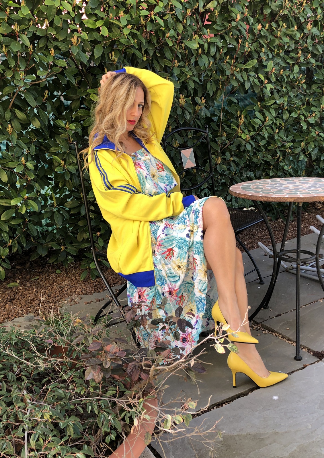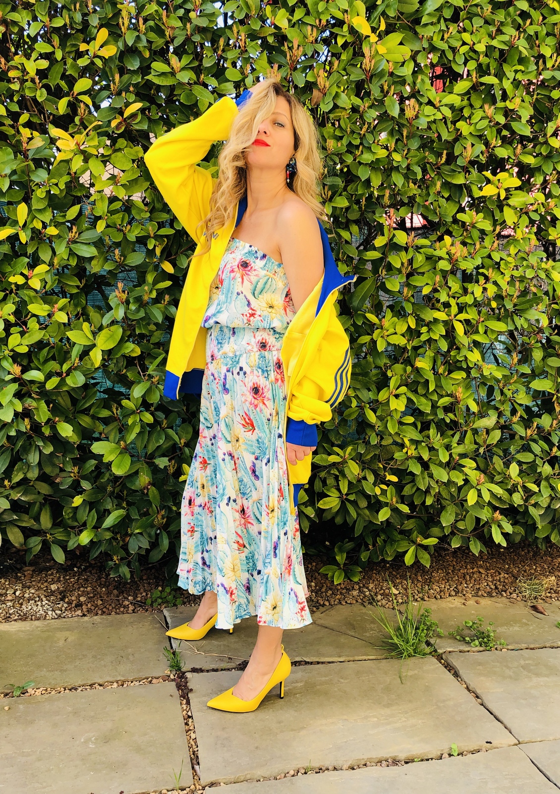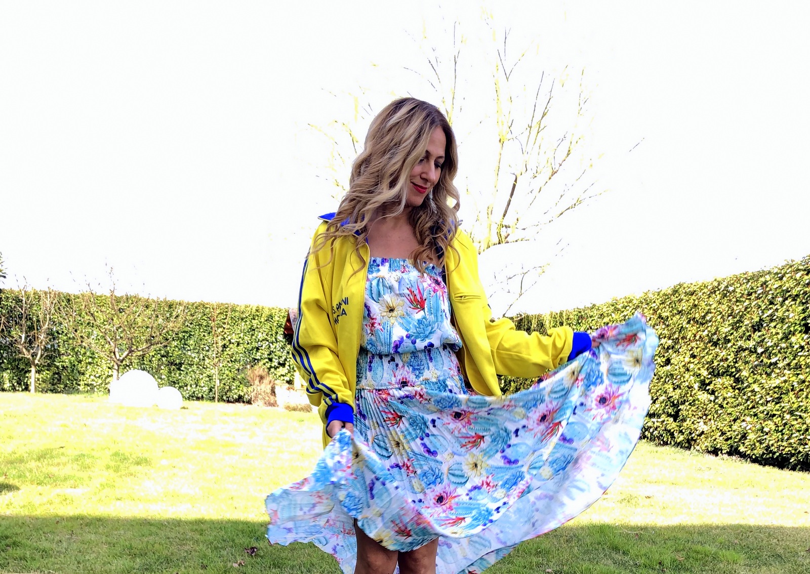 Today, I’ve strongly wanted to combine the Country Sporty floral dress with a vintage sports sweatshirt my husband used to wear when he played volleyball in the Panini team in the Italian Serie A and with a pair of basic décolleté 8-centimeters-heel yellow shoes Delicate and graceful, I liked myself very much today!