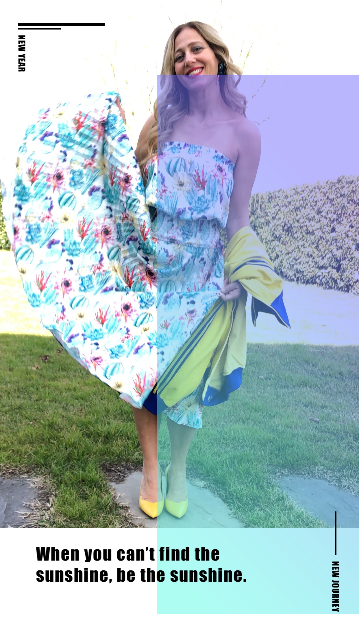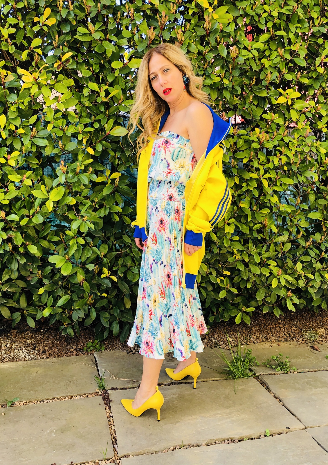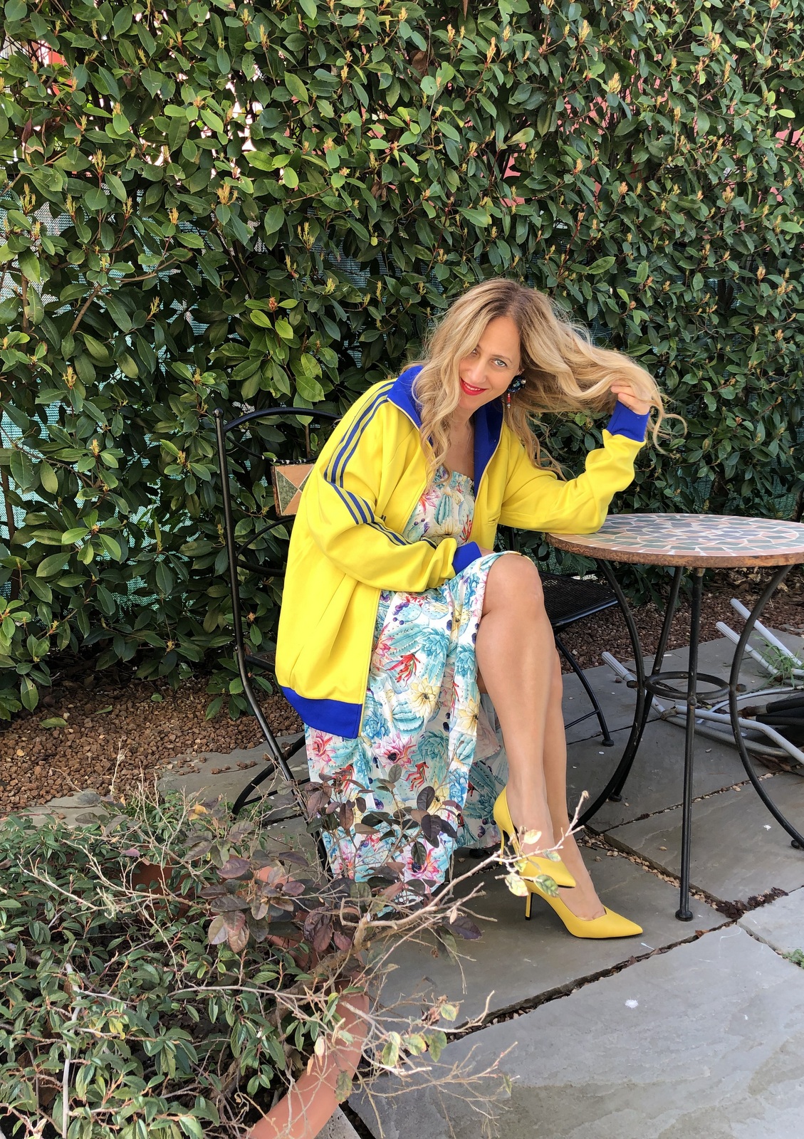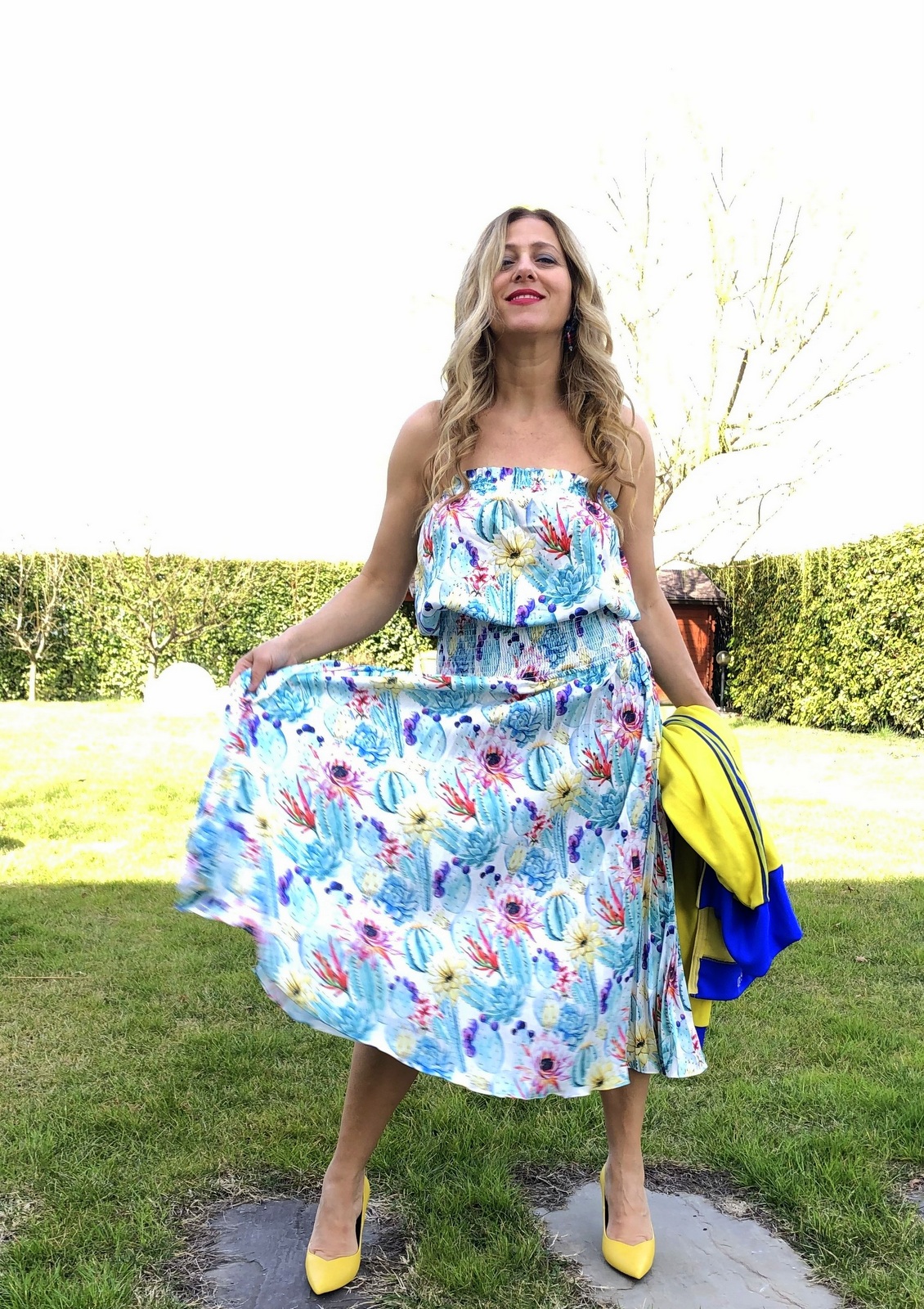 Today, I’ve strongly wanted to combine the Country Sporty floral dress with a vintage sports sweatshirt my husband used to wear when he played volleyball in the Panini team in the Italian Serie A and with a pair of basic décolleté 8-centimeters-heel yellow shoes Delicate and graceful, I liked myself very much today!