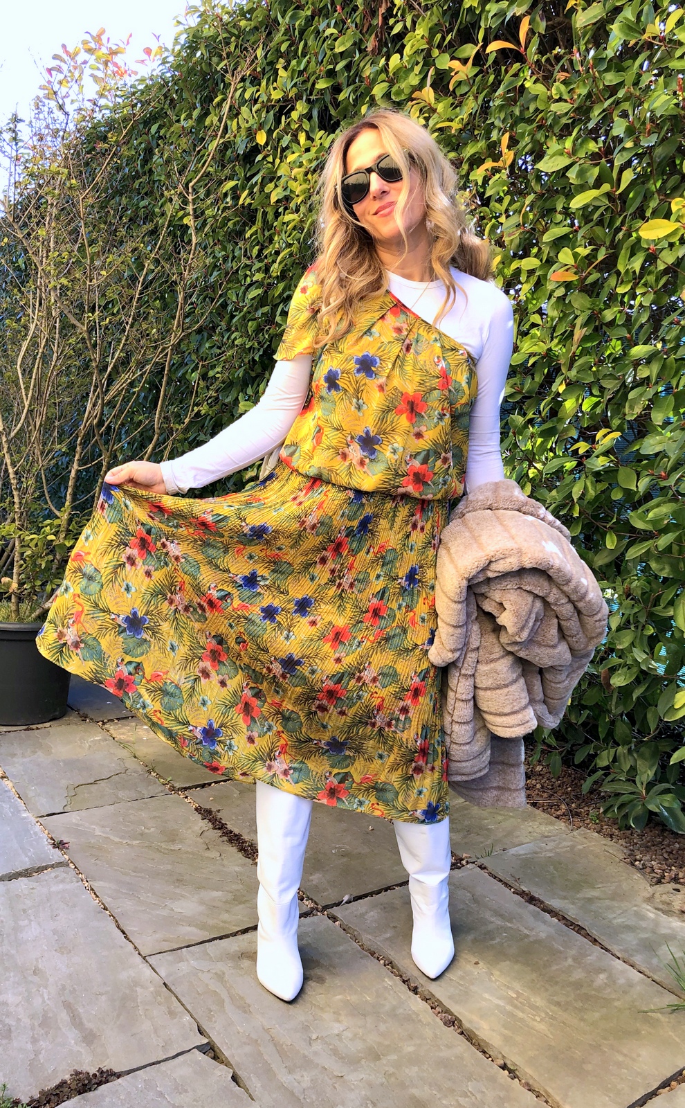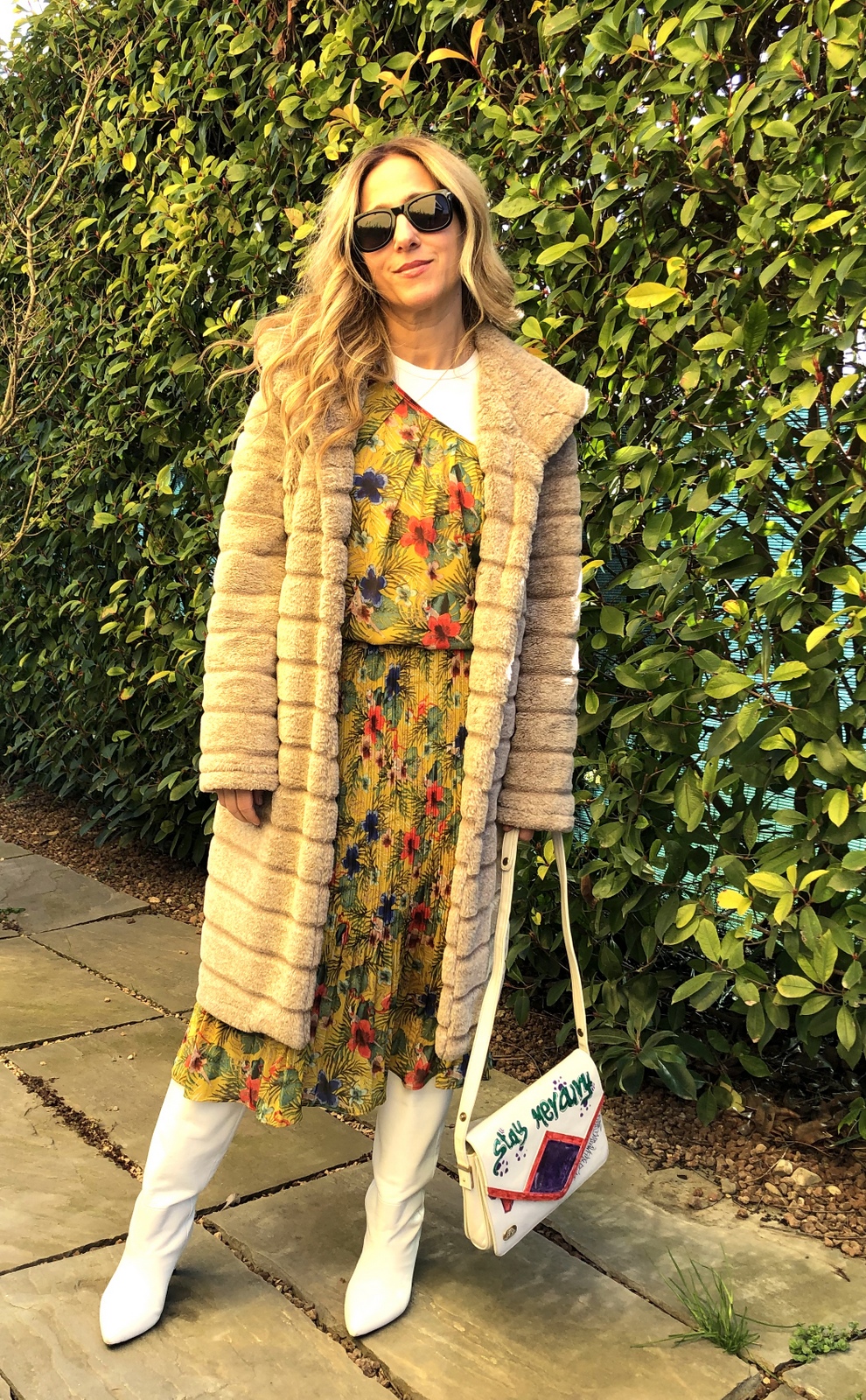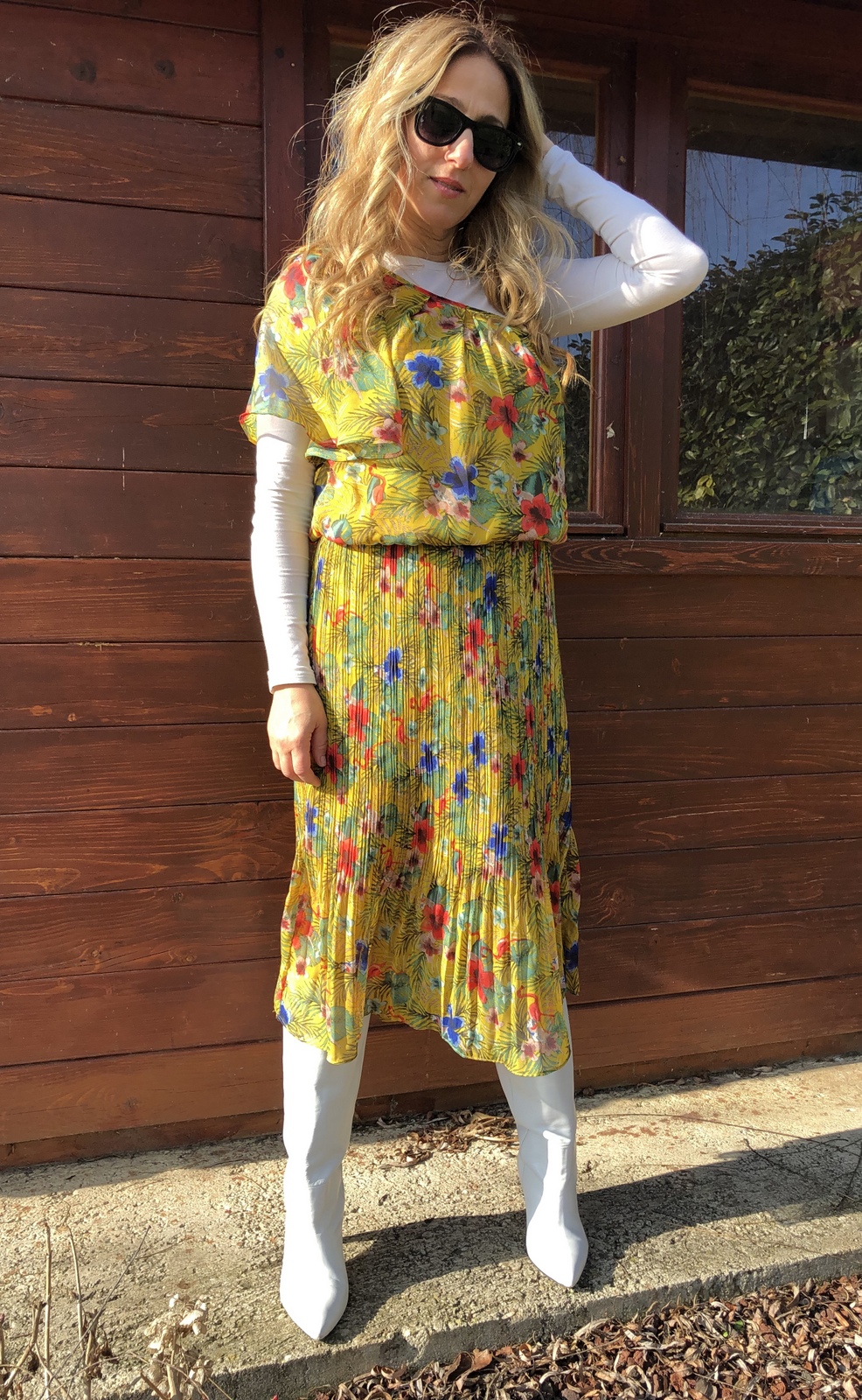 Directly from my daughter’s click, I show you my country urban. The print of this dress fits the landscape perfectly. The cut reminds us with 70s glamour style. Graceful mono-shoulder with that touch of lightness which call for the warm season. I have combined it with a white t shirt for a preview version of the equinox and with white boots and with a beige eco-fur.