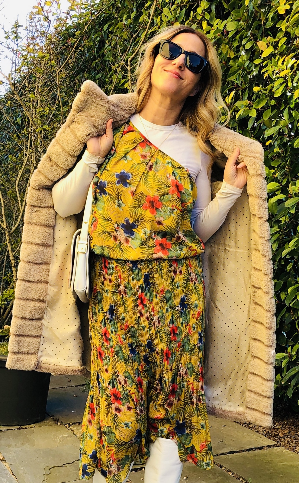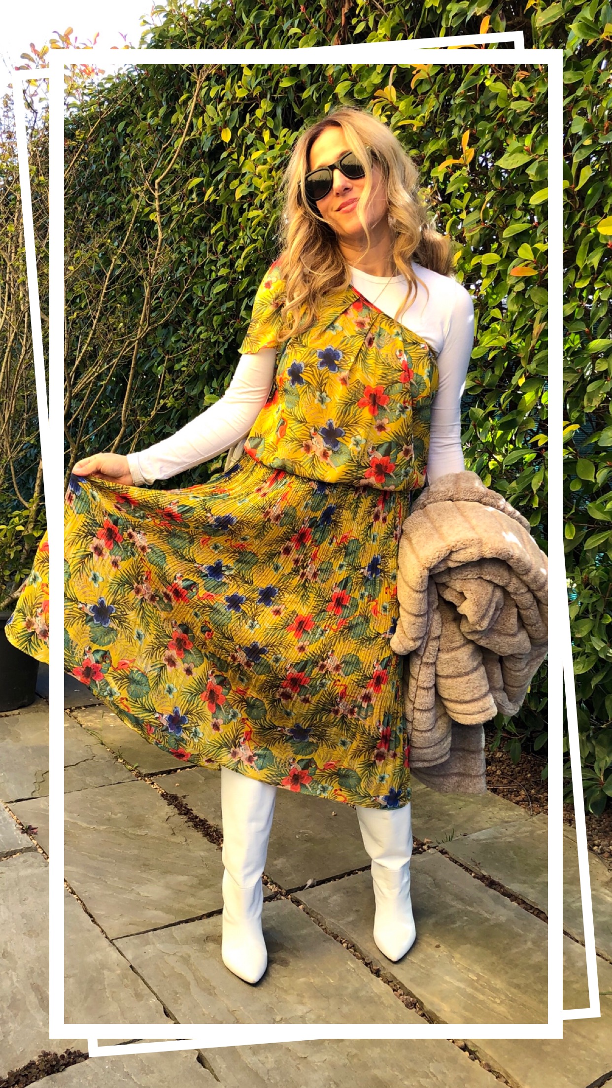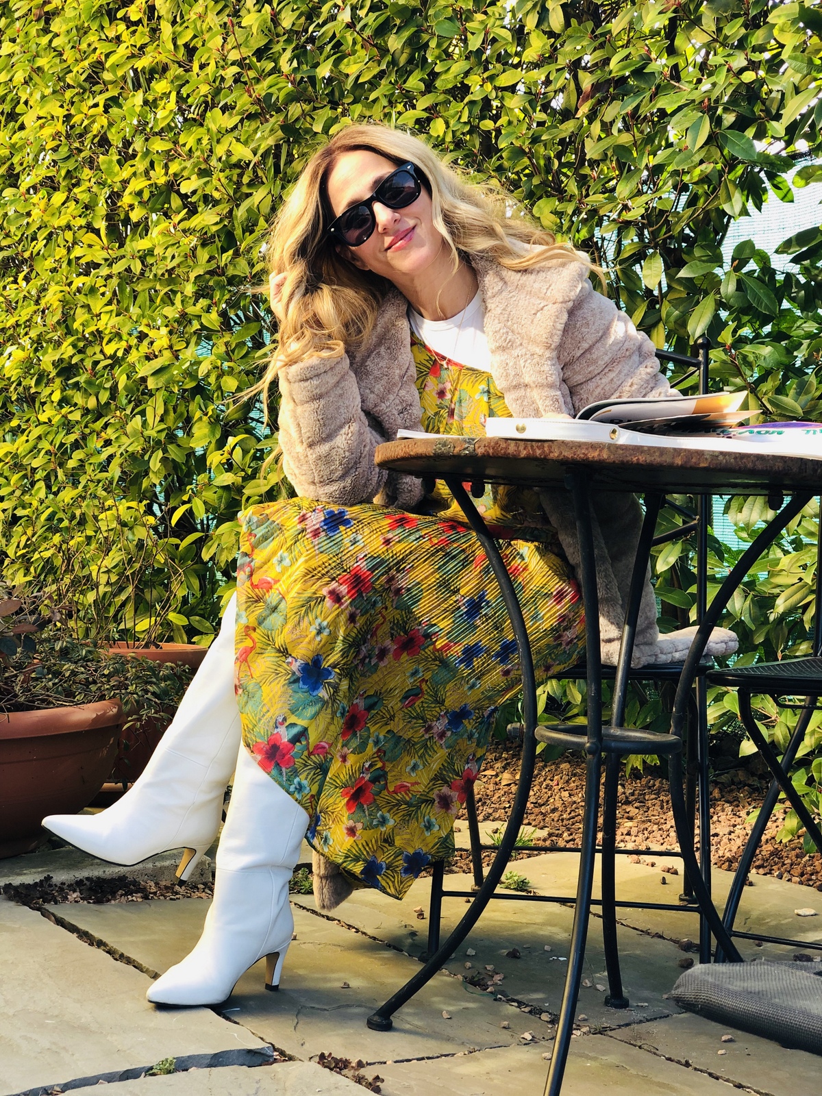 Directly from my daughter’s click, I show you my country urban. The print of this dress fits the landscape perfectly. The cut reminds us with 70s glamour style. Graceful mono-shoulder with that touch of lightness which call for the warm season. I have combined it with a white t shirt for a preview version of the equinox and with white boots and with a beige eco-fur.