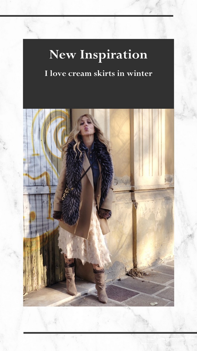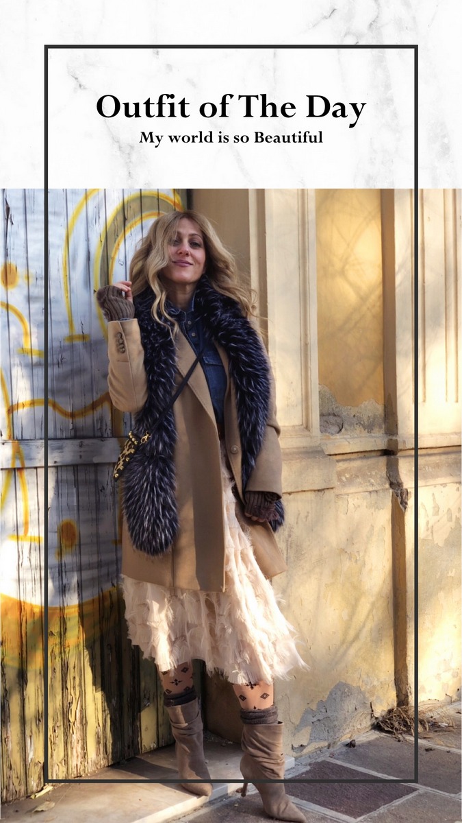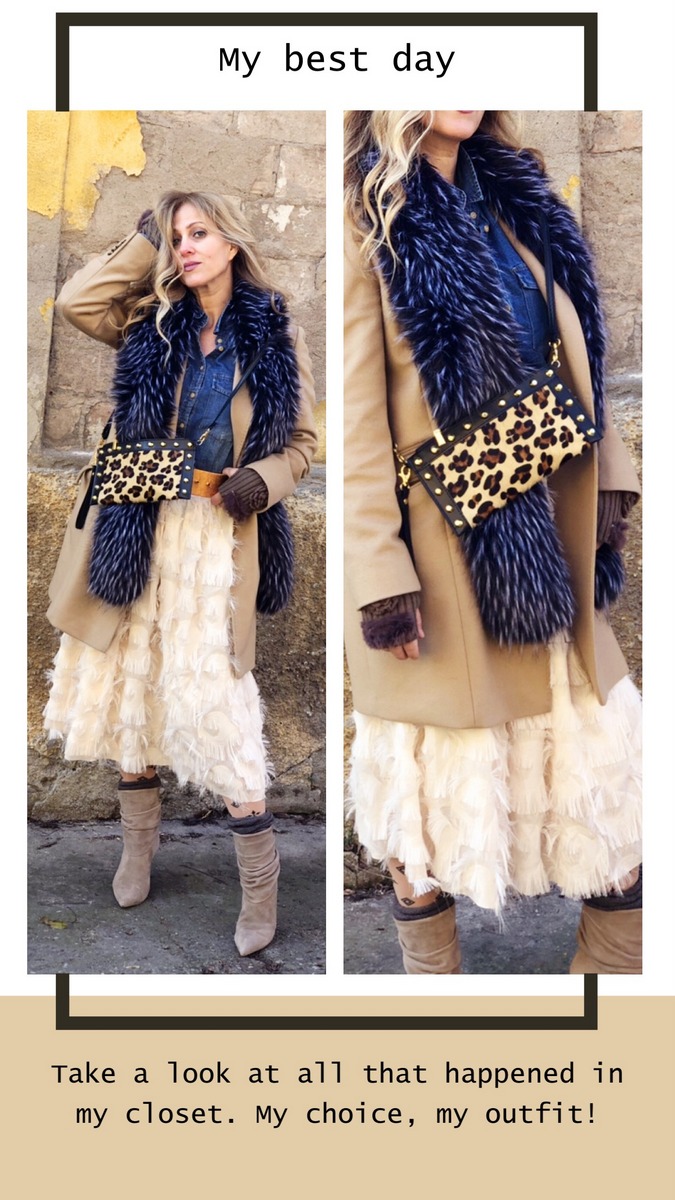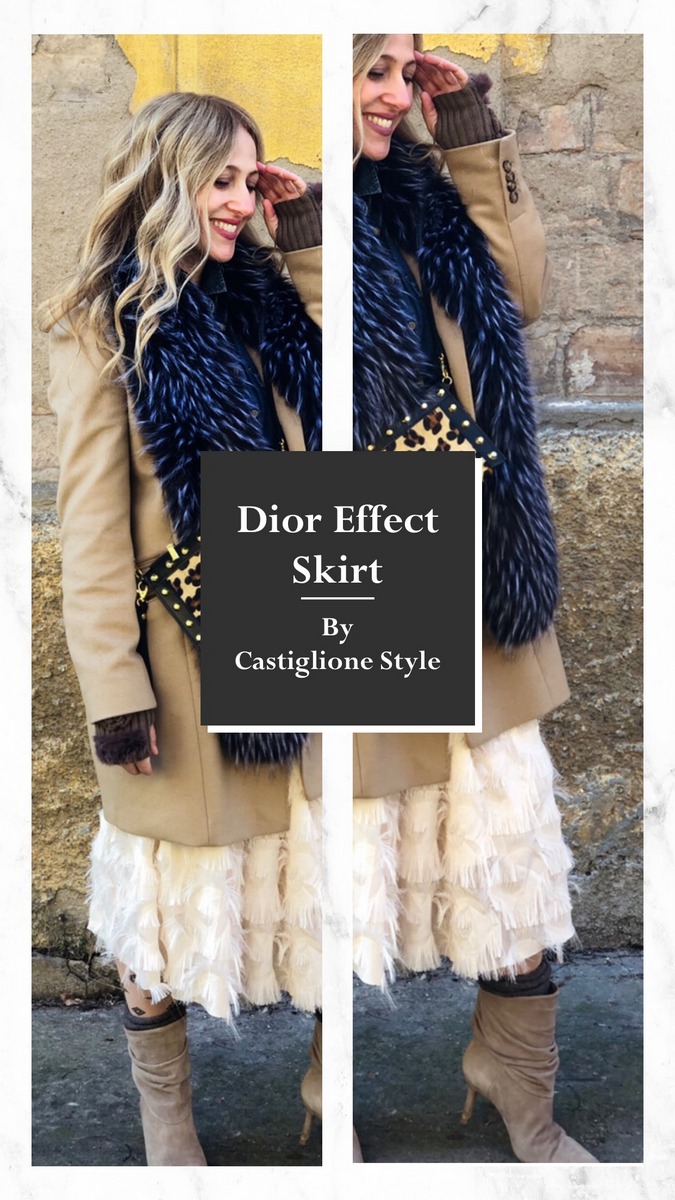 La mia gonna, ricorda lo stile Dior. L’ho abbinata con una camicia in denim, un cinturone e un cappottino cammello. Ho scelto un paio di stivaletti sobri e comodi, ma prima ho indossato un paio di calze. Ahimè il freddo mi costringe a mettere le calze quest’anno e io faccio davvero molto fatica, poiché con le calze, mi sento soffocare! Il collo in ecofur rende grintoso e wilde il look. Vi piace?
