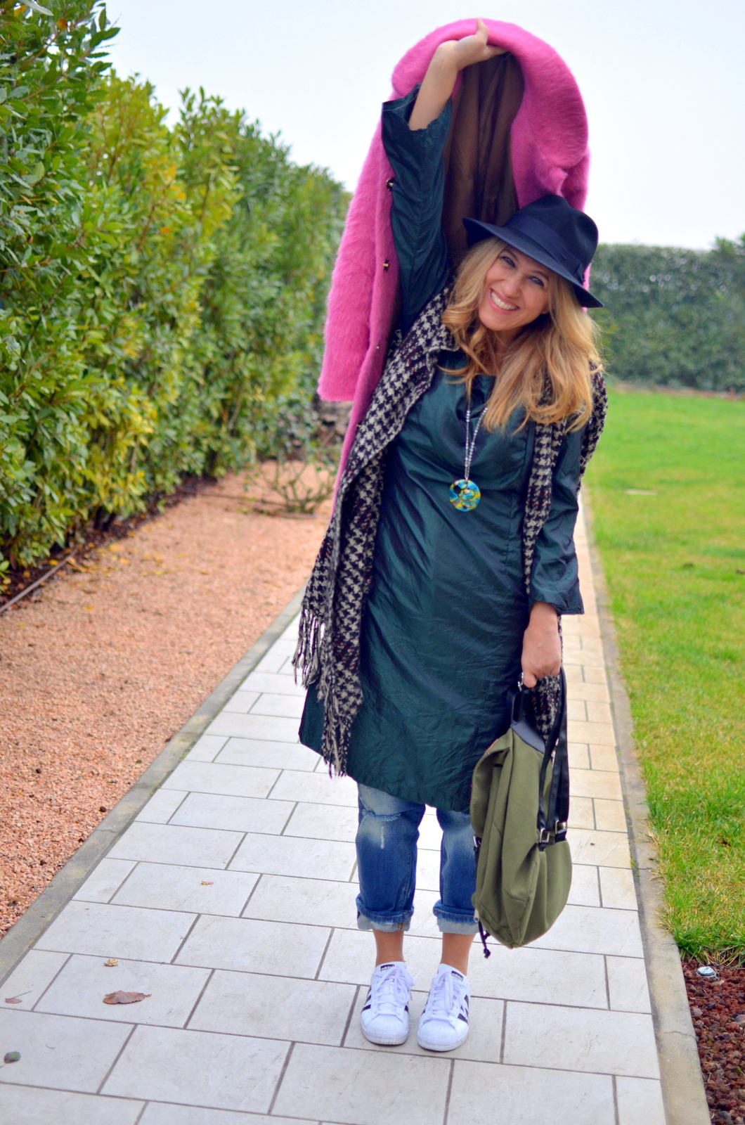 Nonostante senta la mancanza dei tacchi decido di chiudere l’abito in cappottino fucsia che sul verde bosco è la morte sua. O meglio a me piace da matti, mi ricorda molto gli abbinamenti di colore che facevo quando avevo 10 anni e mi vestivo alla 0-12. Il cappotto è tra i miei acquisti in saldo. Non ne sentivo proprio l’esigenza, ma noi donne siamo poliedriche soprattutto nell’abbigliamento!
