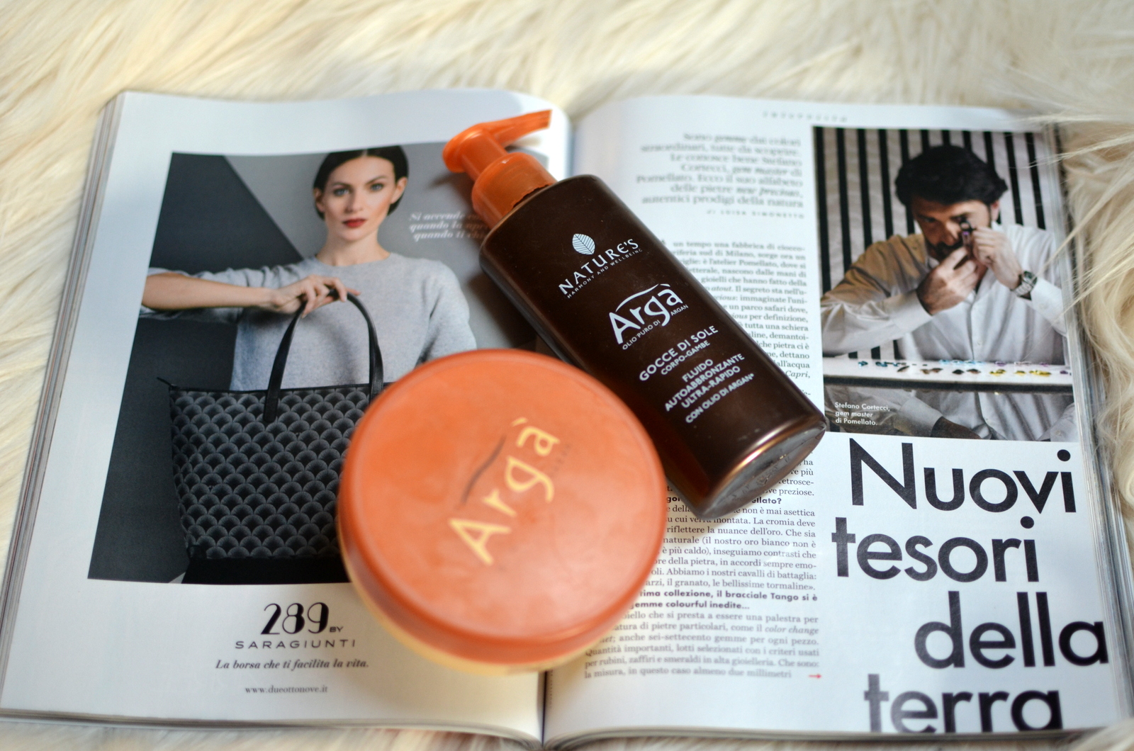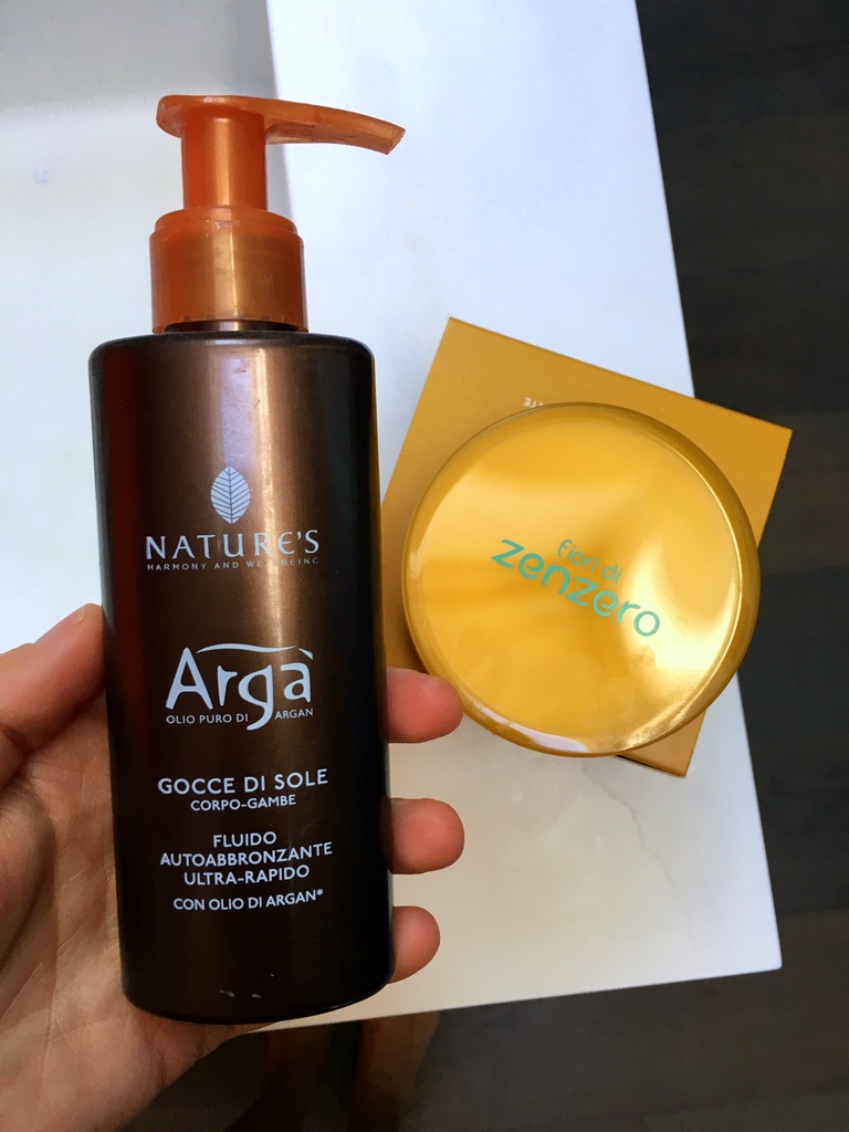 Ma devo fare in fretta. Prima peró non posso non terminare la mia beauty routine al sapore di Gocce di Sole Fluido. Si tratta di un Autoabbronzante corpo che nasce dai laboratori Nature’s con la formulazione specifica per la pelle del corpo. Leggero, fluido, si assorbe rapidamente. Da applicare su tutto il corpo per un colorito caldo e luminoso. Contiene Olio di Argan che nutre e rende elastica la pelle. Io uso le Gocce di Sole Fluido mescolato con la crema corpo all’Olio di Argan per nutrire ancora di più la pelle e renderla compatta. In alternativa con la crema morbida e delicata ai Fiori di Zenzero che oltre a sprigionare note speziate e fiorite contribuiscono a rendere il corpo tonico e levigato.