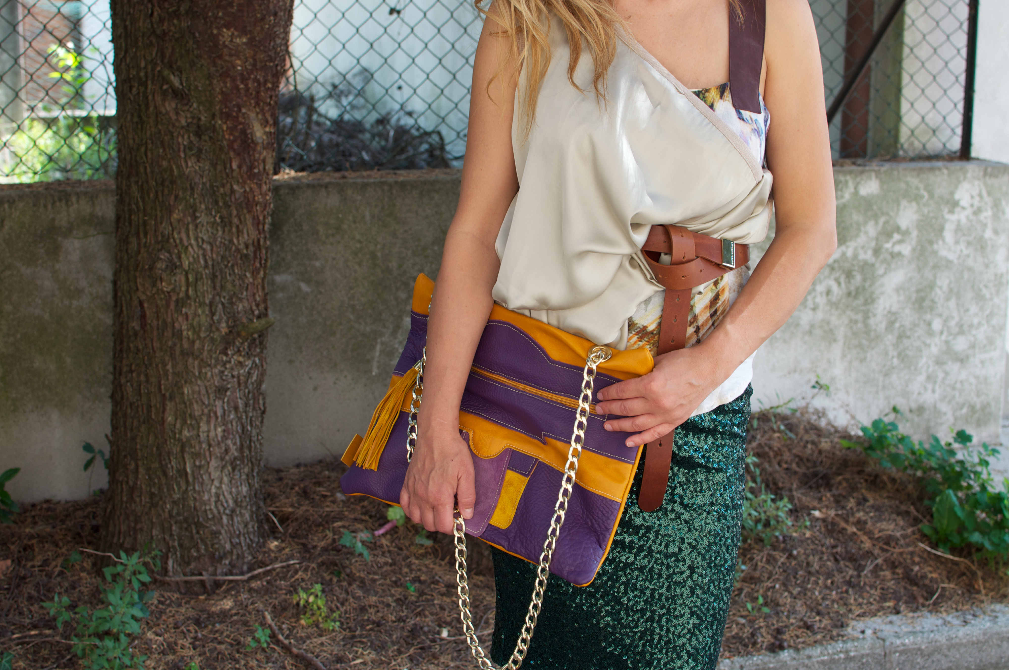 Il nostro outfit si perfeziona con una bag dal mix di due colori molto forti. in pelle riciclata, raffigurante evocative forme geometriche, art decò, tipiche delle architetture di stazioni e caselli ferroviari del Salento, agli inizi del ‘900. Ed è proprio qui nella terza località di mare che nasce JABBA DESIGN, un brand femminile dal mood etico ed eco fashion che grazie all’intuizione di una giovane stilista salentina MIMMA FUNIATI realizza a mano pezzi unici attraverso il riutilizzo di pelle, juta e altri tessuti. Un approccio ricercato, unico, che cura i dettagli con stile e buon gusto e soprattutto rinfresca e rinvigorisce l’ambiente.