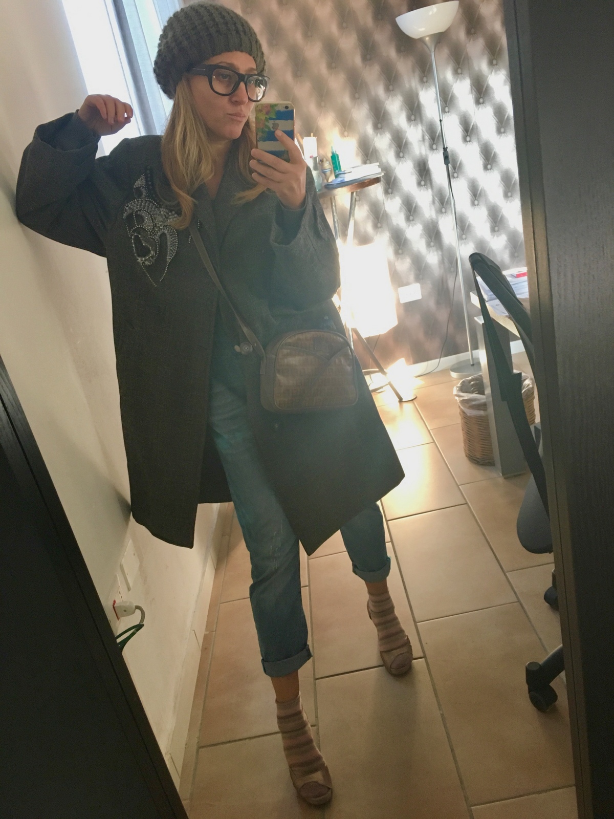E ancora tracce ribelli con il sandalo col calzino di inverno. Una salopette che non guasta mai e l’eleganza di un cappotto sartoriale vintage di Loladarling. Impronta subliminale poiché parla di noi, di me, di te. scandalosamente seducente soprattutto quando inforco i miei occhiali neri.
