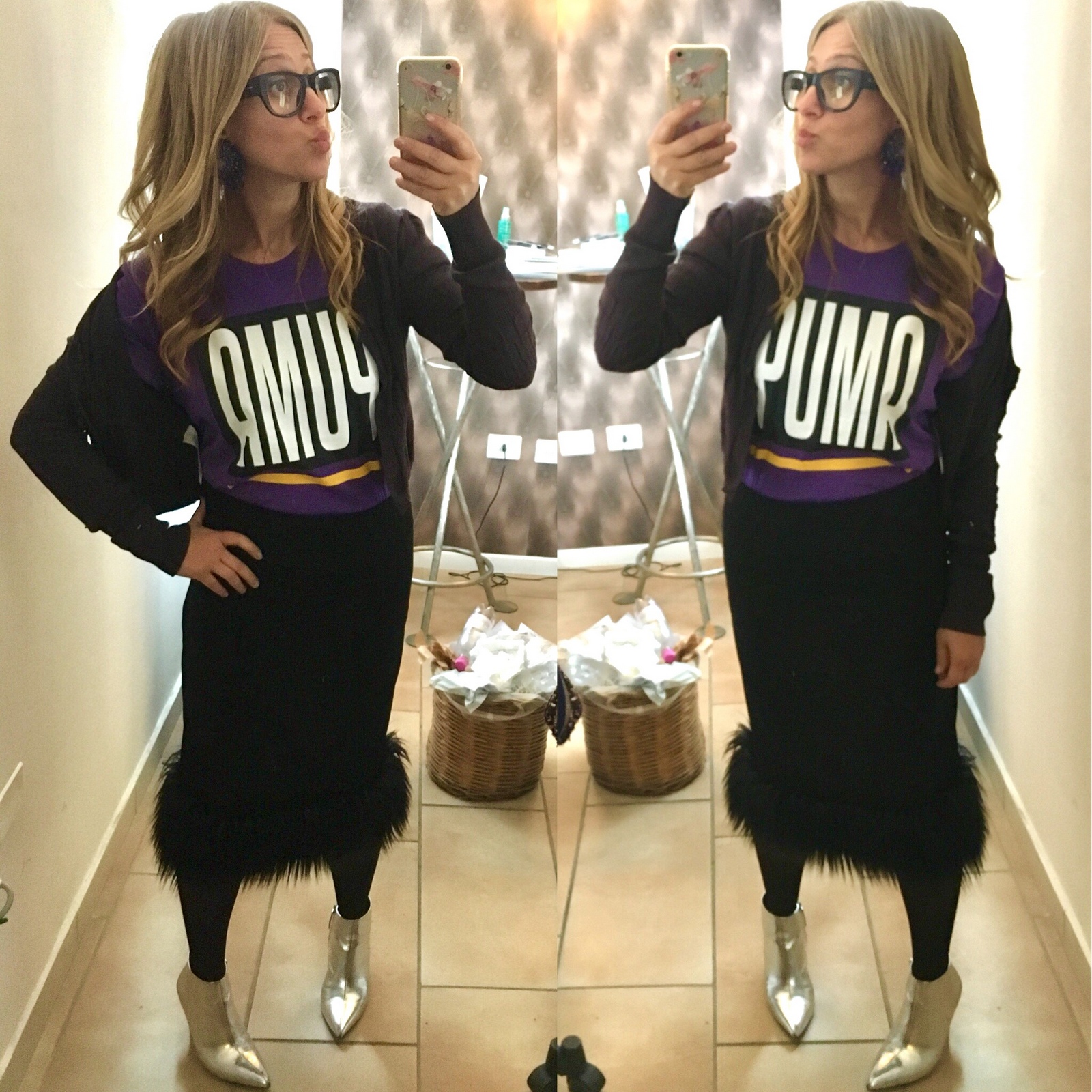 Infine ultimo look della settimana. Prendi la fantasia di NinniSenzaFreni nella sua gonna con le frange in eco-pelliccia. Un mini cardigan e una t shirt cool velvet Purple di Puma. Me la sono regalata per 18 euro su Zalando. Tacchi rigorosamente silver. Il risultato? Cool limited edition per il mio mondo incantato.