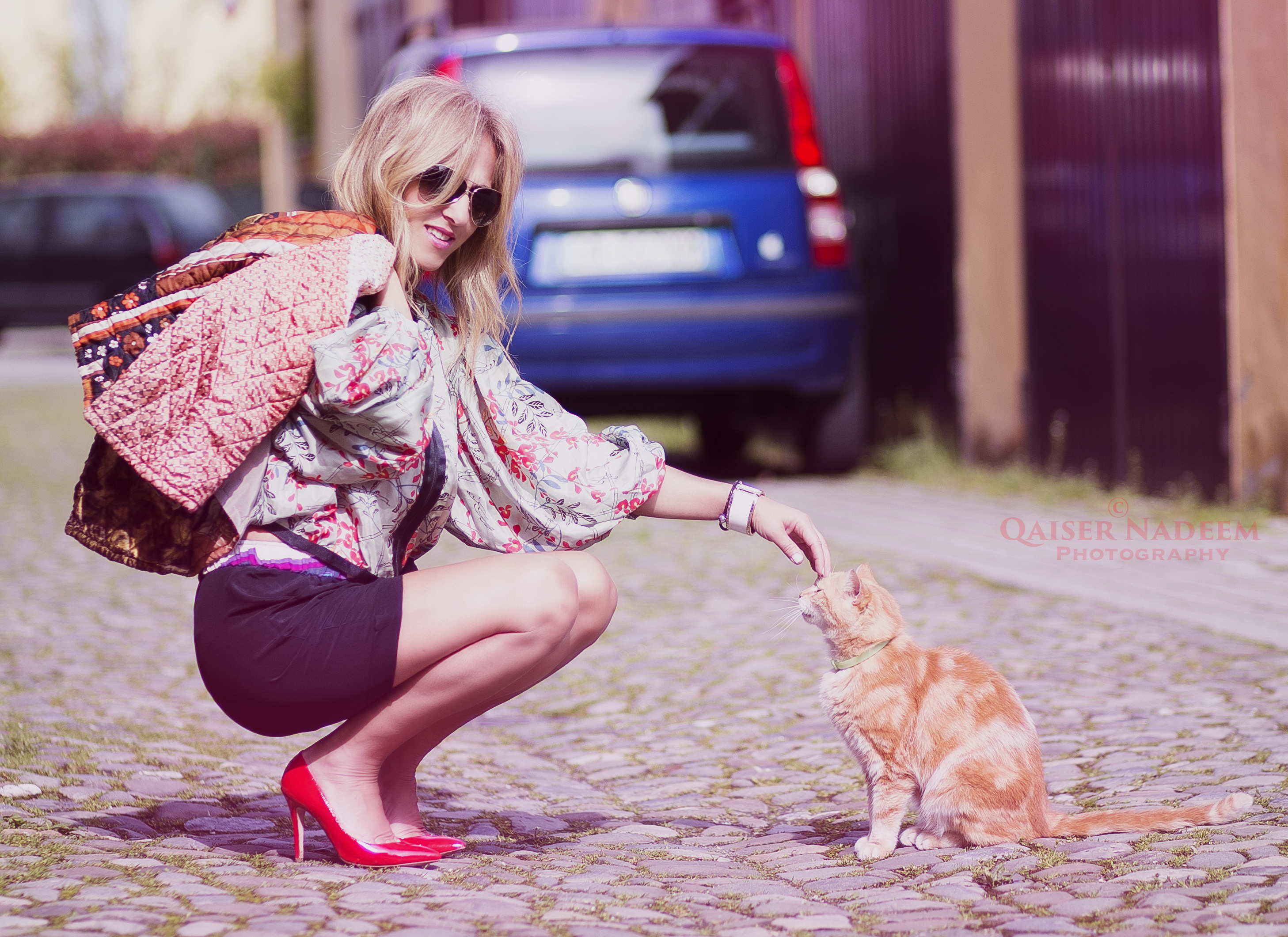 la prima foto col micio è stupenda *_* oh che carino lui 🙂 mi piace tantissimo questo look, la camicia/blusa e il giubbottino sono davvero particolari!!!