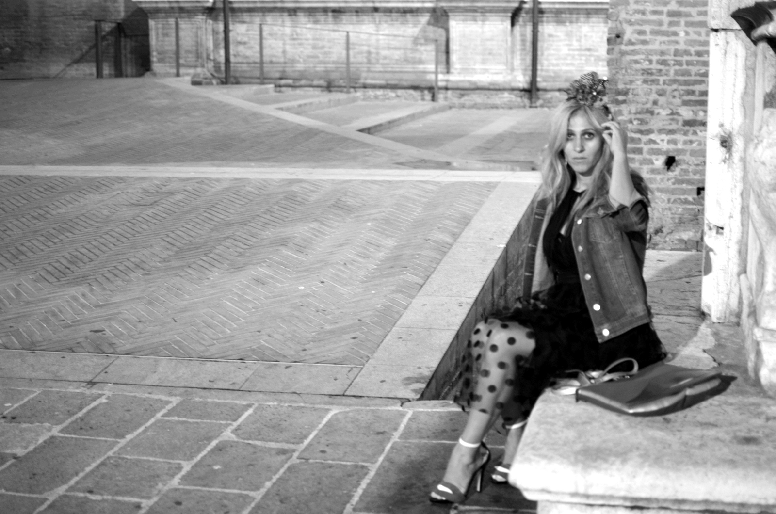 Ho messo insieme la voglia di una cena speciale con amici speciali, di un abito in tulle nero, di due tacchi irriverenti, di un bandò, fuori dalle righe sulla mia testa bizzarra, di due orecchini, gemelli diversi, di una borsa audace, con una bocca dipinta di un rosso rossetto che fa tanto estate, di un denim, complice di abbassare i toni aulici del nero e del tulle.