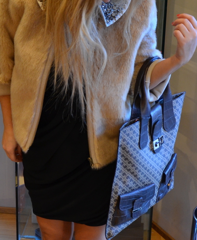 Cecile: Giacca corta in eco montone con dettaglio collo ricamato borchie e zirconi attacca/stacca indossato su abito smanicato  nero jersi con dettaglio lato ricamo strass. Da banale a very chic. Il colletto così ricamato accompagnato da una borsa Gherardini da vera professionista!!