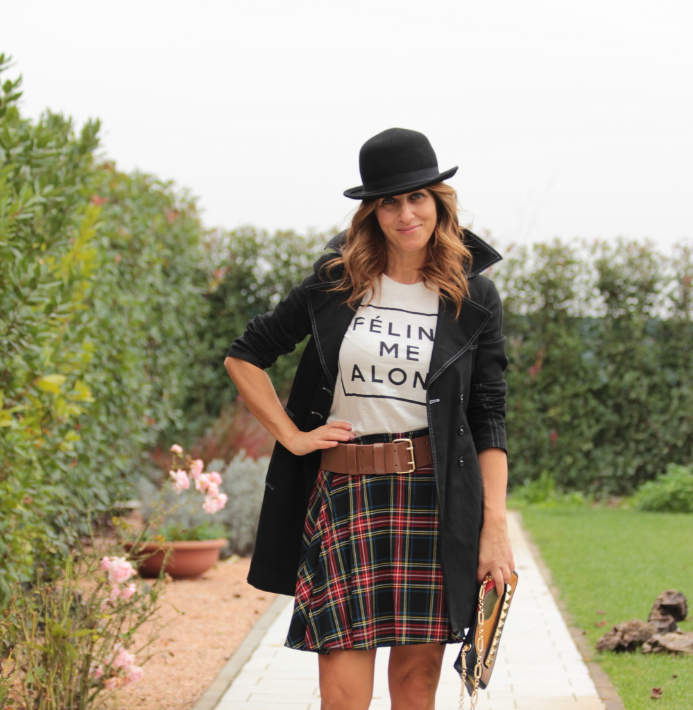 Credetemi sulla parola. Complice le temperature sopportabili e la mia riluttanza alla prigionia della calze, sono riuscita ad indossarle solo due volte in Dicembre. Ma voi non seguite il mio consiglio e copritevi bene. Io sono folle, impavida e sciocca poiché da circa un mese mezzo ho trascorso tutti i miei week end a casa con raffreddore e febbre. La funzione attiva degli anticorpi è inversamente proporzionale all’avanzare dell’età ed è progressiva a scemare con l’indice di follia. Io non ho più 20 anni e nemmeno 30 e il mio indice di follia è piuttosto elevato. A proposito dovrei fare la revisione annuale dell’indice e sperando non mi impongano di inforcare gli occhiali alla guida veniamo al mio outfit di oggi. Una gonna scottish style e un trench strizzato in vita su una tshirt parlante, una classica bombetta nera, stringate bicolor e una deliziosa borsetta patcwork vintage style. Sono pronta per la mia passeggiata domenicale sotto il sole dei mercatini vintage!
