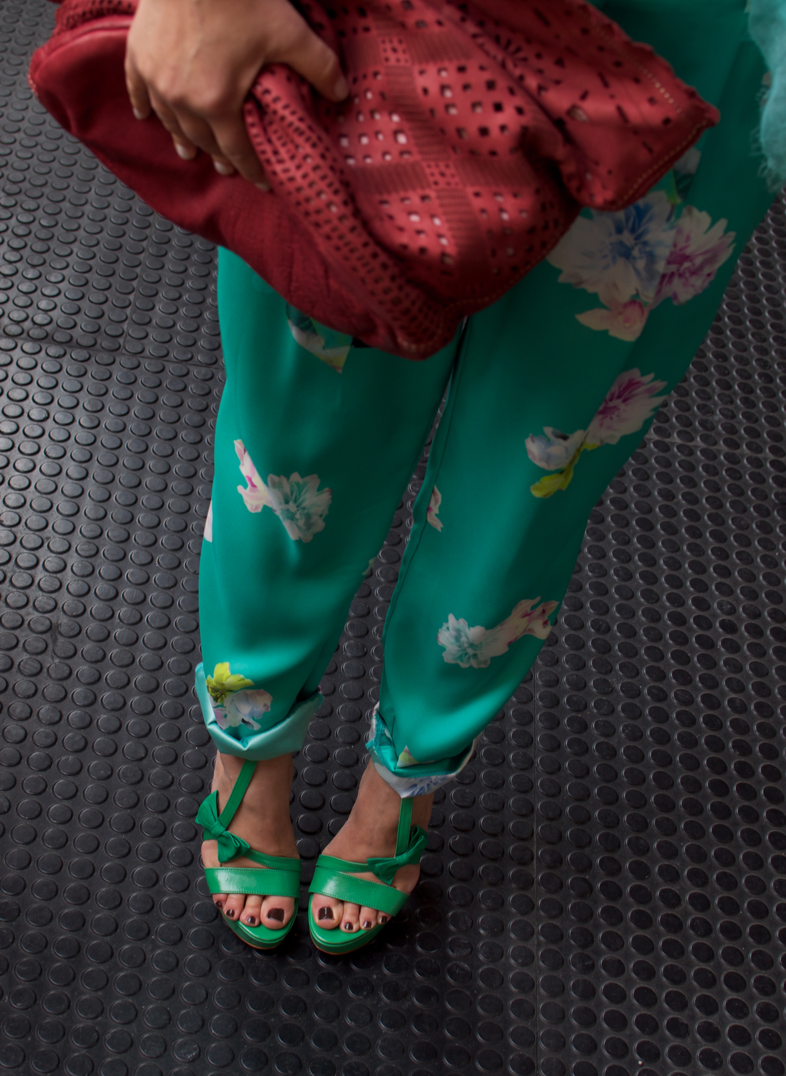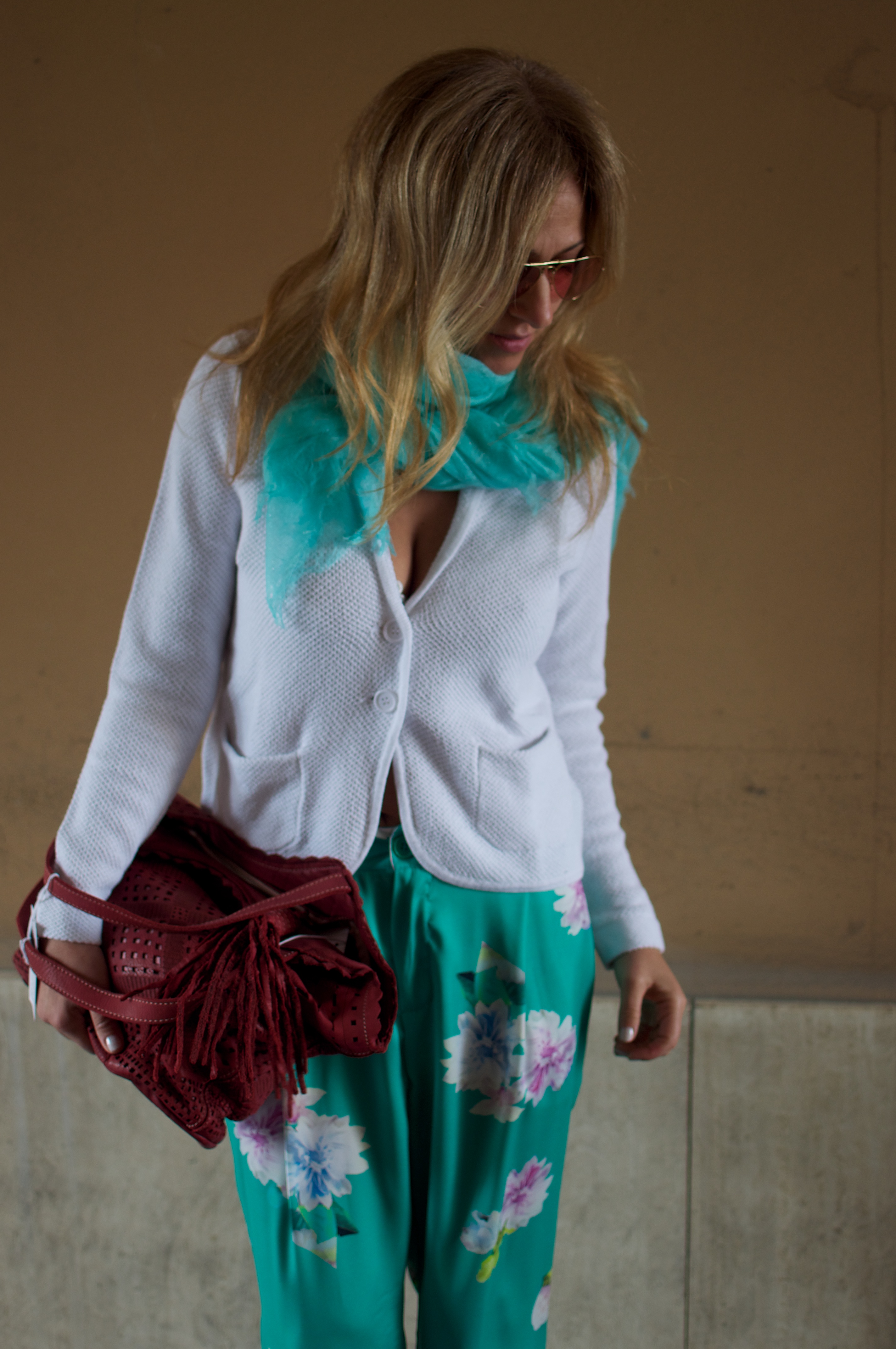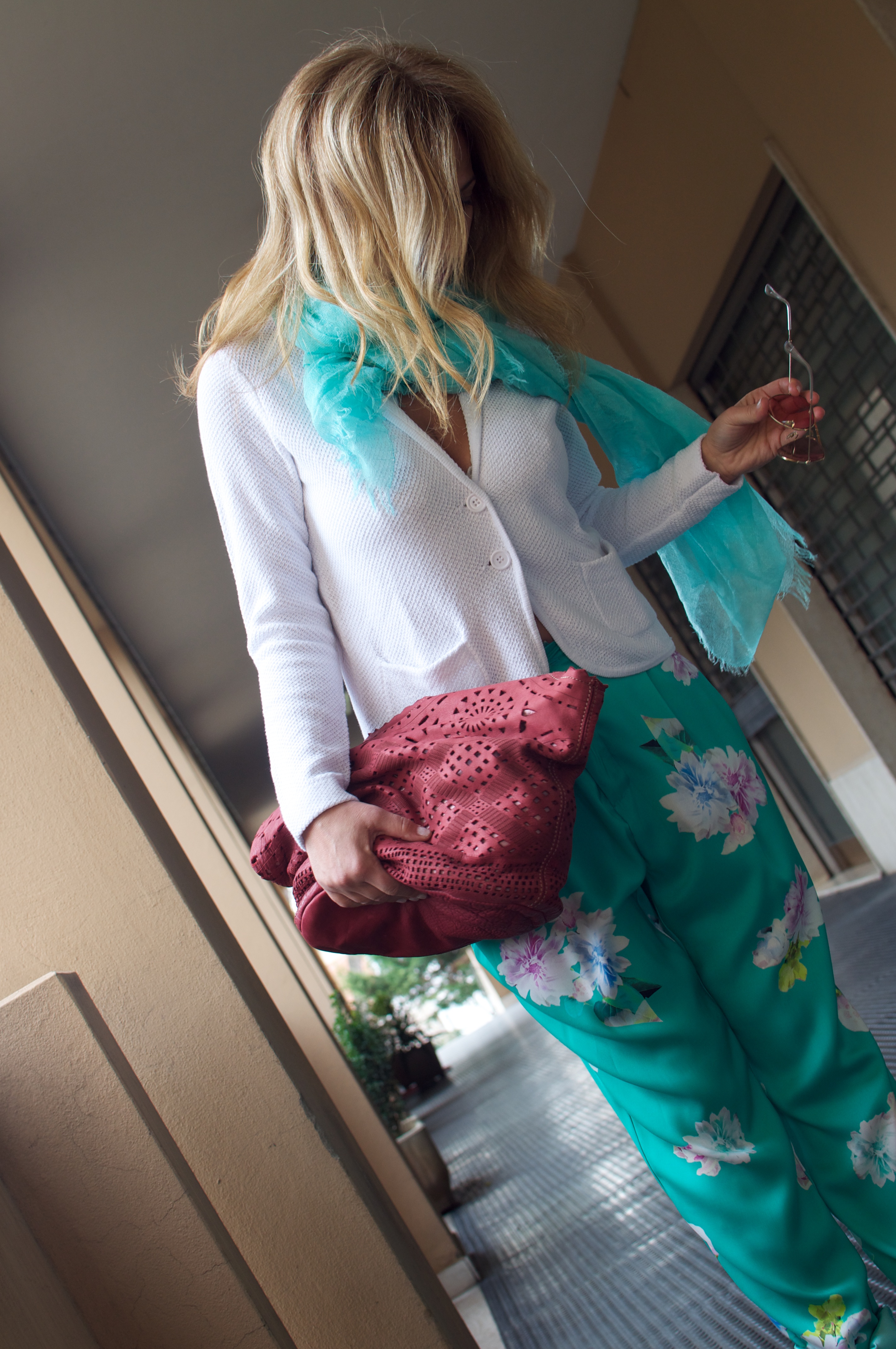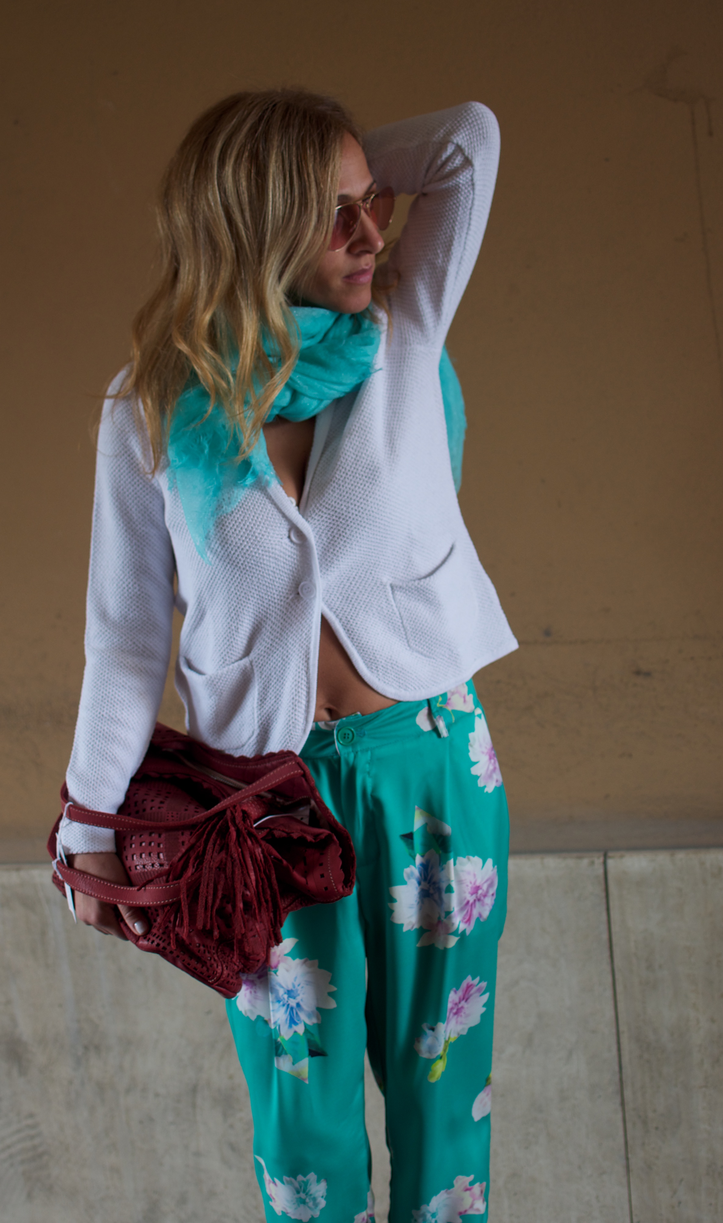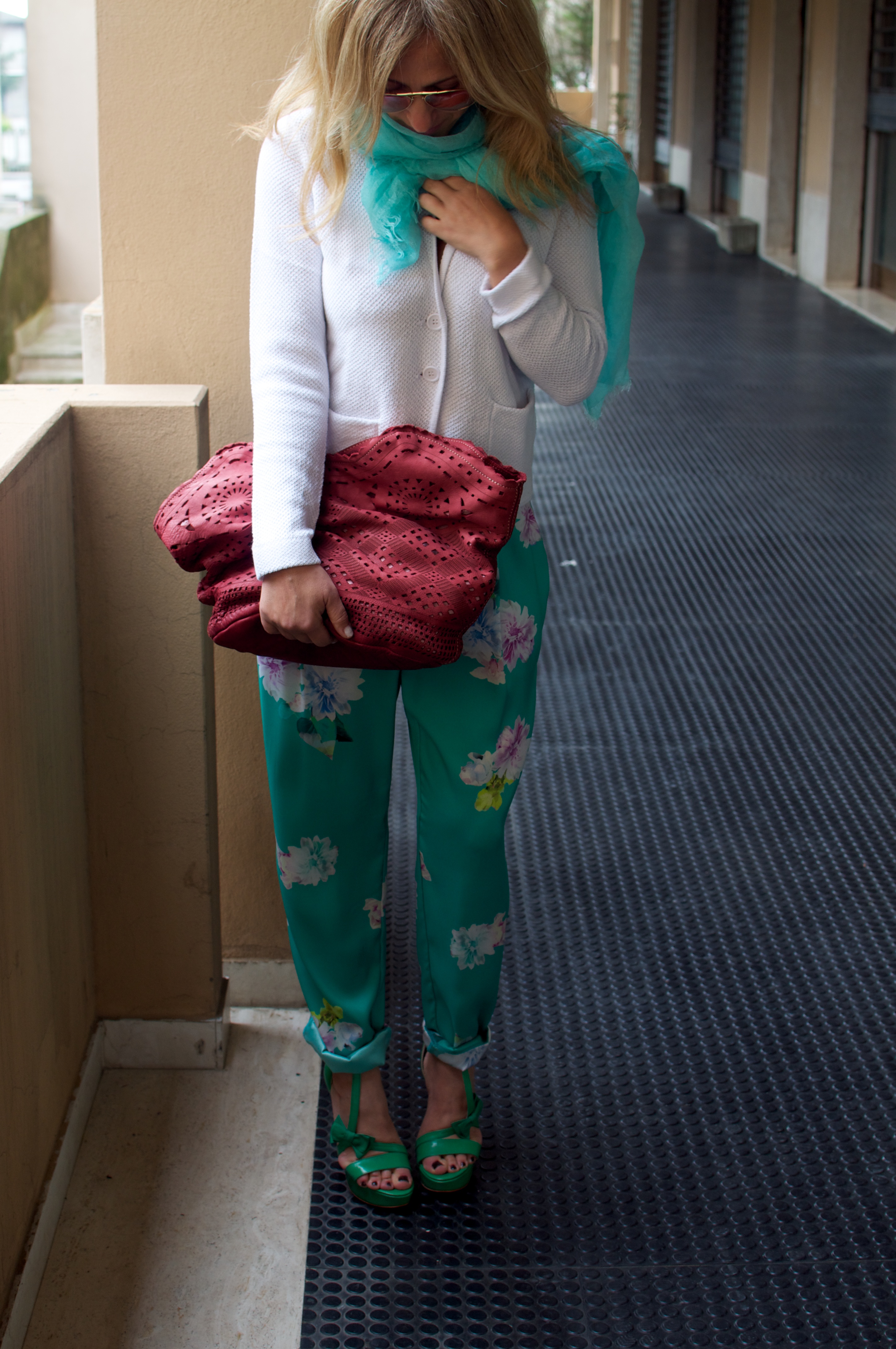 Un pantalone verde con fiori di campo, fresco e dinamico che sembra un prato. Un taglio largo da portare arrotolato alle caviglie “effetto anni ’80”. Un blazer in piquet bianco morbido indossato a pelle. Una comoda shopper con frange rosso burgundy che richiamano i rayban a goccia dello stesso colore. I sandali DellaPaolini…sono bastati per invocare la Primavera? Ma che Primavera!? Io tra poche ore parto per Bali dove è già Estate! Ho preparato i miei bikini, i miei short da trekking e bicicletta, i miei ouifits per le serata di gala, le mie borse per le escursioni sull’isola degli dei, i miei libri e il mio ipad per un viaggio di quasi 15 ore di volo fino al The St. Regis Bali Resort. Seguitemi vi spedirò tante cartoline!