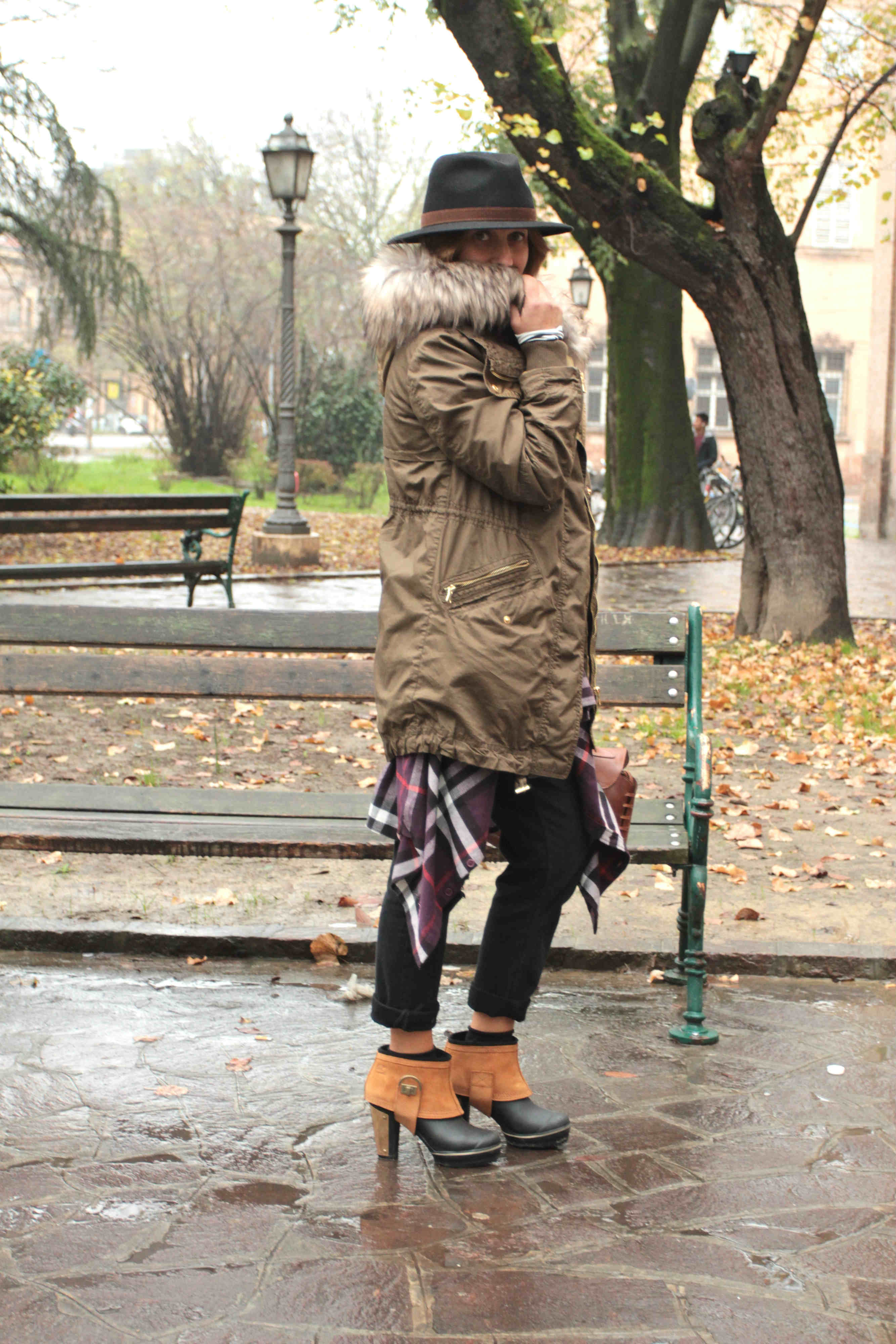 Carinissimo questo look! mi piace troppo l’abbinamento del parka peloso con la camicia a quadri! hihihihi io adoro passeggiare sotto la pioggia quando sono quelle due gocce che ti permettono di indossare solo il cappuccio/cappello senza allagarti tutta! quando invece viene giù una bella pioggia preferisco gli stivaletti stile equitazione flat anche perchè qui a Napoli con i tipici massi vulanici si scivola che è una bellezza!! ma questi tacchi di gomma danno veramente un tocco femminile in più e poi immagino che siano anche comodi!