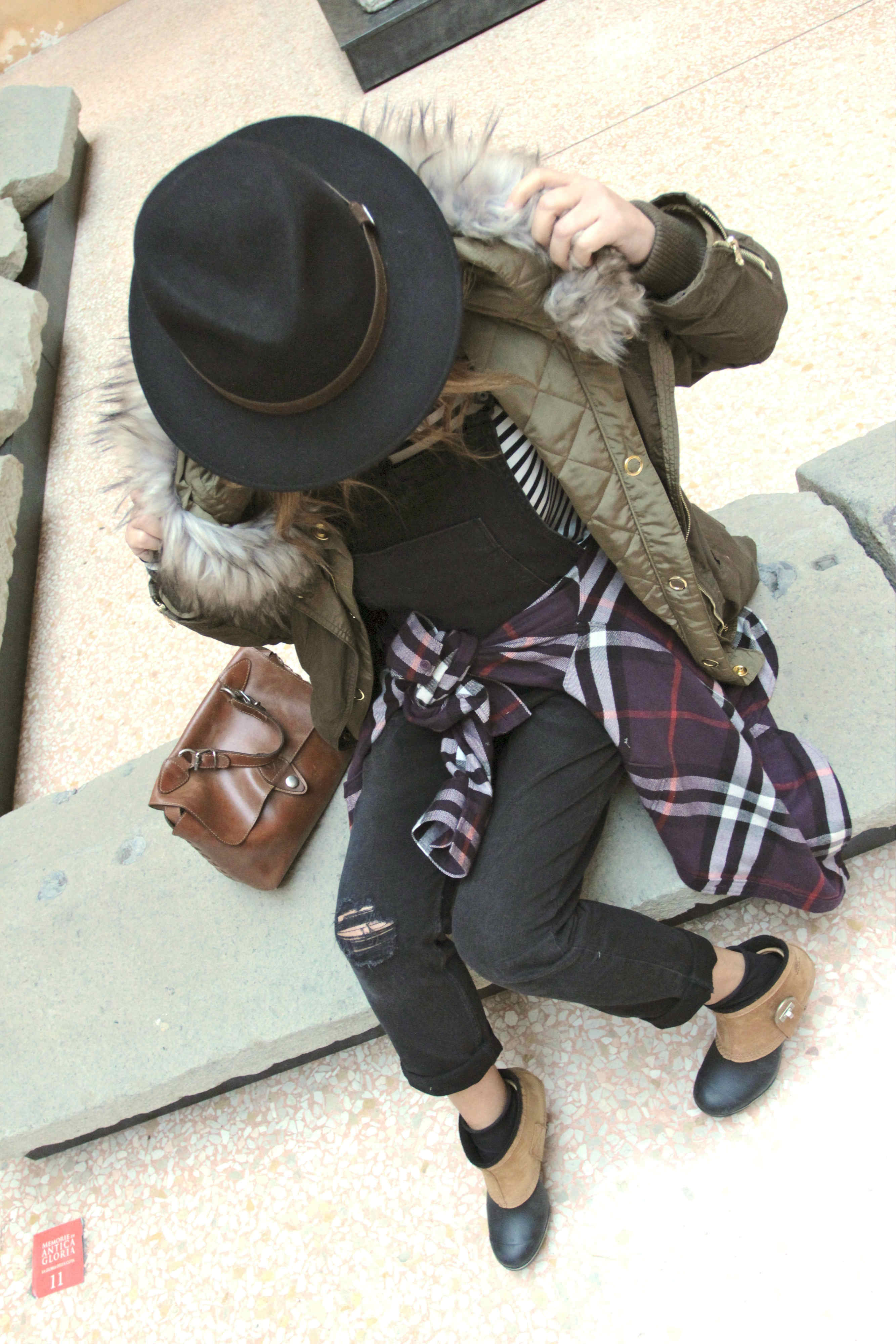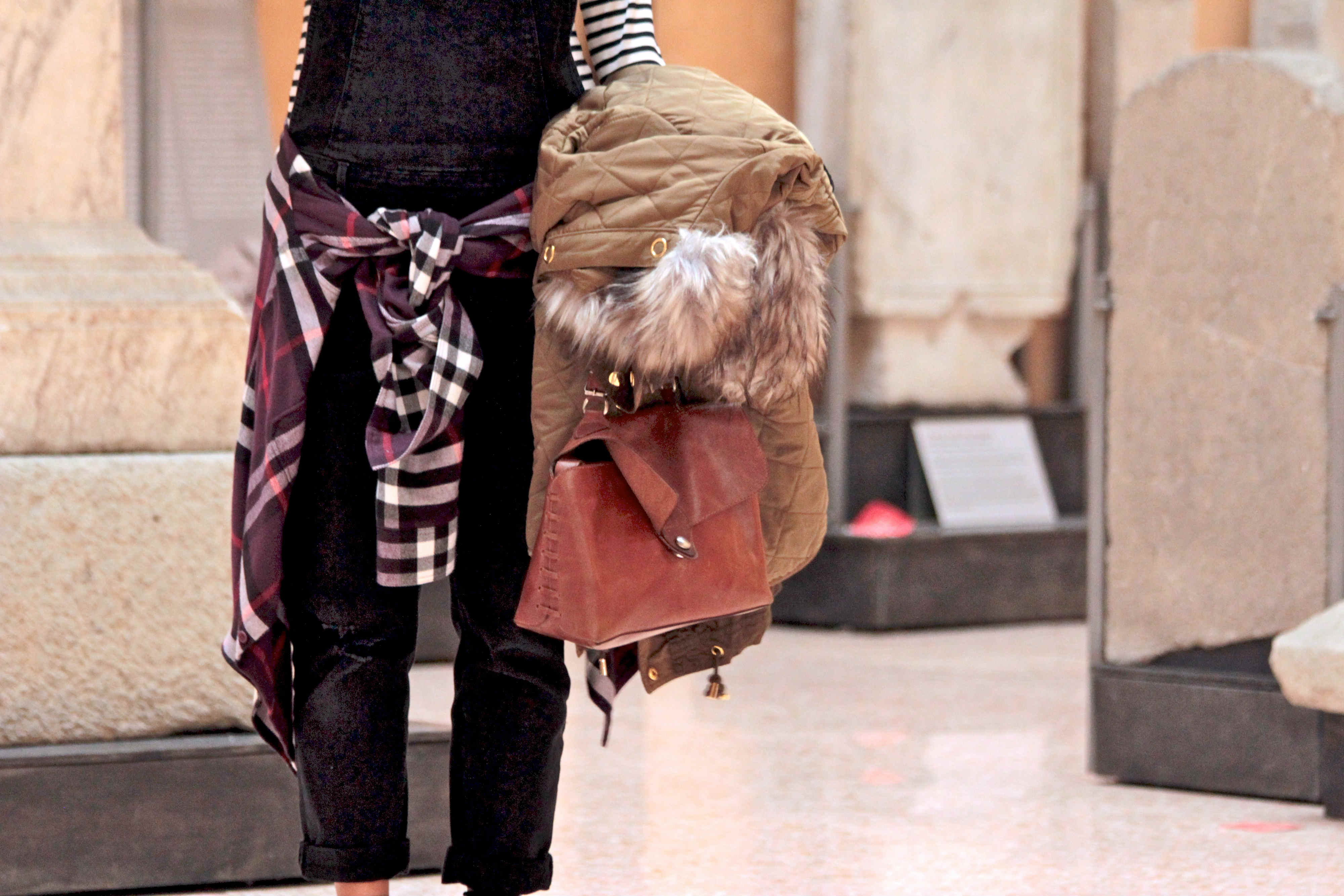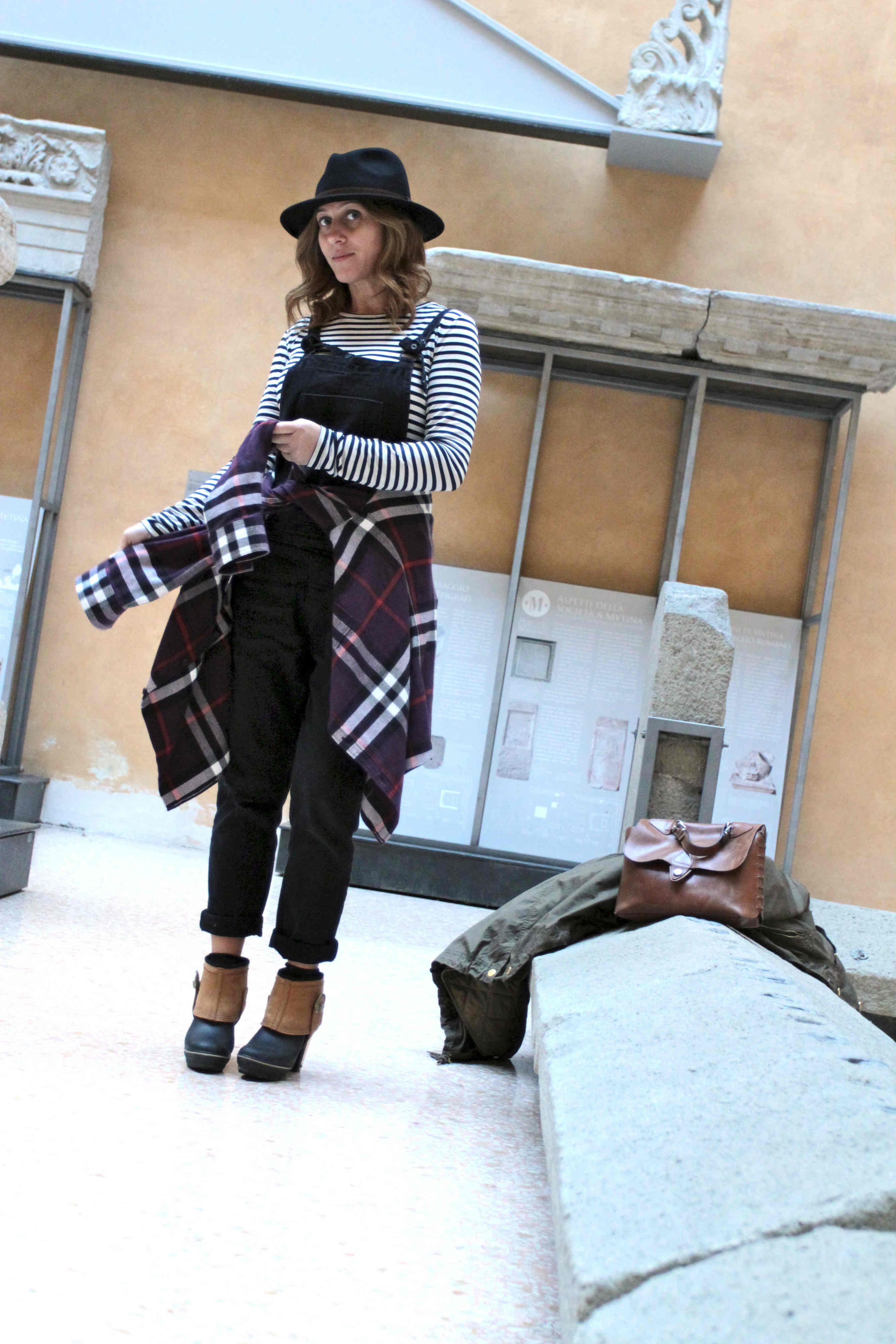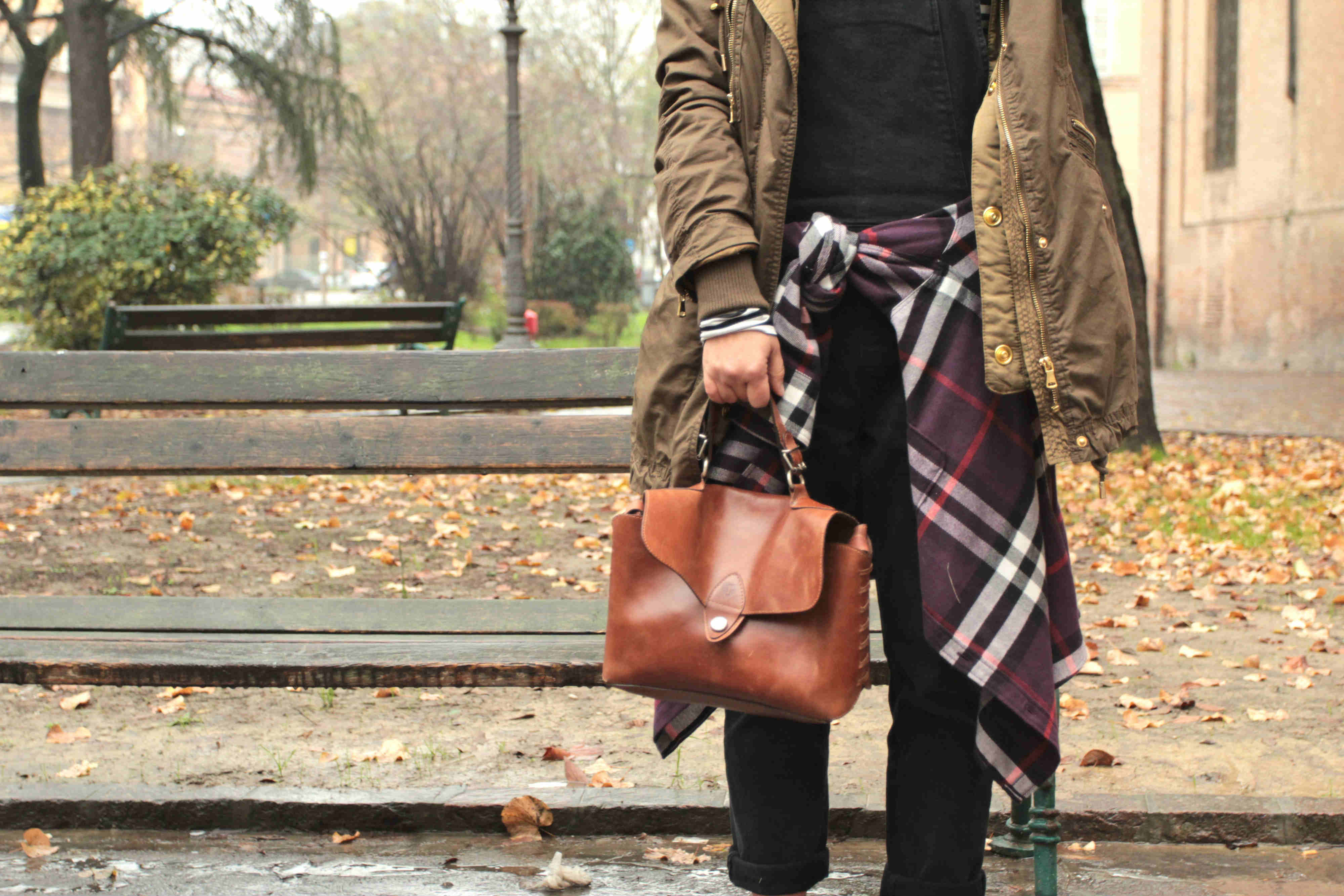 Piove ormai da giorni come in almeno dieci film americani e di pozzanghere dove Peppa e family si divertono a sguazzare è piena tutta la città. E’ con questo grigiore che decido di dirigermi in Tribunale in pieno centro. Con il mio parka imbottito nel quale scoppio di caldo; il quadrettato Burberry della camicia annodata in vita, proveniente dall’armadio di mio marito con la quale divento ufficialmente la figlia di Tartan! Un cappello al posto dell’ombrello e una borsina vintage, la prima che ho trovato nella fretta del mattino assieme ad una salopette nera.