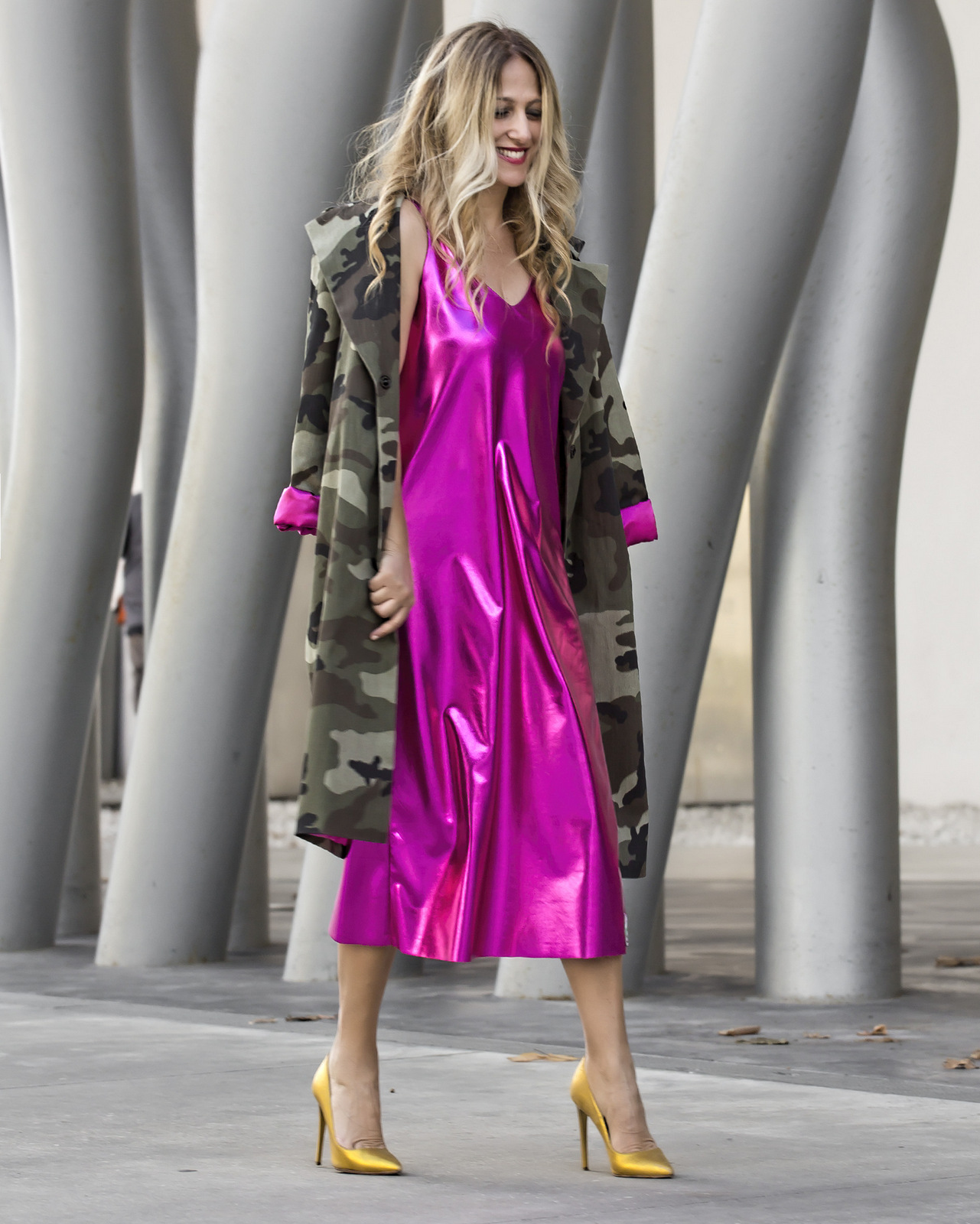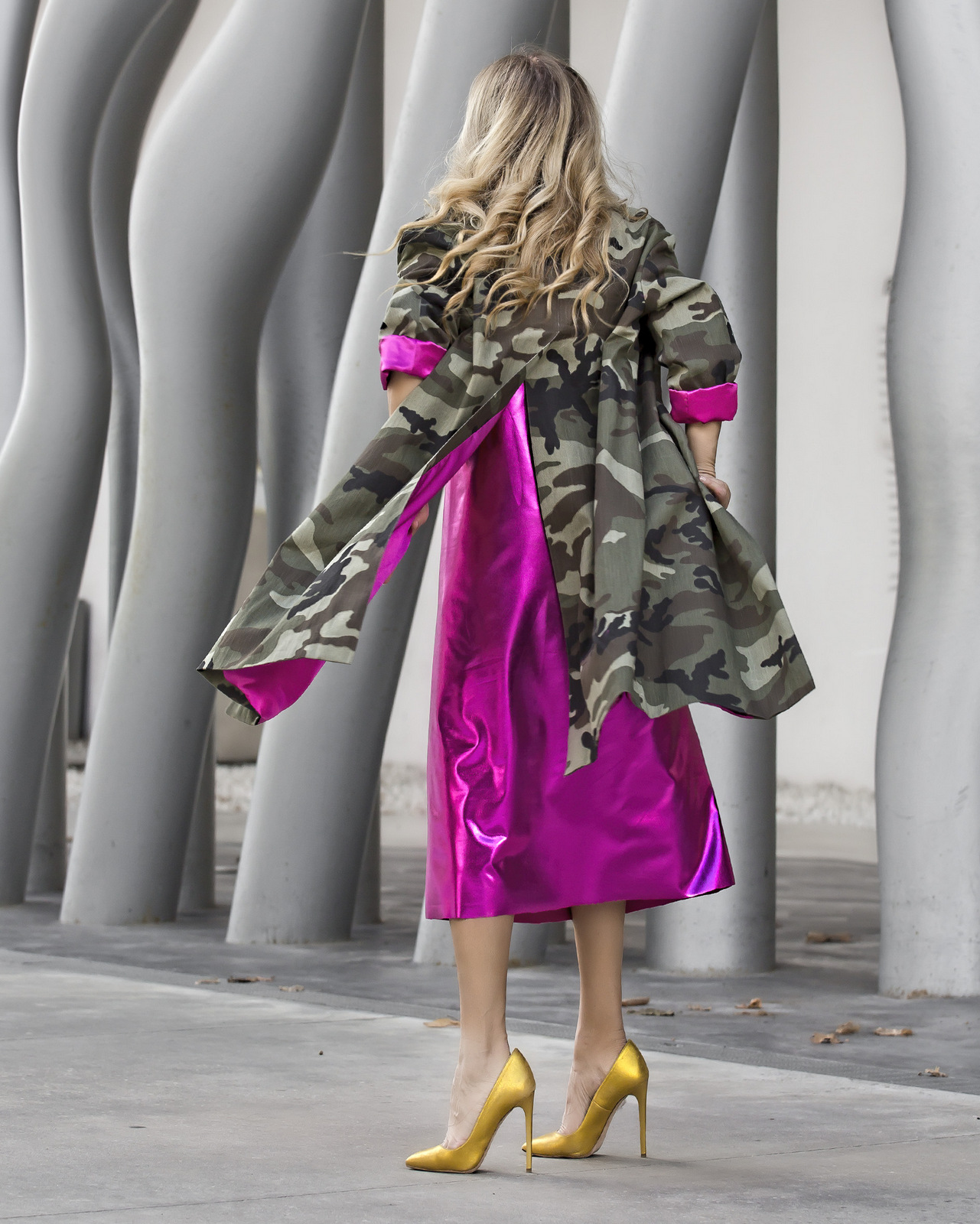 Per chi volesse curiosare gli altri look di Velvet Phoebé può cliccare QUI e guardare il nostro sito. Vi lascio con qualche scatto di Chiara Gasbarri che riprende in maniera alternativa il nostro camou trench con l’abito spalmato.
