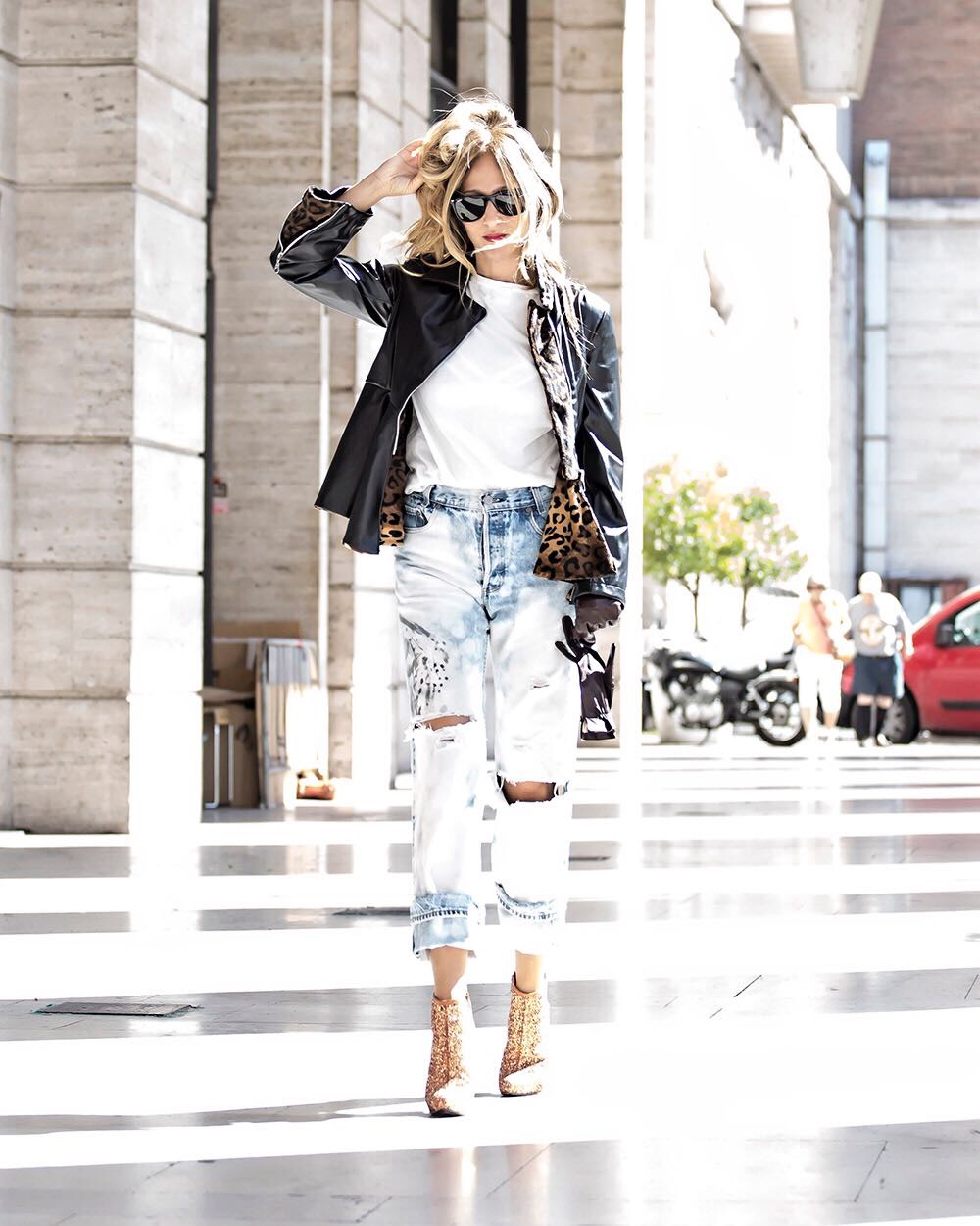 Tra le colonne un look scanzonato al sapore di strappi eleganti, vintage princess, di un denim vita alta. Look moderno e grintoso con T-shirt bianca e paiellettes arancio.