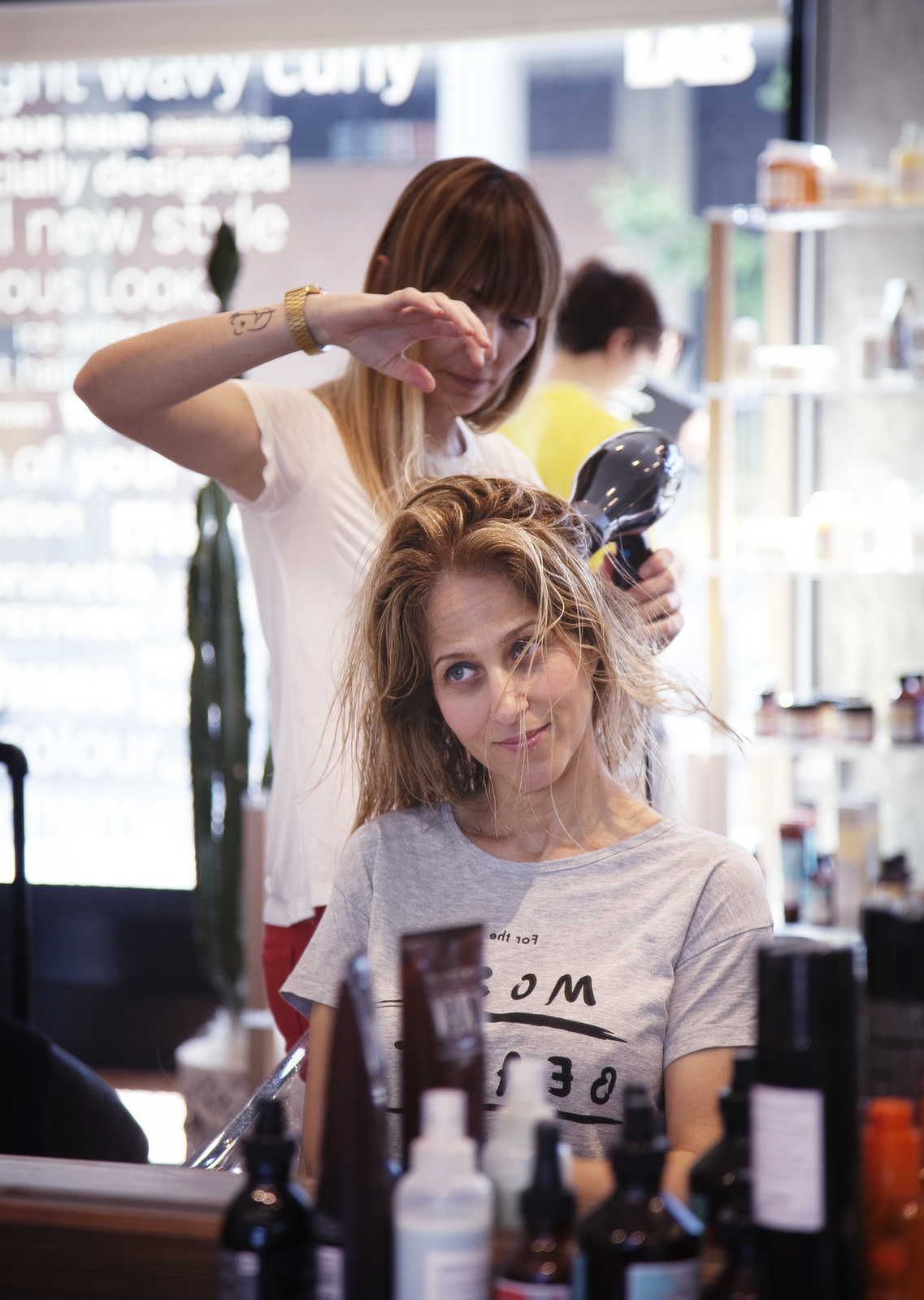 labstaff (6)Siamo pronti per andare a testa in giù e asciugare i capelli con il phon ad  una velocità lenta che sembro io nella corsia dei tir sull’A14 e  ad una distanza di almeno 40 cm, quella di sicurezza.  Non usiamo spazzole, solo le mani in caso di necessità per evitare che il sebo delle stesse assorba il prodotto prebrushing. Dopo che il capello è completamente asciutto, l’unica manipolazione meccanica che concedo è la piastra, una volta ogni 10 giorni che mi permette di creare le famose onde.