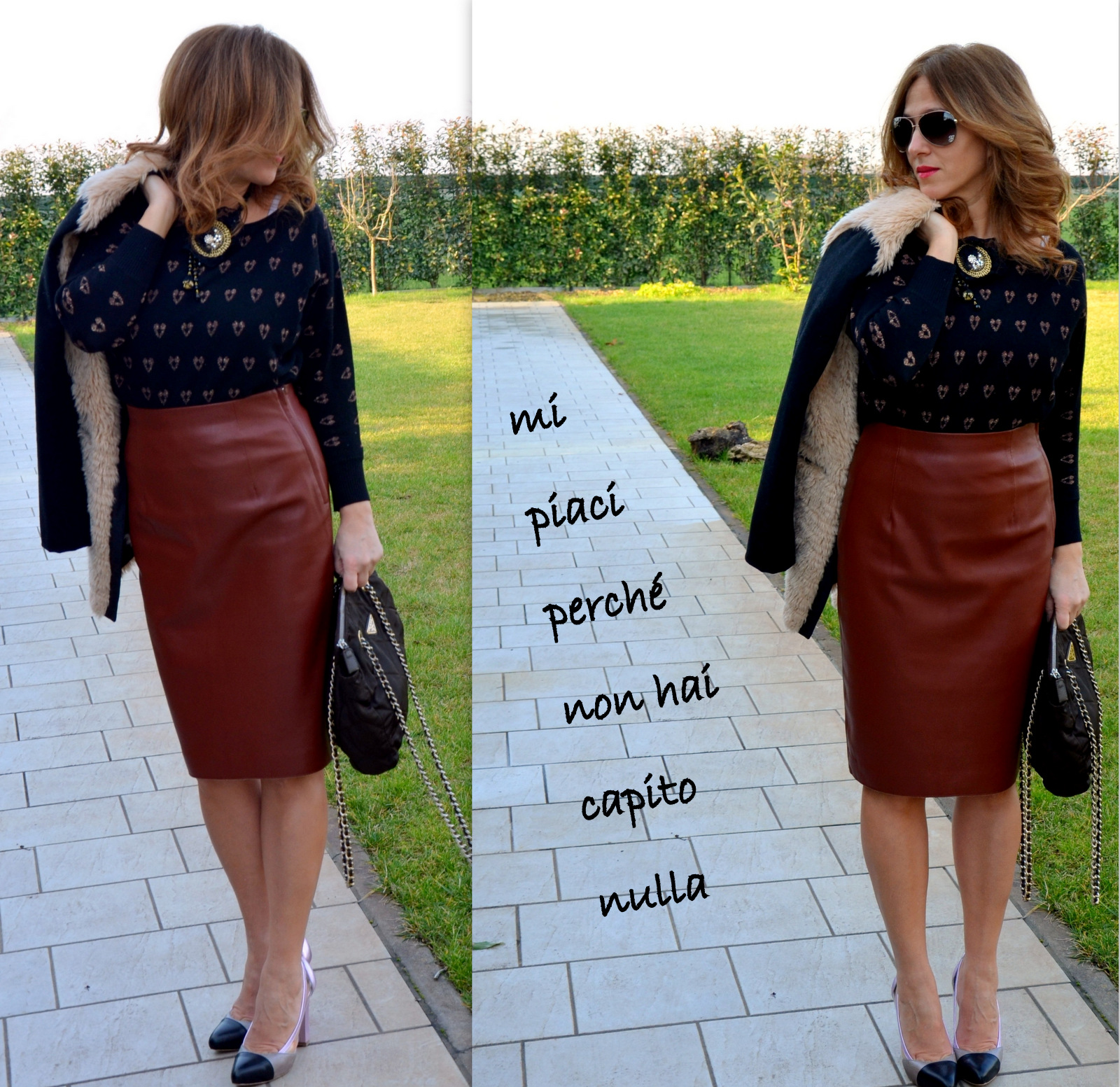 La gonna marrone in eco pelle di questo outfit l’ho presa in saldo da Zara per 19 euro appunto, mentre il micropull nero con i cuoricini in lurex è di Marella acquistata con il 40% in saldo. Il cappottino in ecopelliccia (l’avete già visto qui e qui) è di Naf (brand al quale sono ormai abbonata) preso in saldo l’anno scorso! La borsa è vecchissima ormai un capo vintage di Prada.