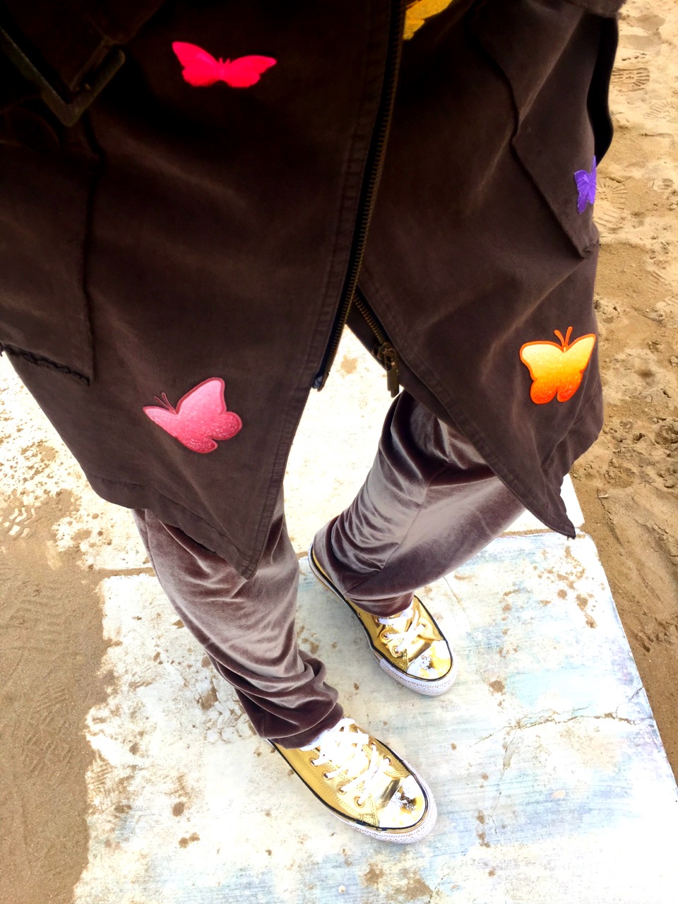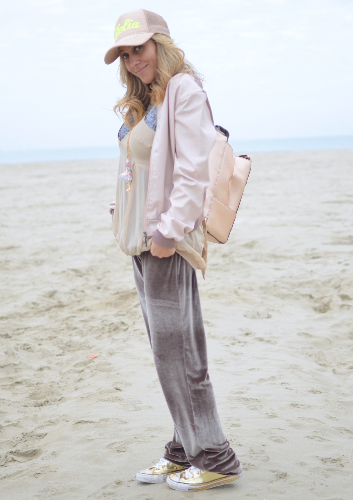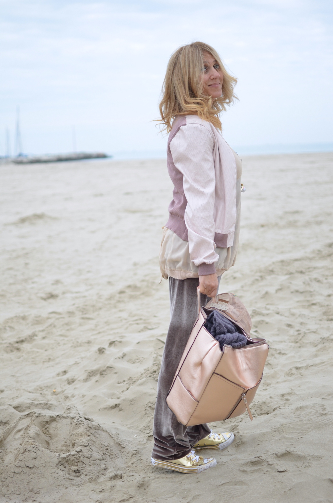 Quindi vi dicevo che sto per andare al mare con un nuovo paio di converse gold limited edition. Le ho abbinate ad un paio di pantaloni palazzo in velluto dal color fango, un layering di canotte di paiellettes e tulle nelle tonalità del grigio e della sabbia, un bomberino in ecopelle rosa laserizzato, un trench con farfalle, zainetto rosa gold. Il tutto per passare inosservata e nascondermi tra i colori di una spiaggia autunnale!