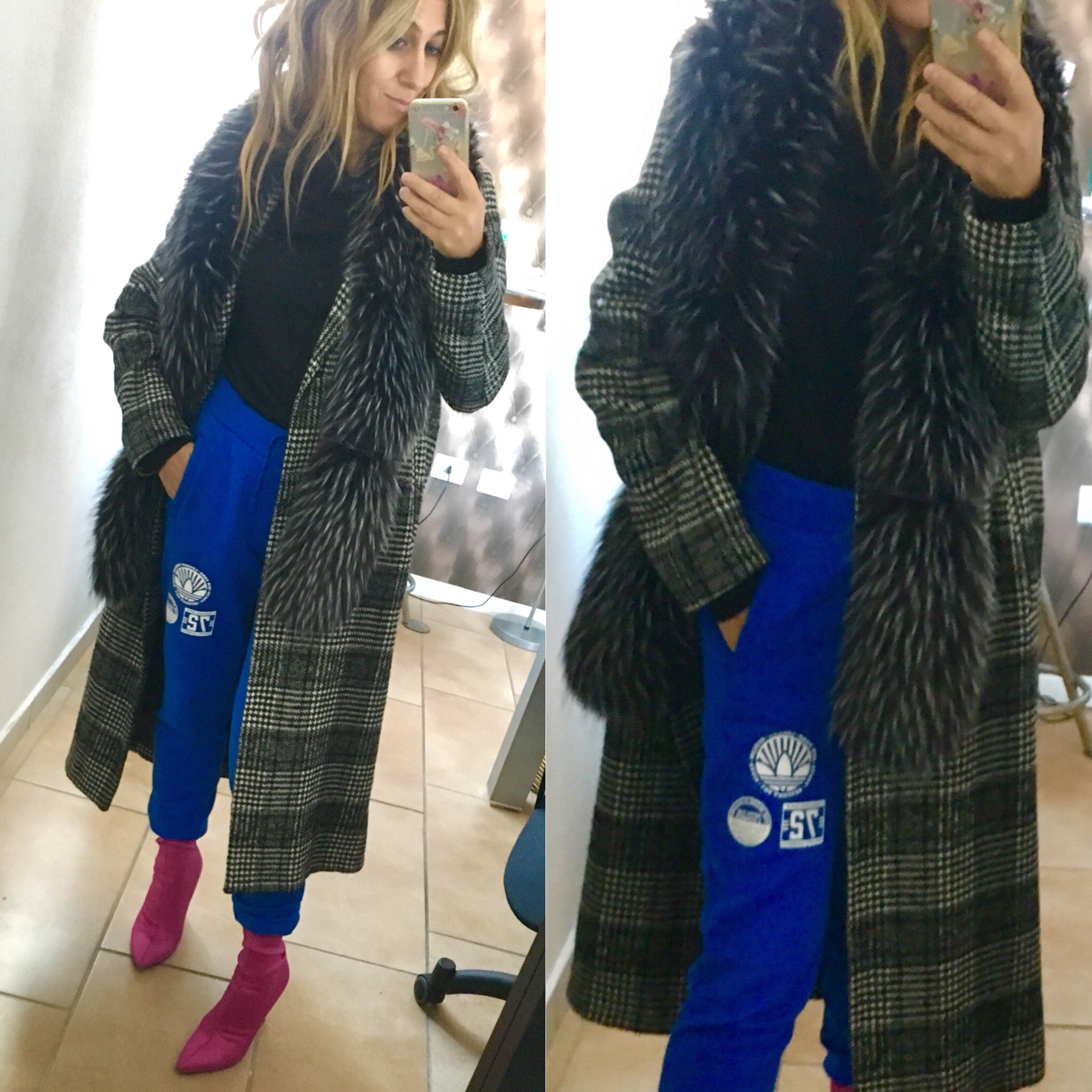 Per restare in tema sportwear con tacchi colorati. Oggi ho abbinato un cappotto a quadri extra long con un collo di pelliccia fake su un pantalone Adidas e un maglioncino nero. Cosa ne pensate? Io adoro i contrasti, soprattutto adoro mixare i capi sportivi con i tacchi.