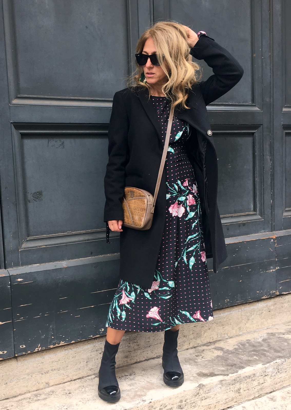 Per finire vi presento un look che, credo di avervi già mostrato, ma mi piaceva questa foto che mi ha scattato mio marito con il suo Iphone a Roma. L’abito è di HM pagato 34 euro. Ogni tanto anche io mi infilo in qualche capo low cost. Questo mi sembrava molto carino e mi piaceva l’effetto che aveva, abbinato con un boots basso e comodissimo per altro.