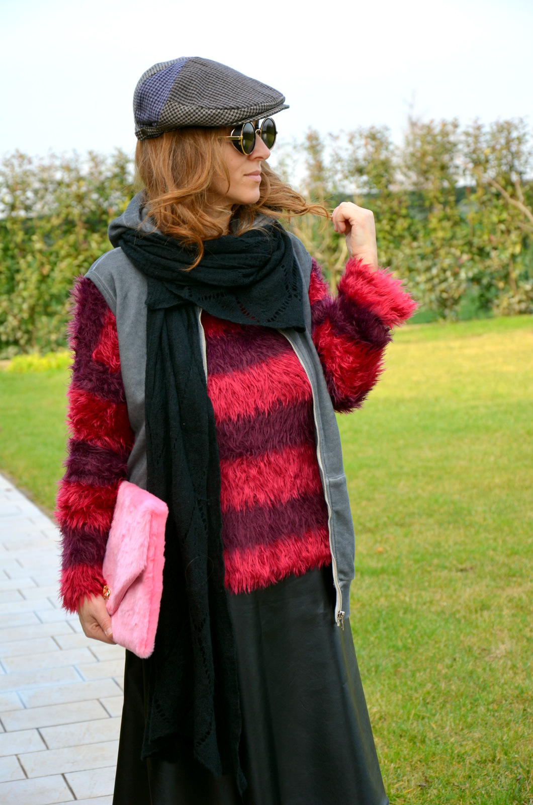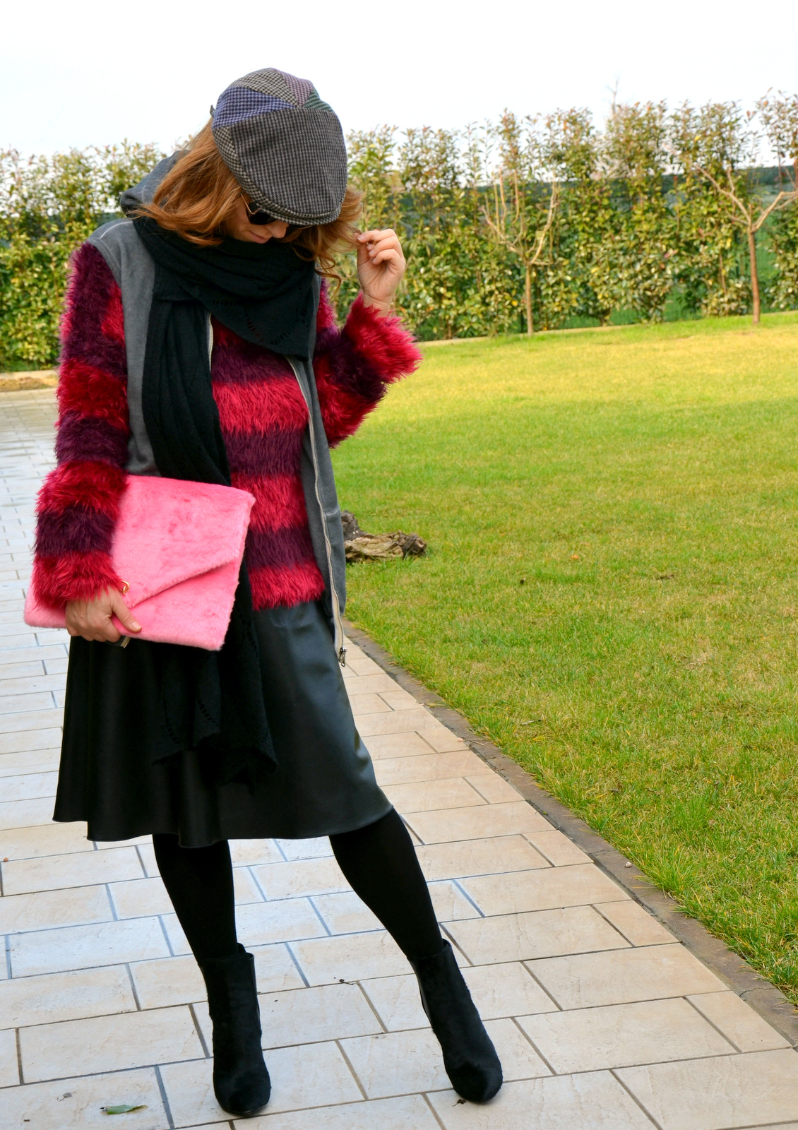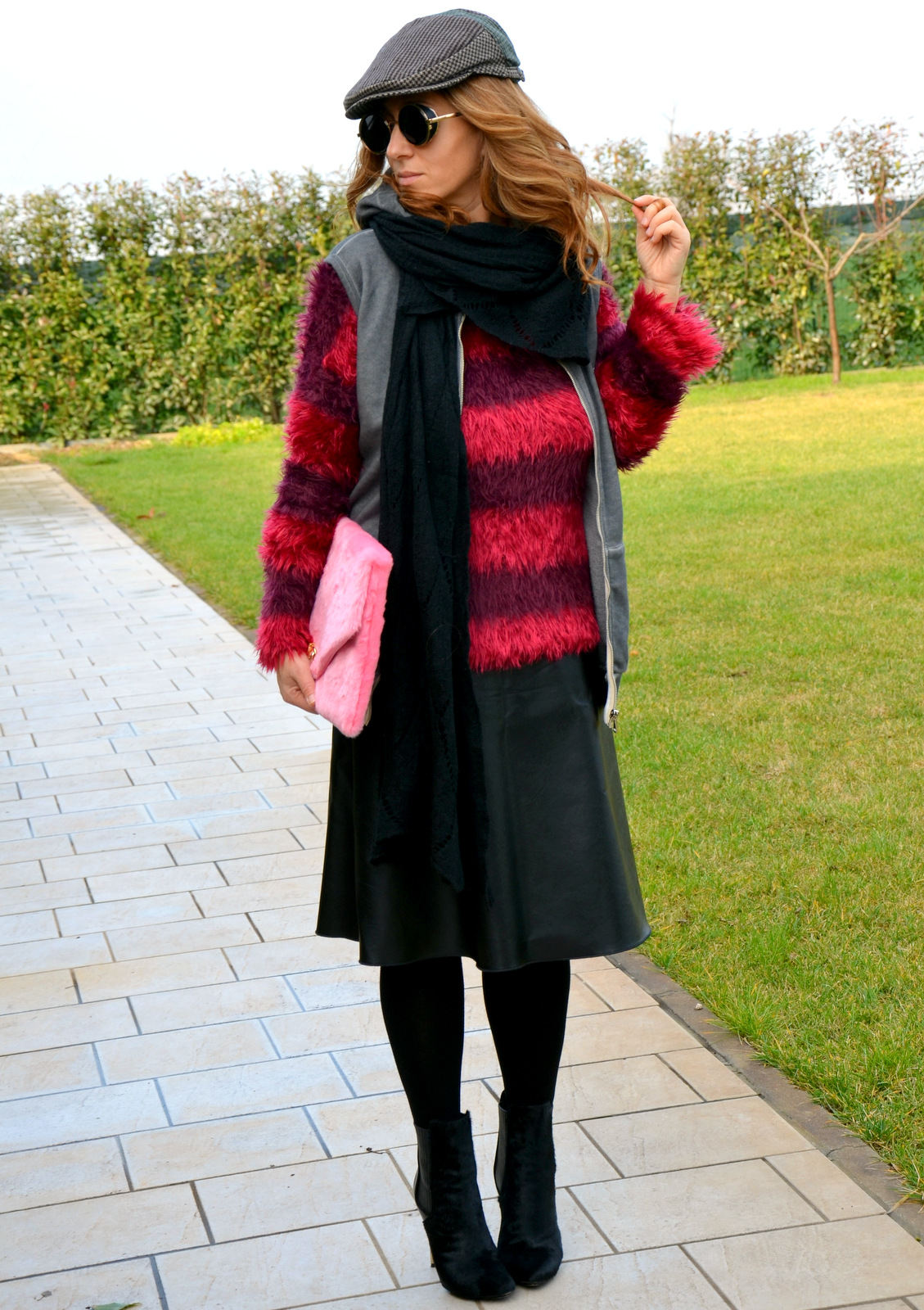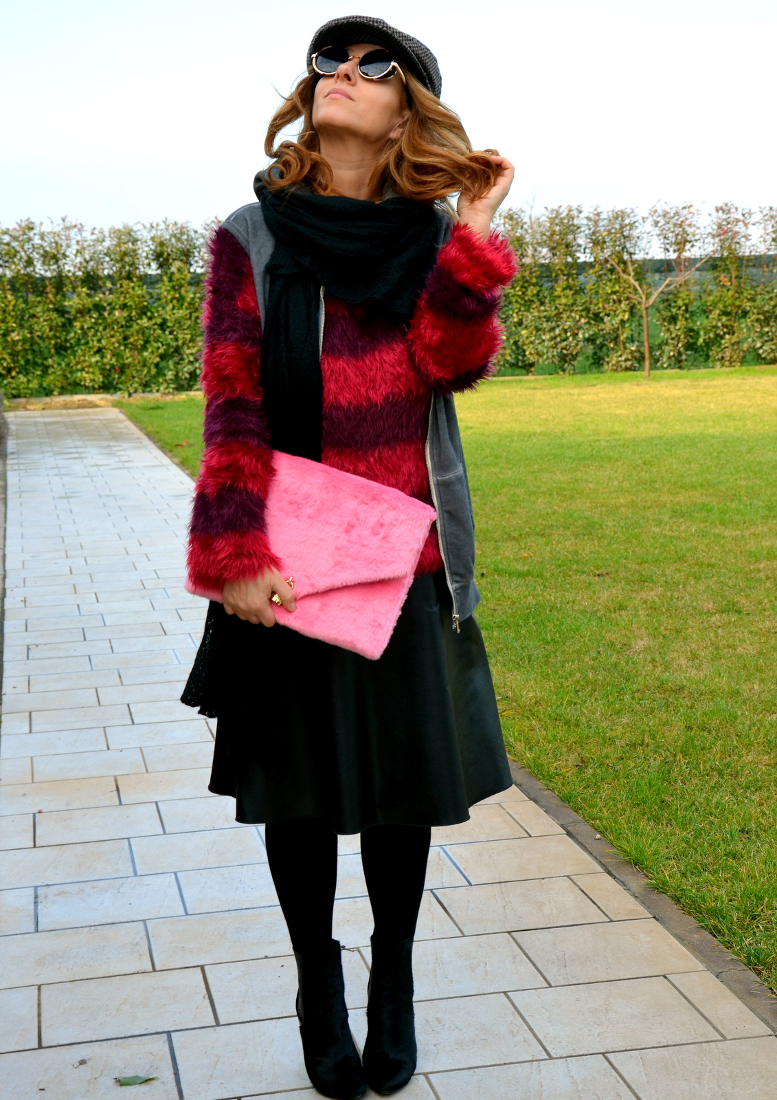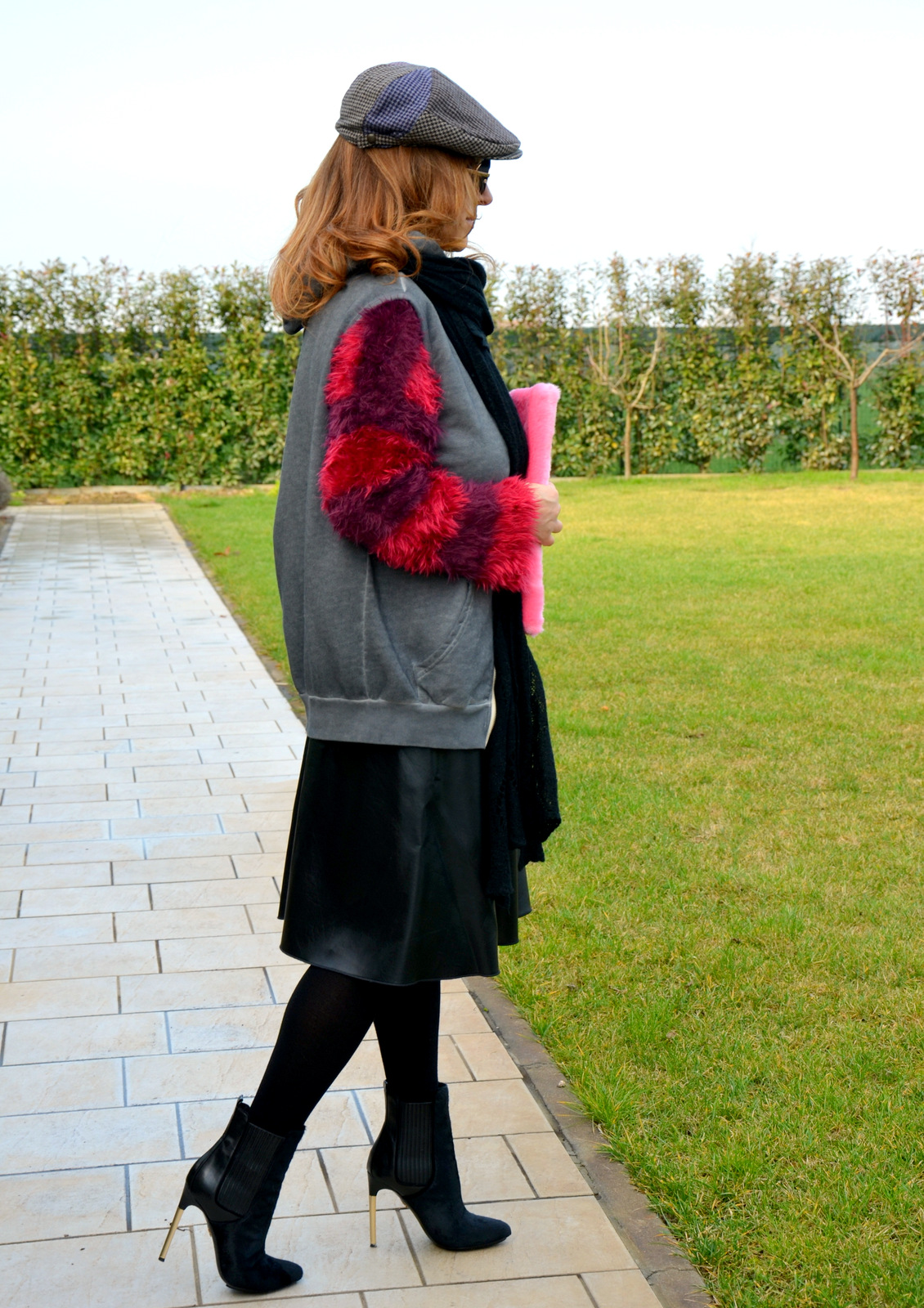 Nel frattempo il mio outfit di oggi è all’insegna della coppola e dello pseudo minimalismo quasi pulito. Colorato con i tocchi di rosso del maglione pelosetto come la mia clutch, sopra una gonna, vita alta in ecopelle di Marella acquistata in saldo. Per finire la mia adorabile felpa con cappuccio che mi mette allegria e mi ringiovanisce lo spirito! I tronchetti sono splendidi! Non trovate?