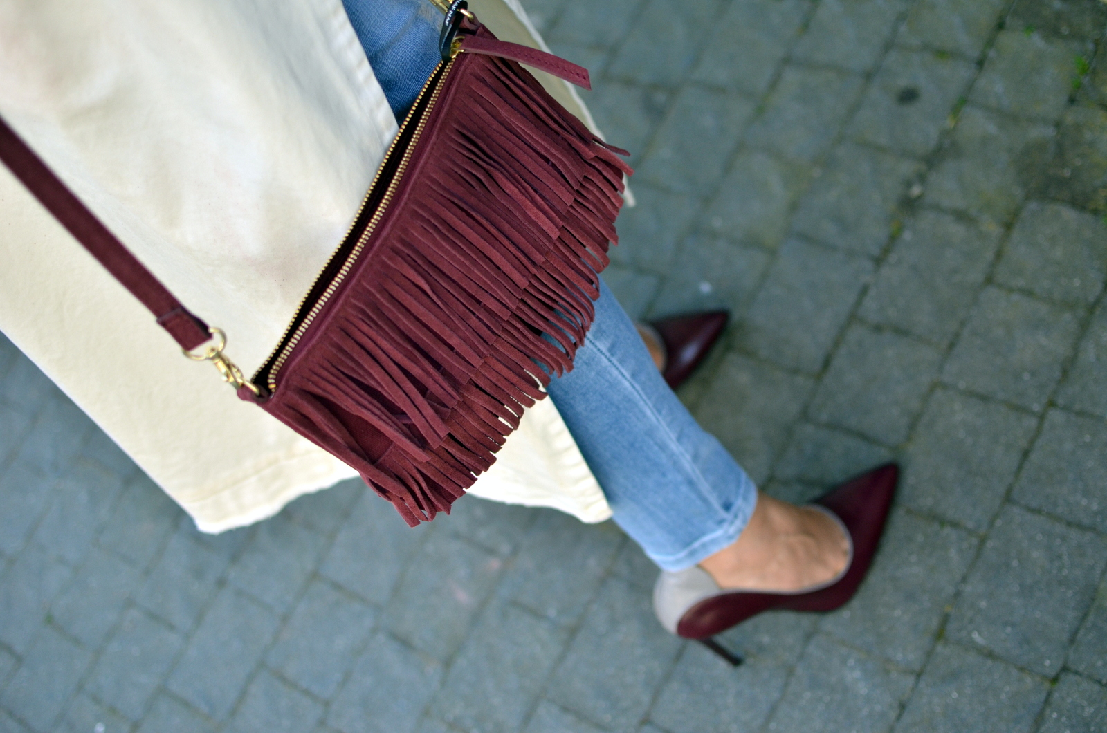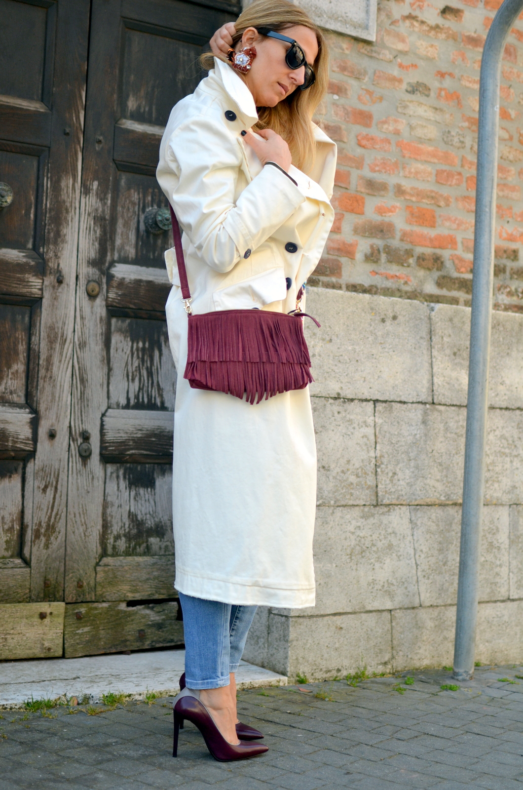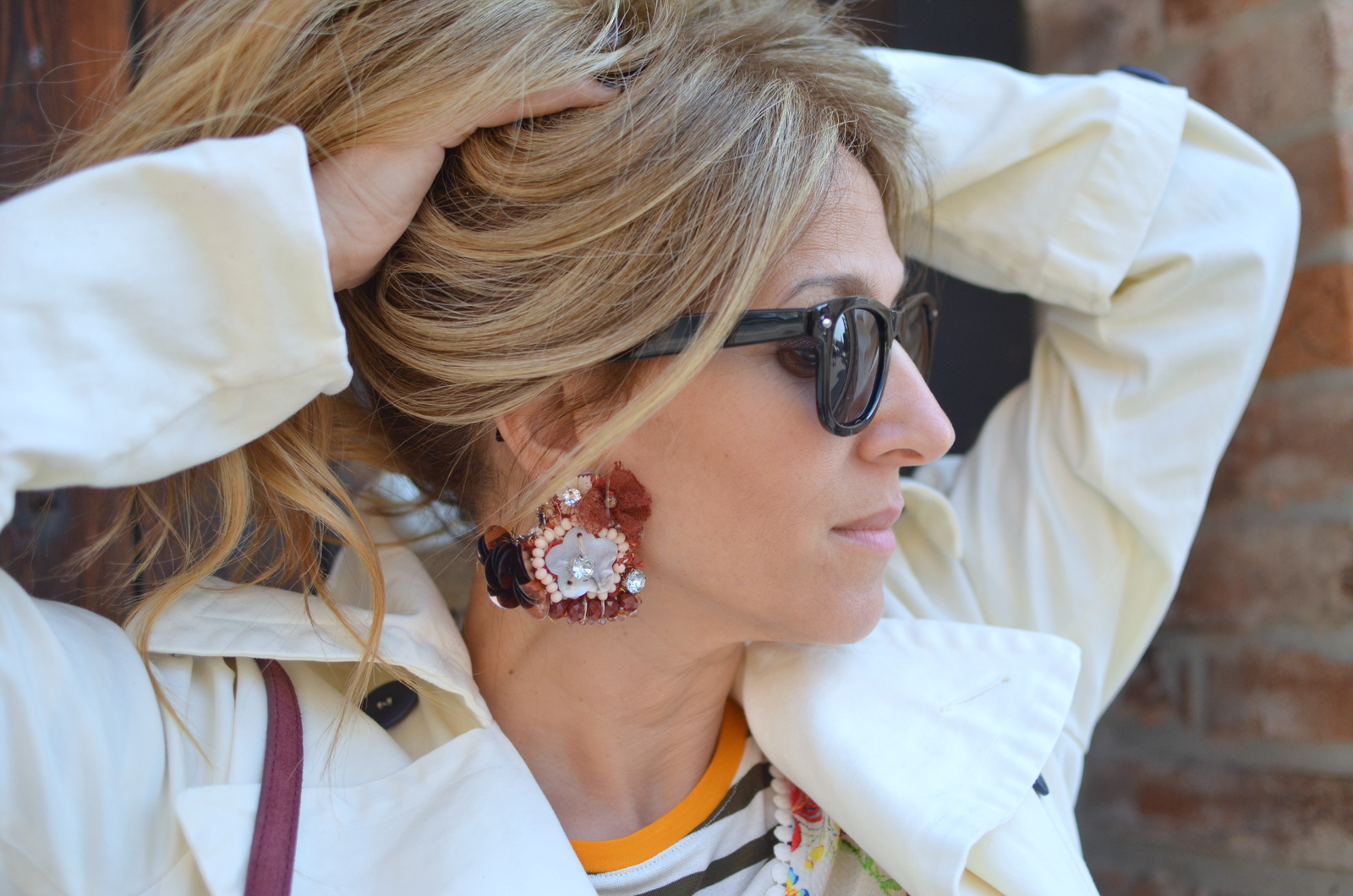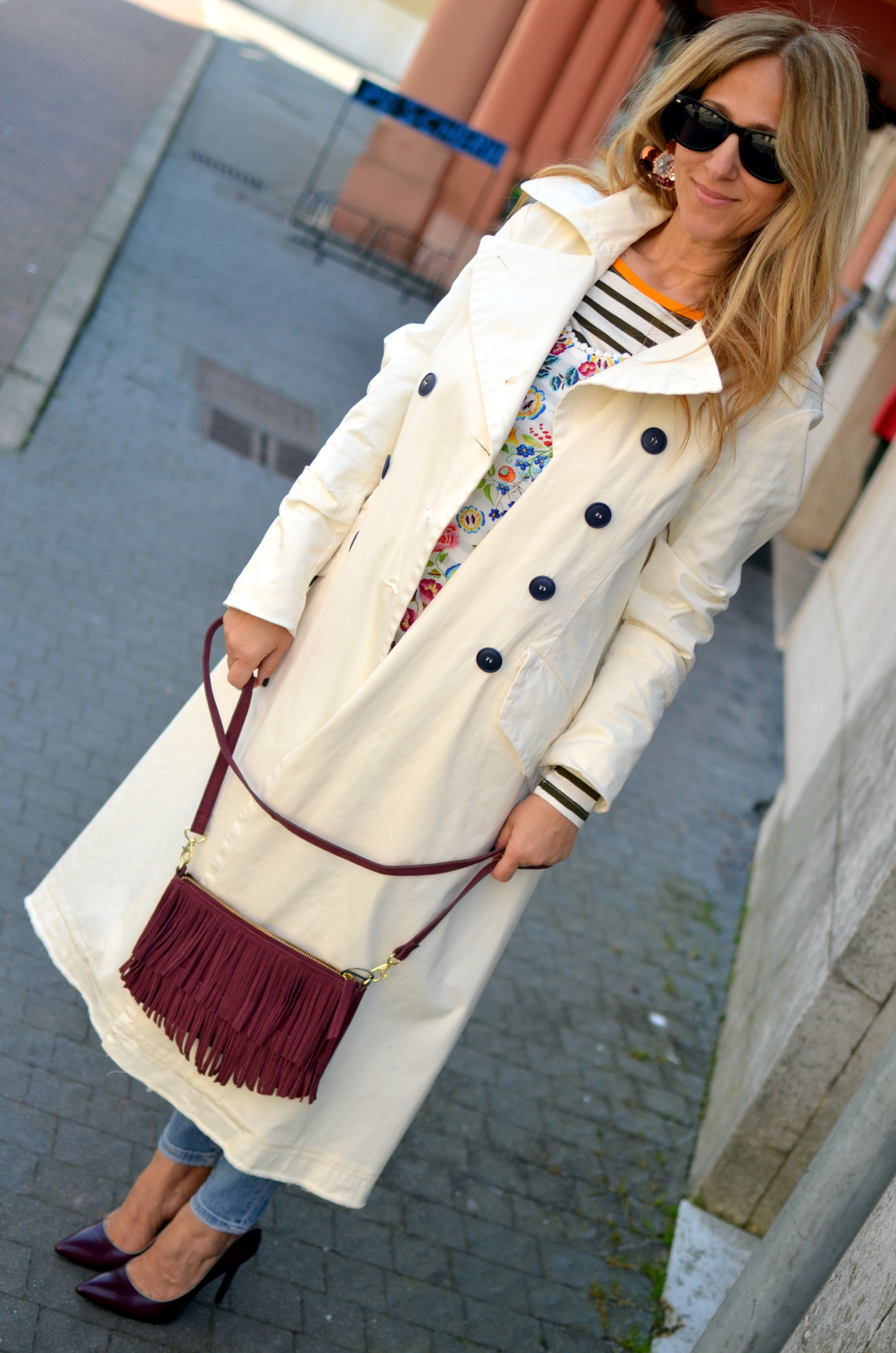 Oggi in passerella: trench in tessuto di cotone light delave Liviana Conti; denim stretch Naf Naf; layering di righe e fiori Naf Naf; tacco 12 Della Paolini; Mini Tracolla Squaw Naf Naf; clips di Chiara Fini.