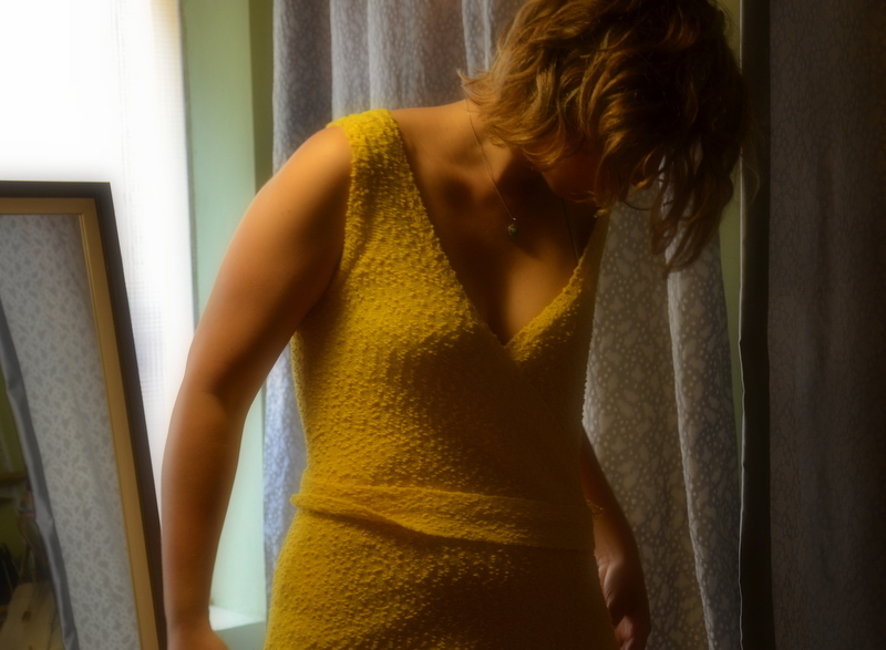 Sotto indossa un sartoriale anni ’60 casacca gialla cotone bouclè con fibbia ottone.