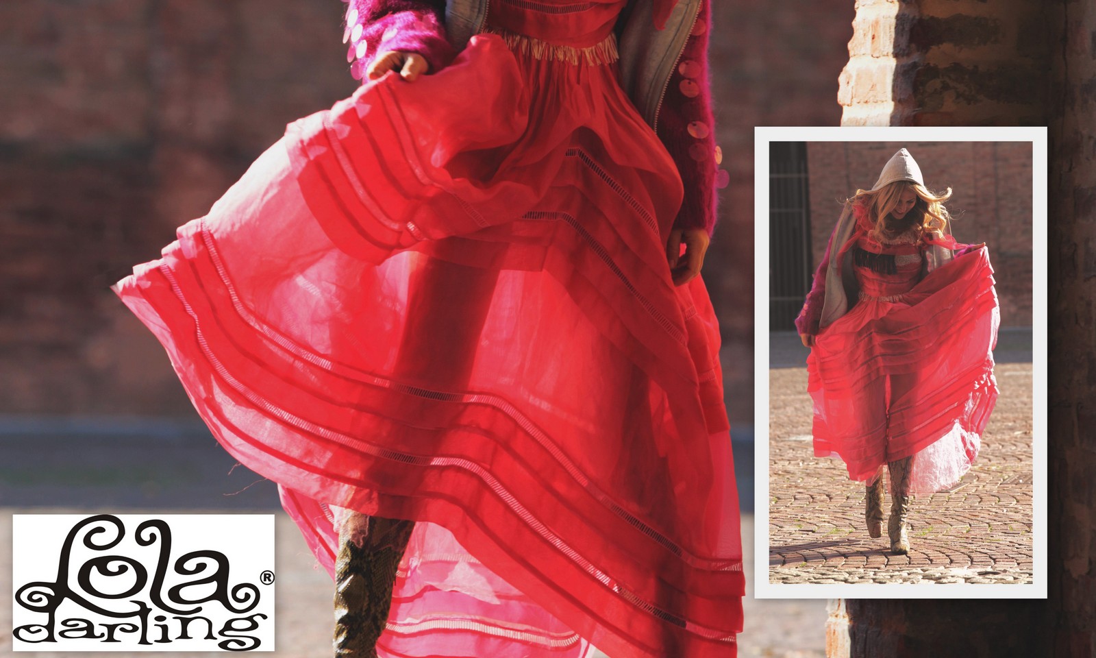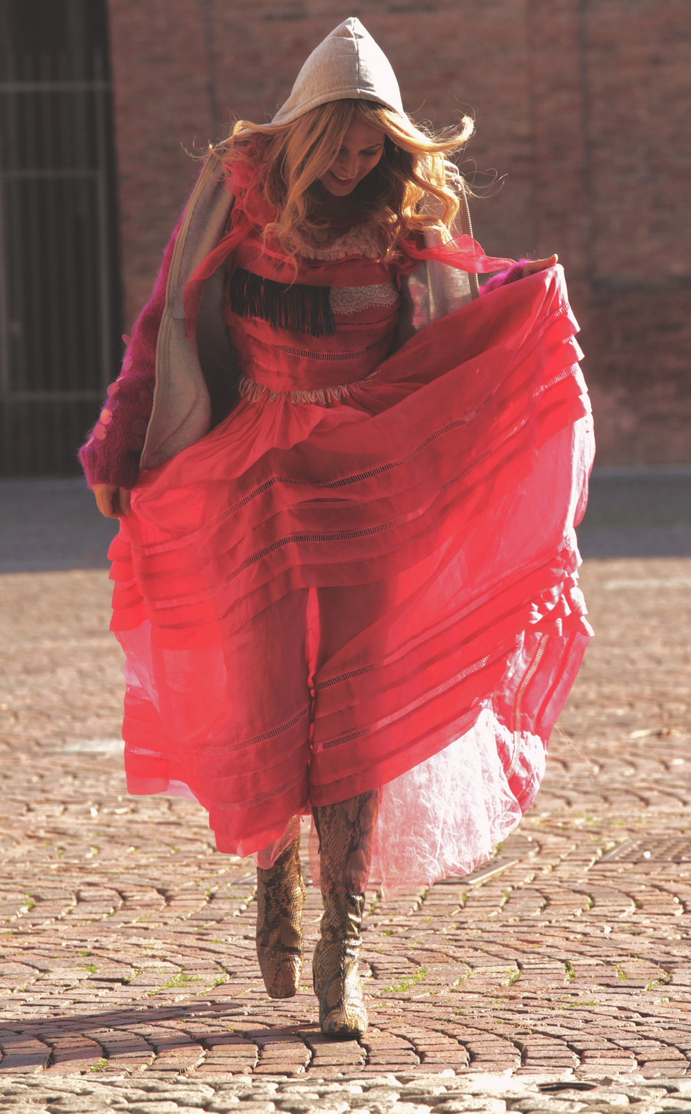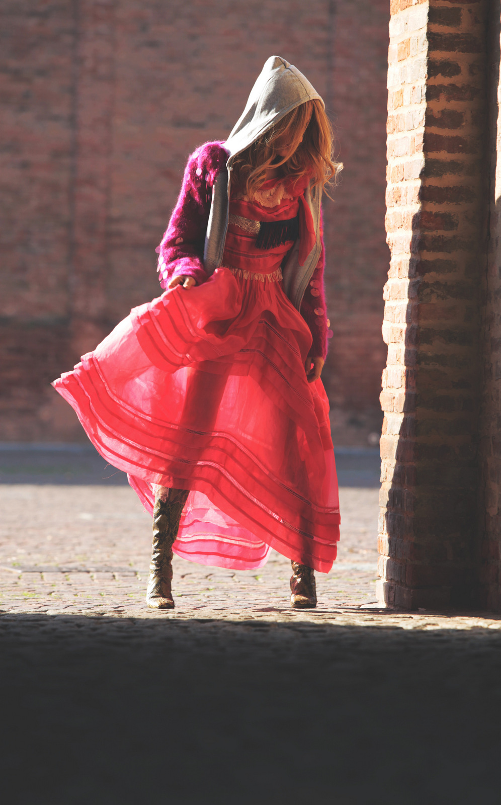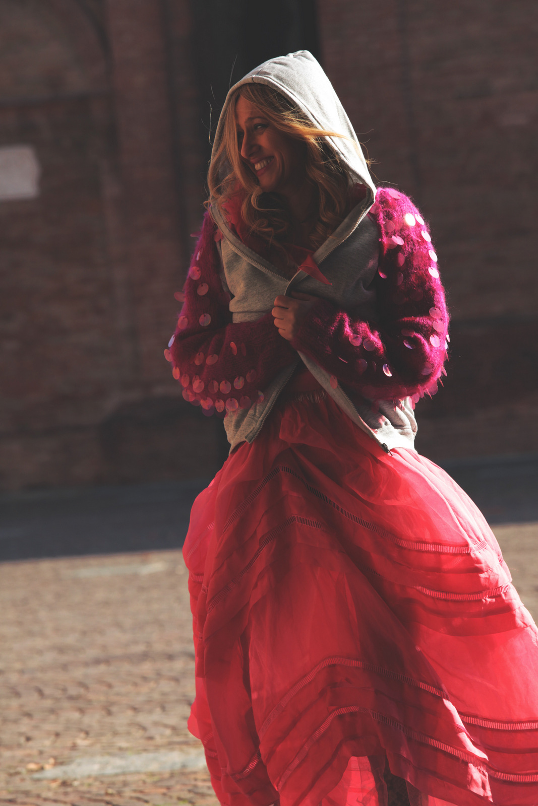Vi sembrerò Cappuccetto Rosso oppure Alice nel paese delle meraviglie. Io direi né l’uno né l’altro. Questa volta nessuna inspiration favoleggiante. Questa sono solo io che, in una fredda mattina di autunno, si è lasciata sorprendere dagli scatti di Niccolo Barone per Loladarling, per le vie di Carpi, in bicicletta.