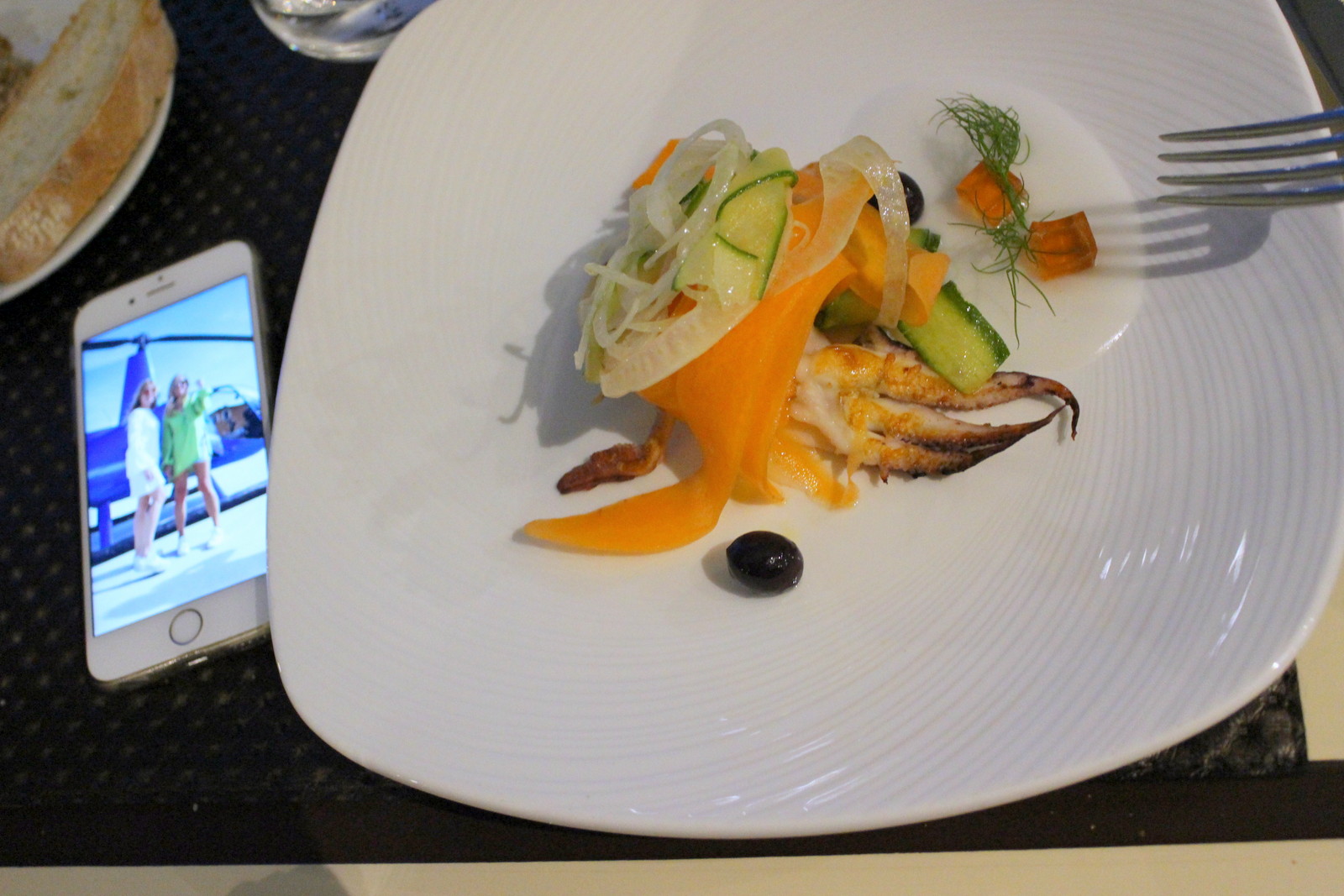 Insalata tiepida di seppie, verdure croccanti, olive di Gaeta, gelatina al Melograno