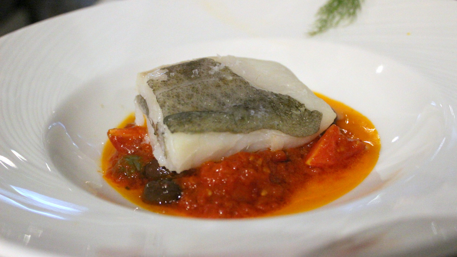 baccala cotto a bassa temperatura, con guazzetto di pomodorini piccadilly, olive di taggia e capperi