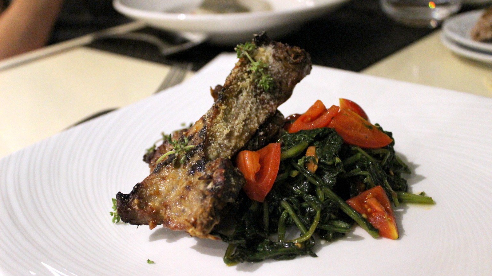 agnello alla scottadito cacio e pepe con cicoria ripassata e pomodorini