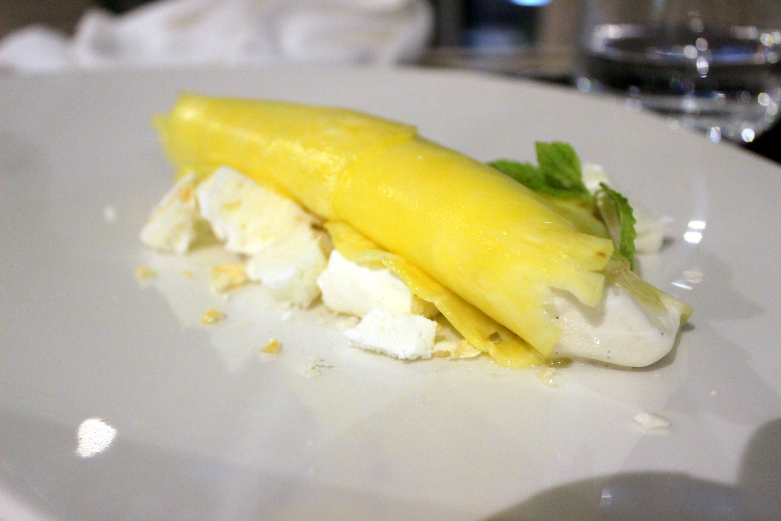 cannolo di ananas, spuma di yogurt e vaniglia con meringhe al limoncello
