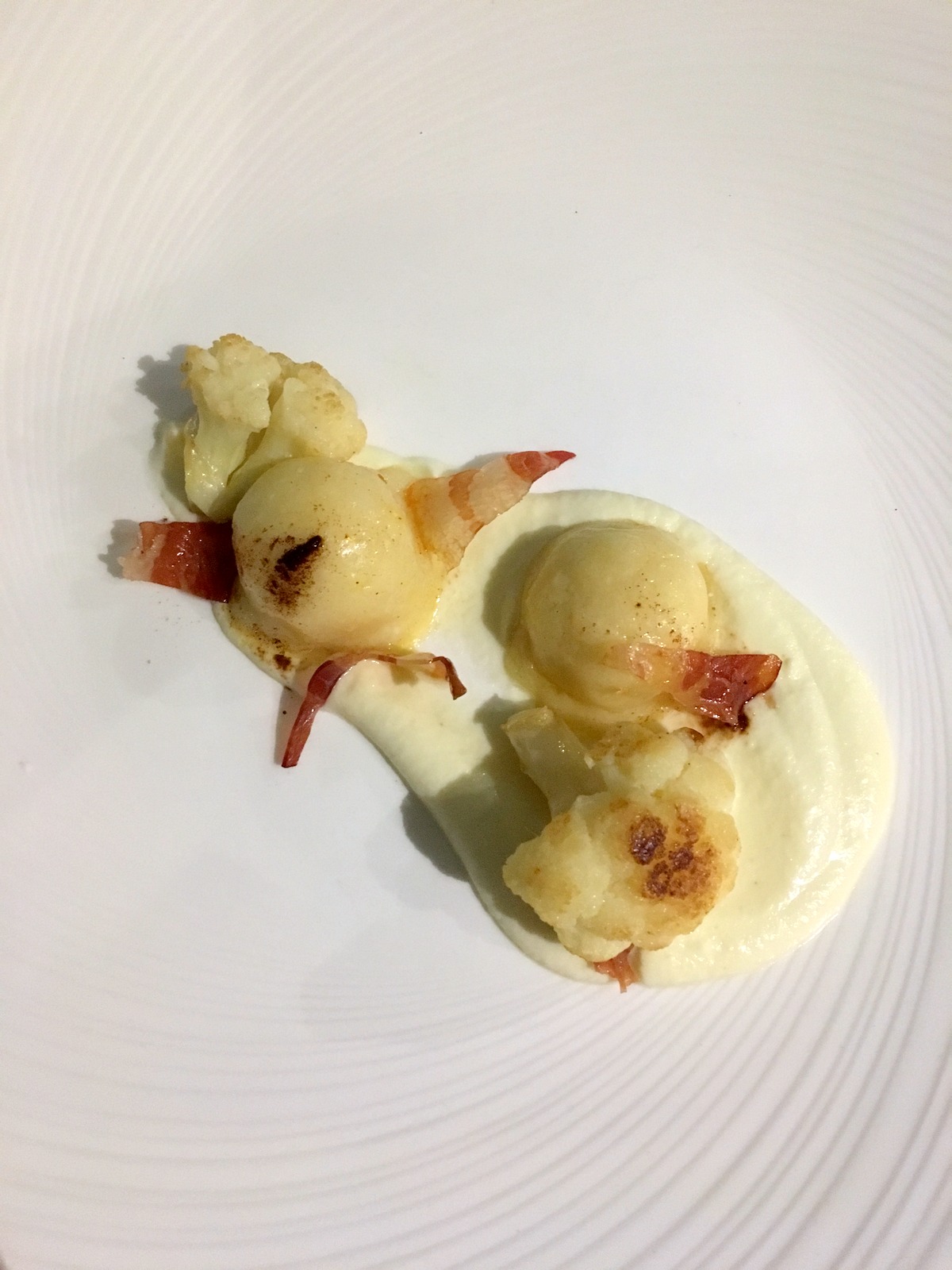 crema di cavolfiore con polpette di caciocavallo, crispy bacon e polvere di liquirizia