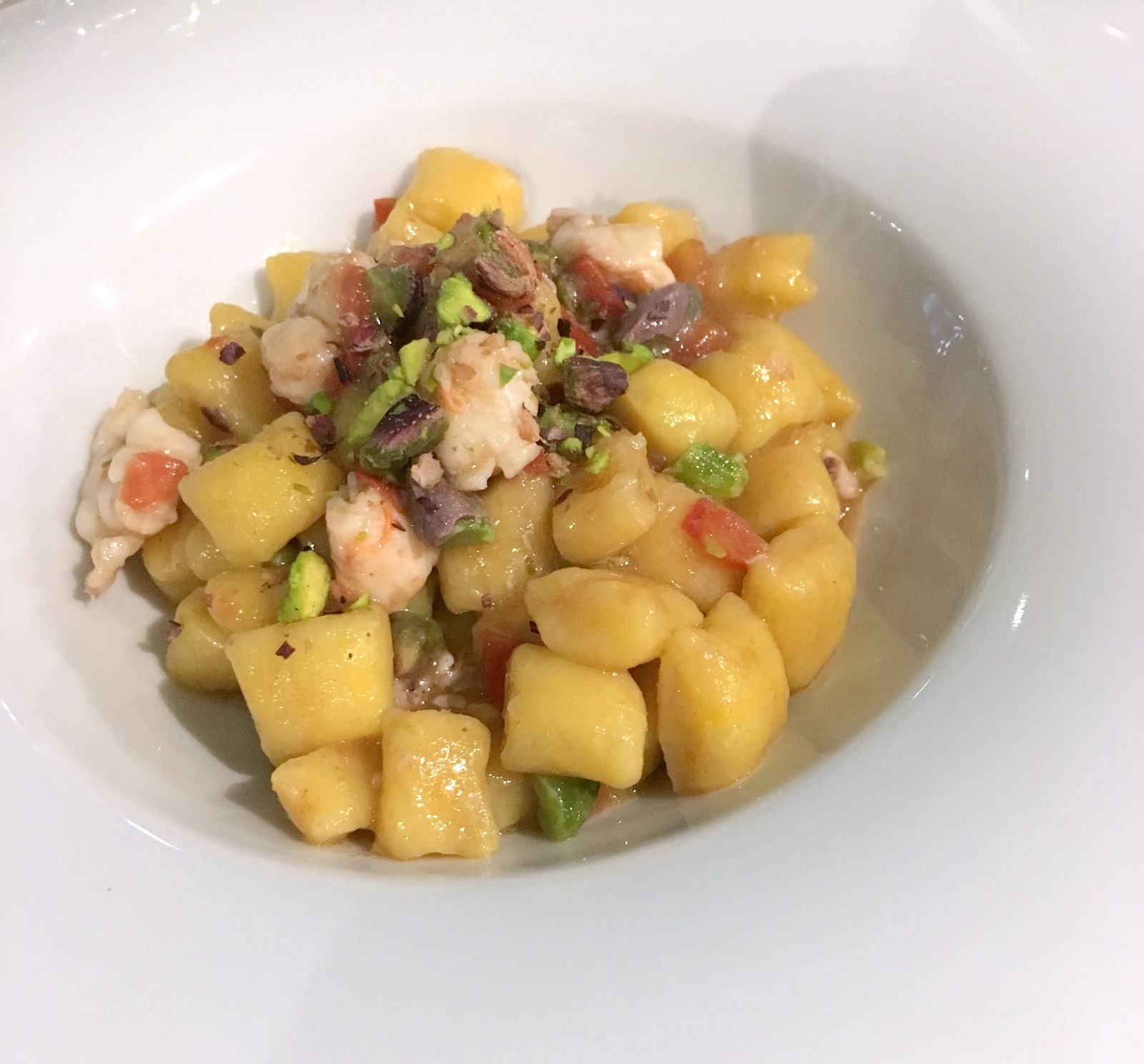 gnocchetti fatti in casa con scampi, pistacchi di bronte e concasseè di pomodoro