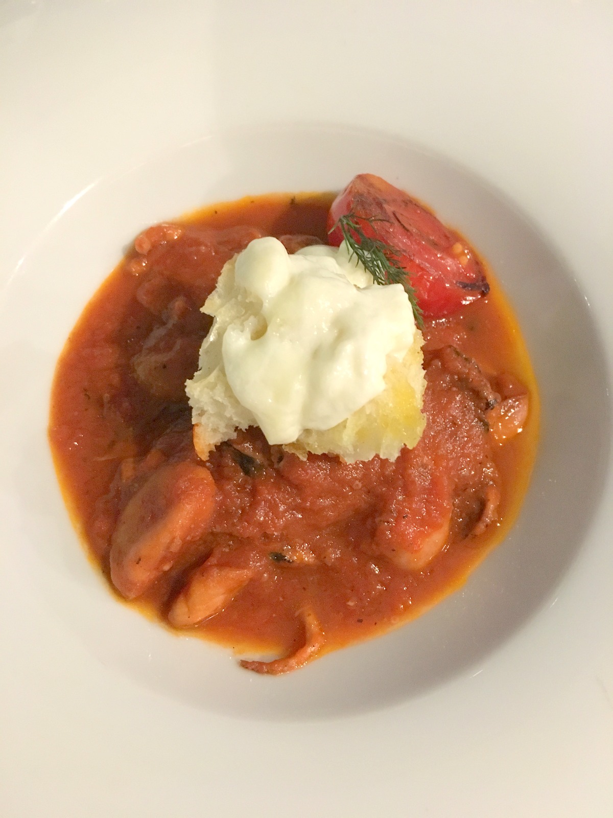 zuppetta di moscardini con piccadilly arrosto, burrata di bufala e crostone di pane alla paprika