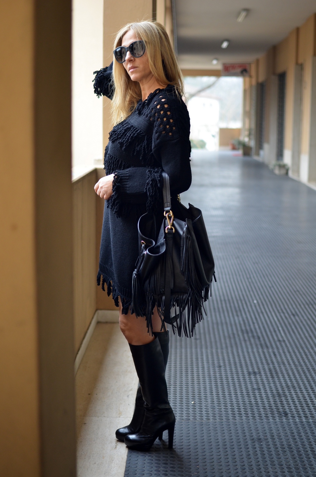 Oggi avevo voglia di sentirmi randagia e solitaria. Ho preso un mini abito o maxi pull che dir si voglia…completamente lavorato in lana merinos con applicazioni di frange sparse. Nero tra i non colori che uso raramente. Uno stivalone da felina selvaggia e voilà posso trasformarmi in Zorro o D’Artagnan in un batter d’occhio.