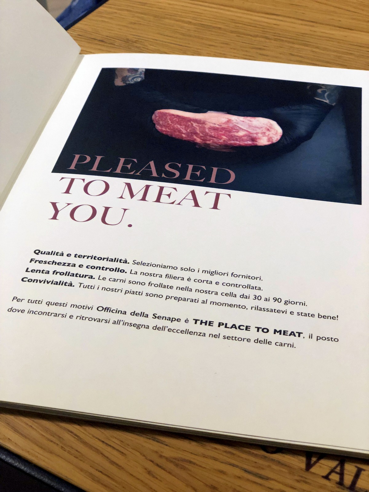 Tra le varie informazioni che ho appreso, c’è la frollatura, un procedimento meraviglioso che contribuisce a rendere la carne più morbida saporita e profumata. Da Officina della Senape, la carne viene messa in una cella frigorifera costruita ad hoc. Poi viene opportunamente controllata e lasciata qui per diversi mesi in base al risultato che si vuole ottenere! Ma questa è una filosofia che va studiata, utilizzata e servita, solo da esperti come il team di Officina della Senape.