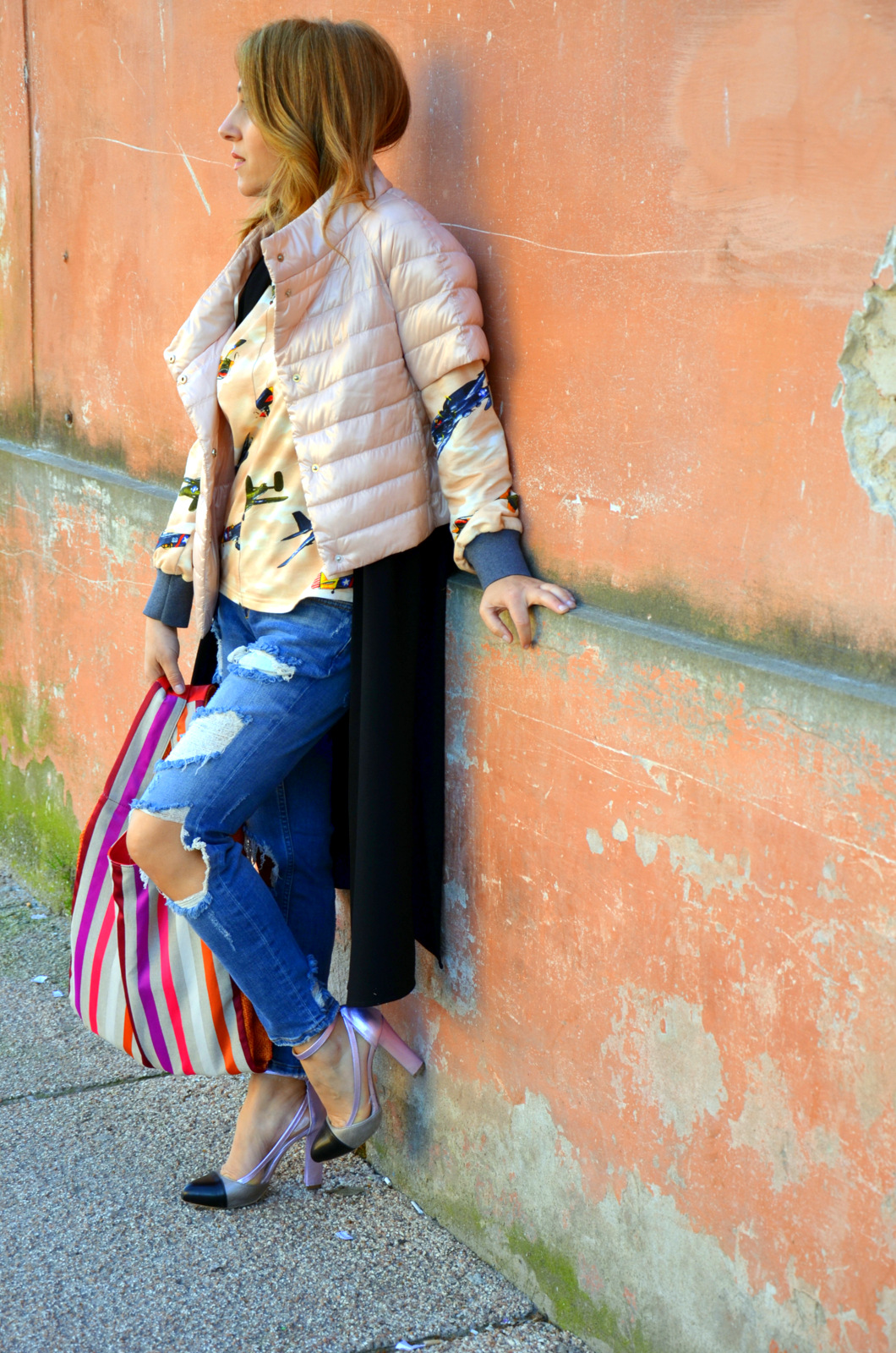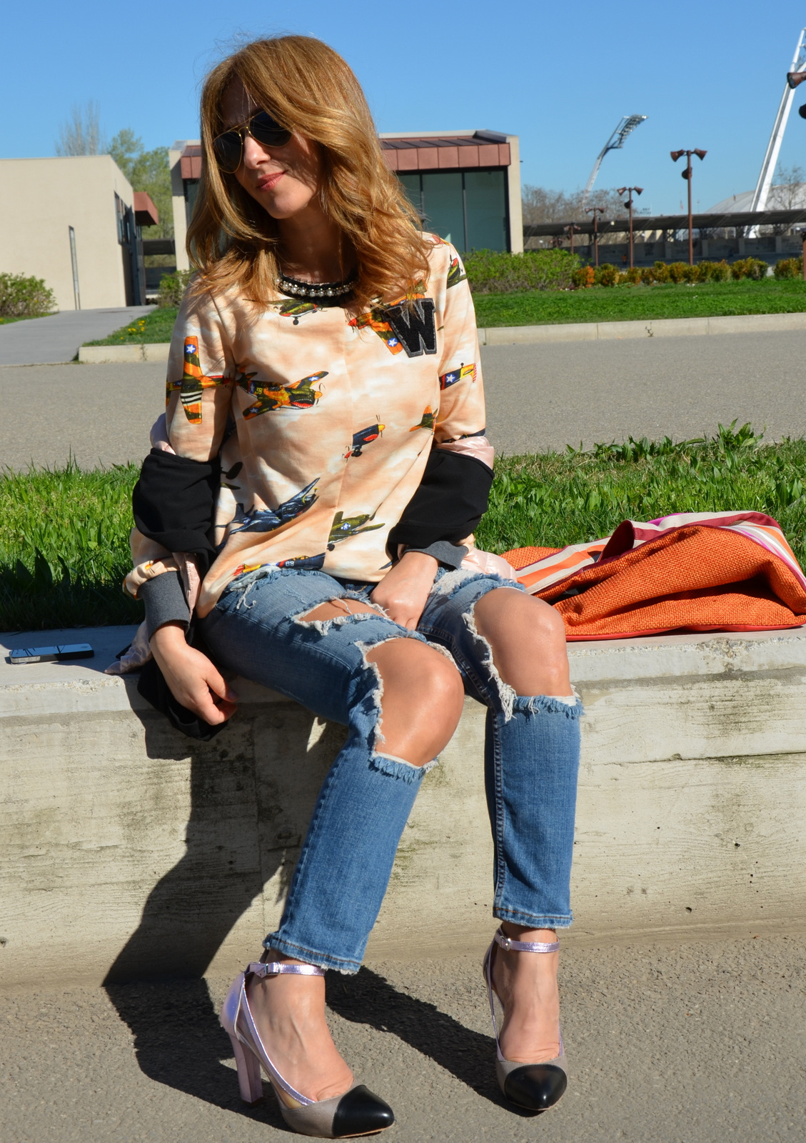 Disabbinateli, se volete! Oggi vi presento la felpa abbinata ad un denim iper strappato e a tacchi dalle colorazioni laminate per massimizzare l’effetto femminile.