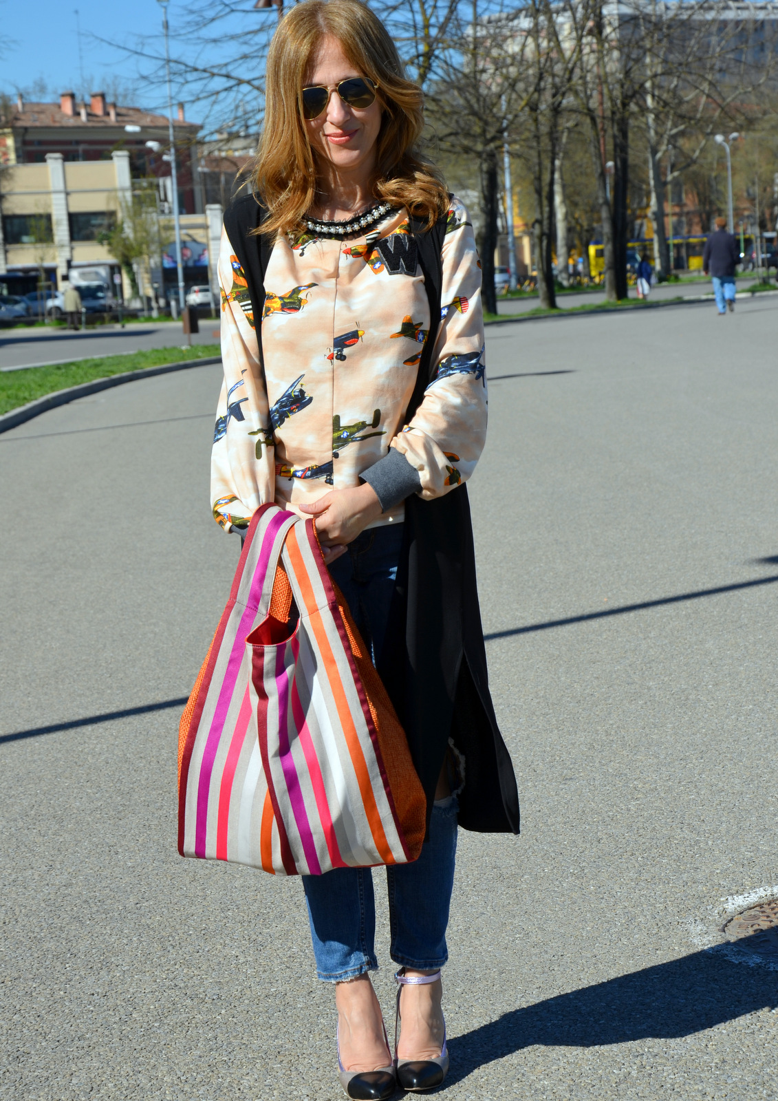 Un look giovanile e frizzante, molto bella la borsa, con i suoi vivaci colori
