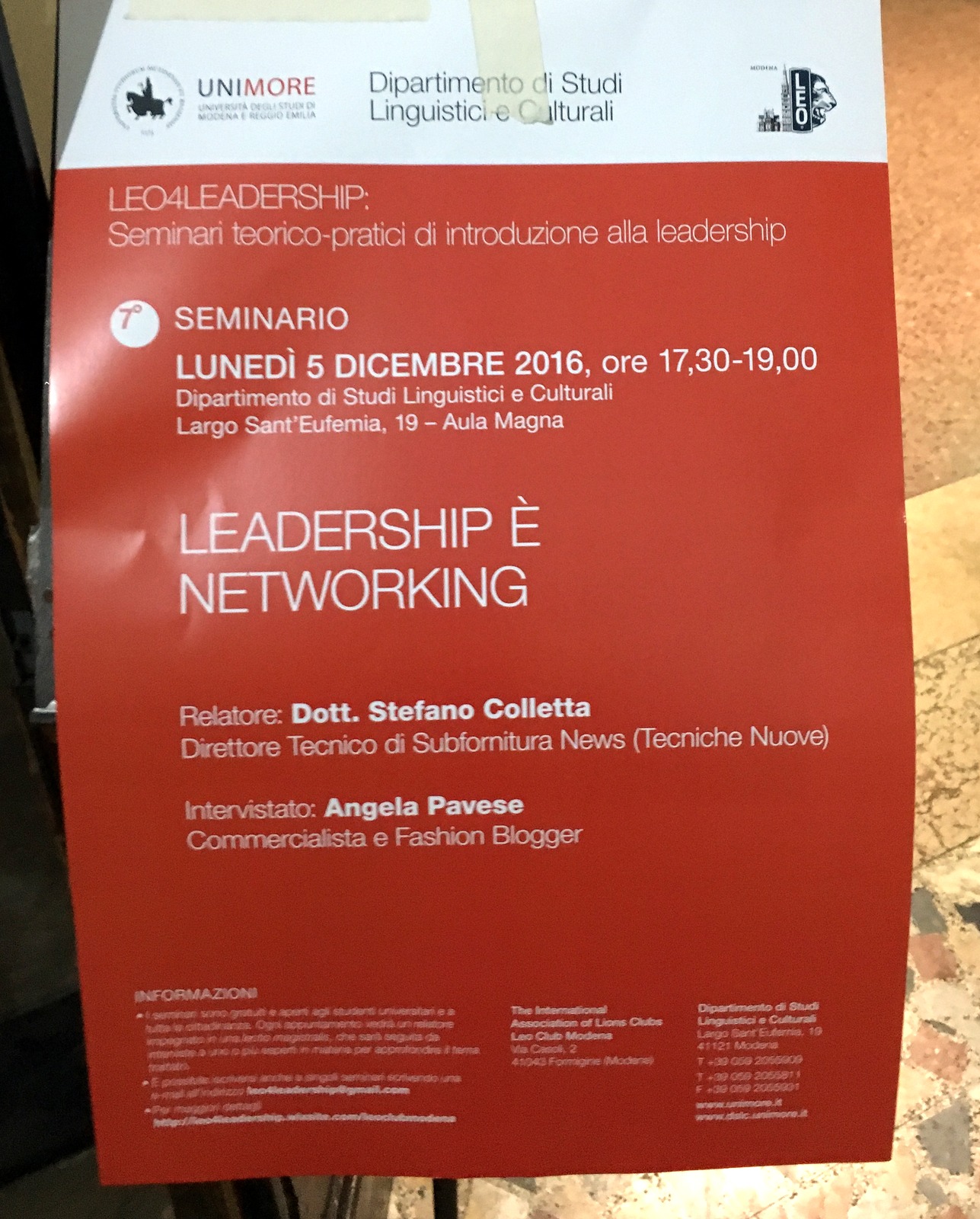 Il Dipartimento è quello di Studi Linguistici e Culturali dell’Università di Modena che con il Leo Club Modena mi ha invitata in qualità di relatrice e intervistata il 5 Dicembre 2016 in AULA MAGNA in Corso Sant’Eufemia 19 dalle ore 17.30 alle 19.00 per trattare il tema del Networking on e off line. La mia relazione potete visionarla nel mio post del 5 dicembre. Insieme a me il dottor Stefano Colletta che ha affrontato le seguenti tematiche: la figura del leader e le sue caratteristiche; la gestione delle persone, delle aziende, dei progetti internazionali; il leader come gestore del gruppo, attraverso il lavoro di networking.